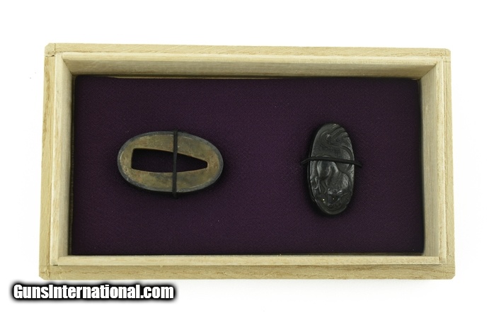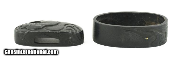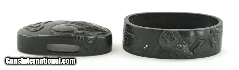 Description: Kinko Fuchi Kashira. Shakudo stone ground. Theme of shakudo horses with gold eyes near stream. Excellent work. Unsigned. Boxed. SOLD |