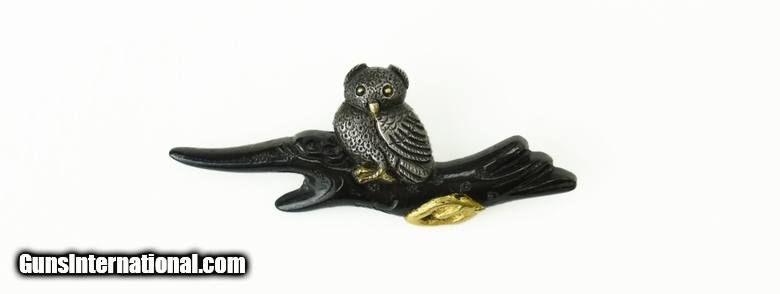 Kinko Menuki. Shakudo ground. Owl, raven, and chick resting on branches. Gold silver, and shakudo highlights. Inscribed: Yasu Chika.