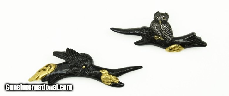 Description: Kinko Menuki. Shakudo ground. Owl, raven, and chick resting on branches. Gold silver, and shakudo highlights. Inscribed: Yasu Chika. SOLD |