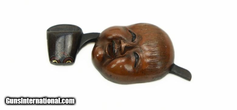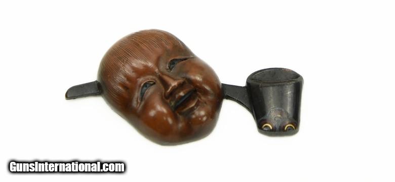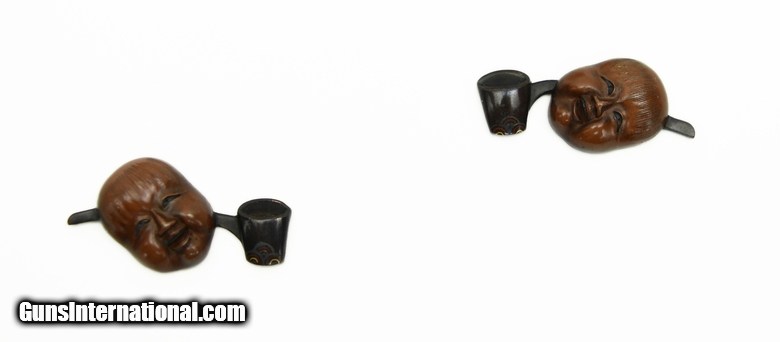 Description: Kinko Menuki. Copper Noh masks with water ladles. Ladles are also exquisitely inlaid in 3 color geometric patterns. SOLD |