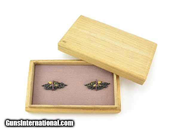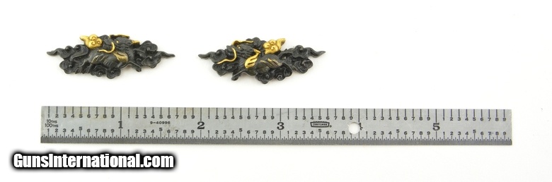 Description: Kinko Menuki. Shakudo dragons amidst swirling waves with gold highlights. Well-formed even borders. SOLD |
