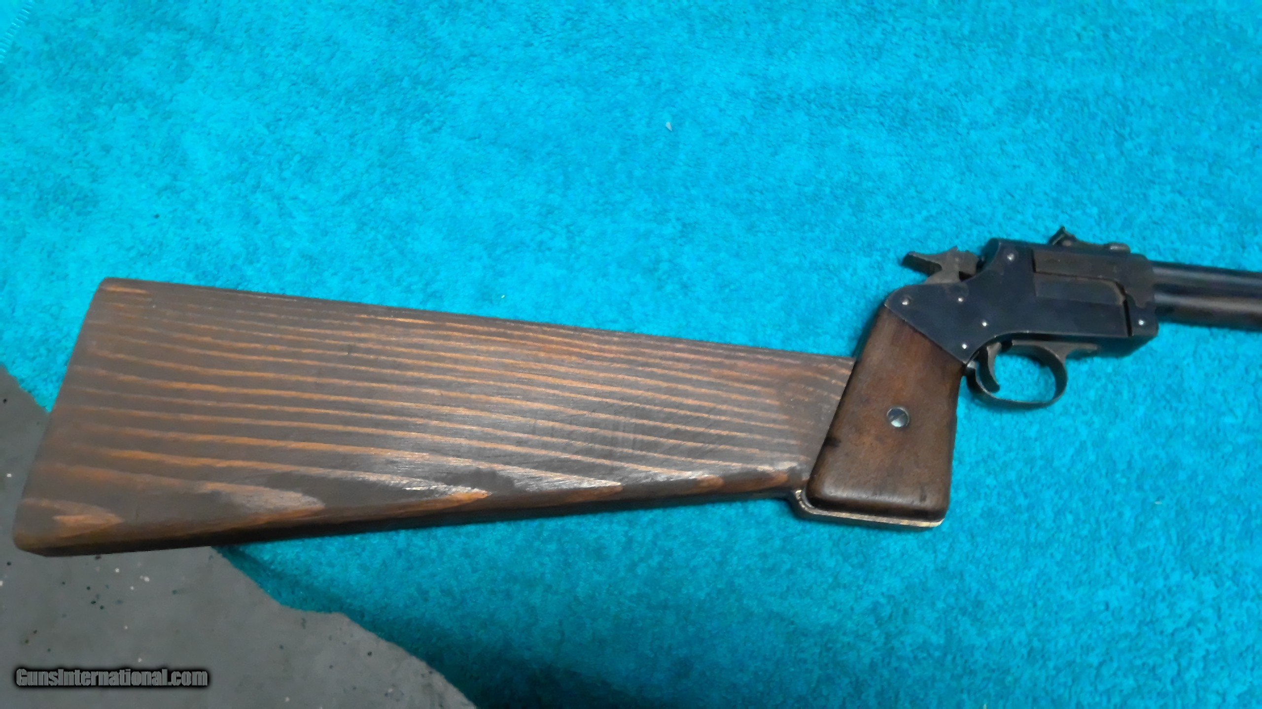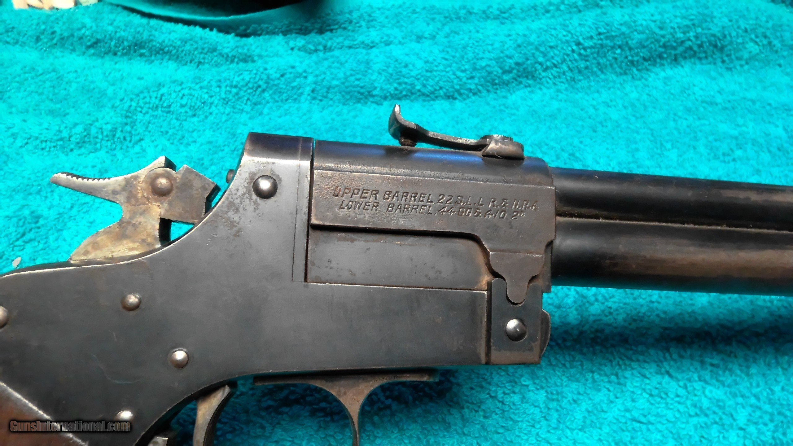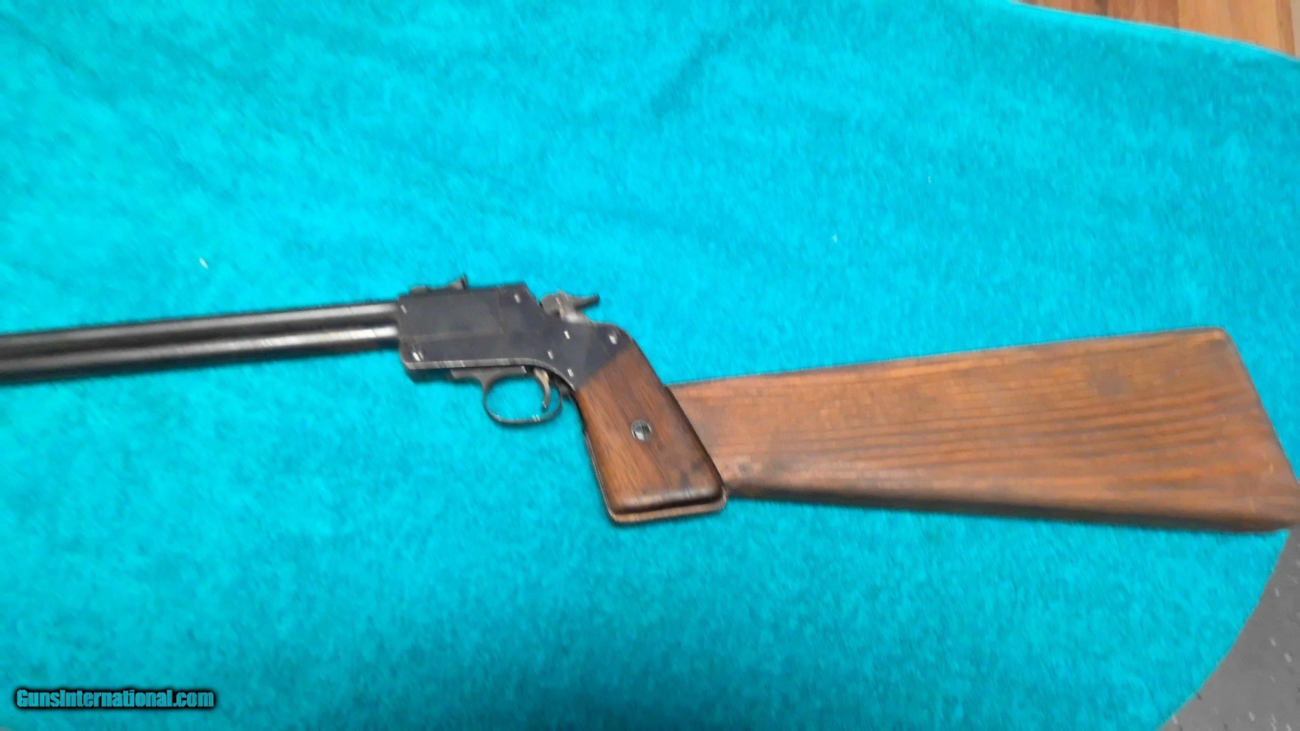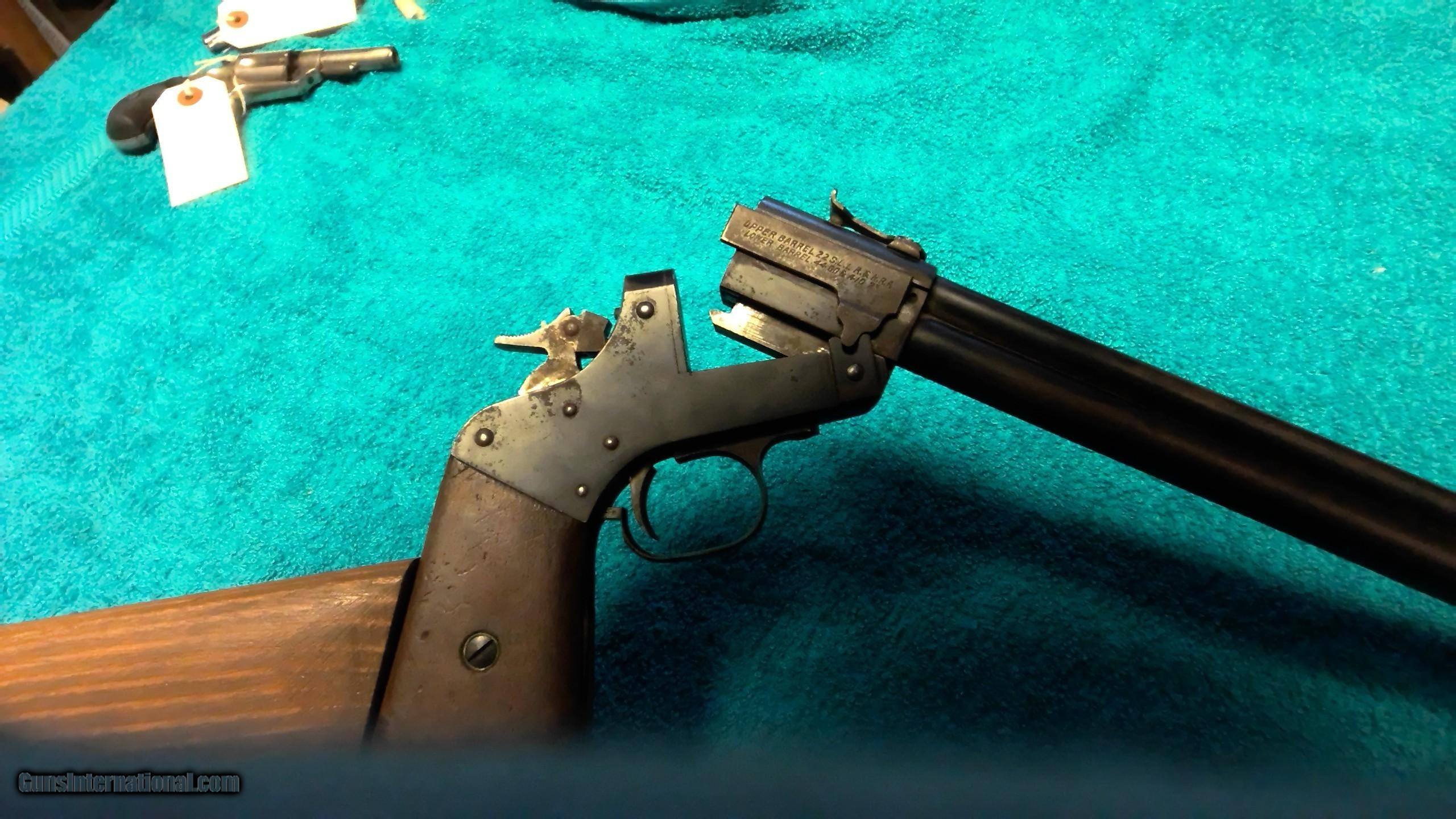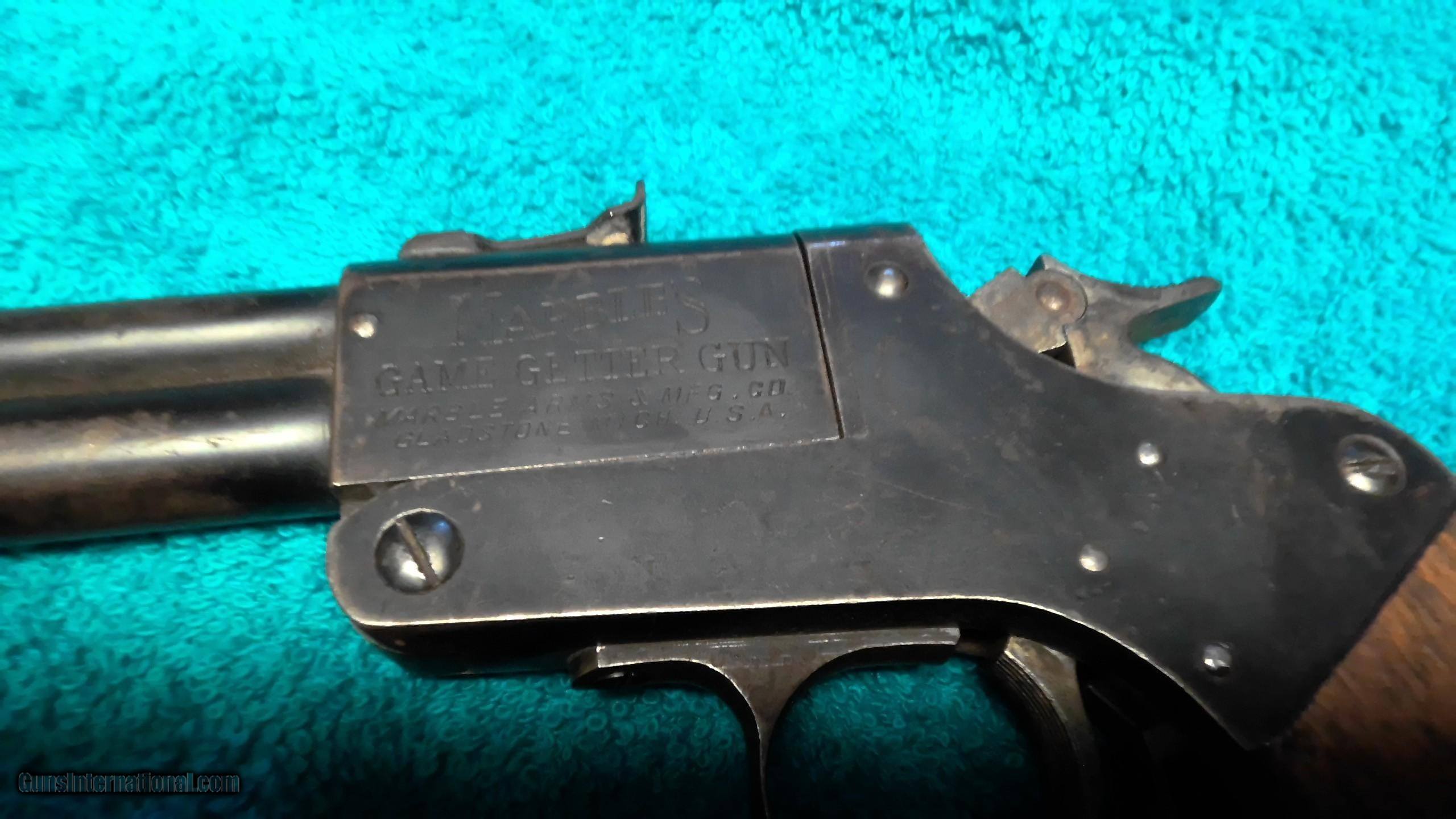 Description: Marbles game getter gun top barrel is 22LR bottom is 44 cal or 410 shot 2 1/2 in, 18 in barrel, home made butt stock, no crack or chips on pistol grips both are free of rust or pitting gun shots great, hard to find like this SOLD |