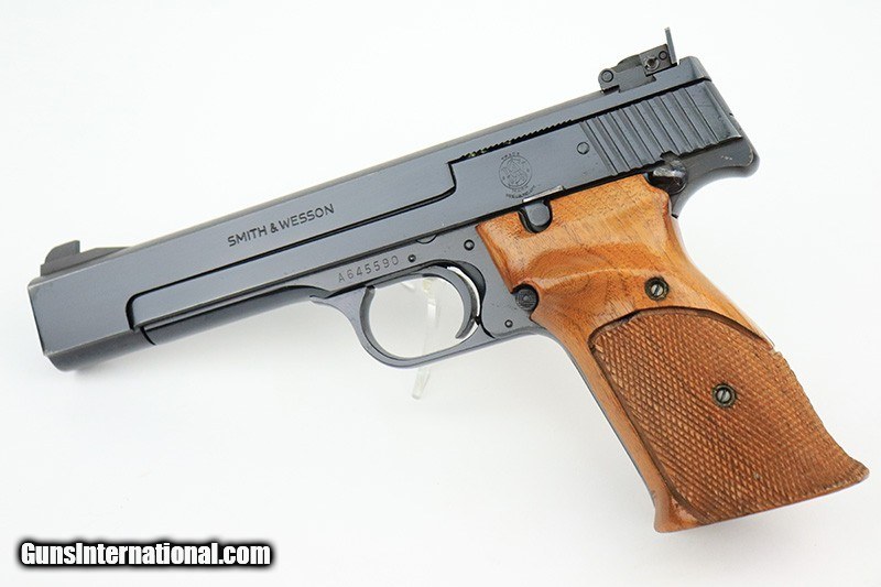 Description: This is a minty example of a Smith & Wesson Model 41, manufactured in 1979 and chambered in .22 LR. The gun is matching and comes with its original matching-numbered box, owners manual, and two proper magazines. The gun itself has retained about 97% of its original high polish bluing. There is minor muzzle wear and small dots of discoloration on the right side of the tang and along the high edge of the right side of the slide. Comes with beautiful wood grips. Mint bore. Now on GB SOLD Curio/Relic: Yes Handgun Caliber: .22 Long Rifle |