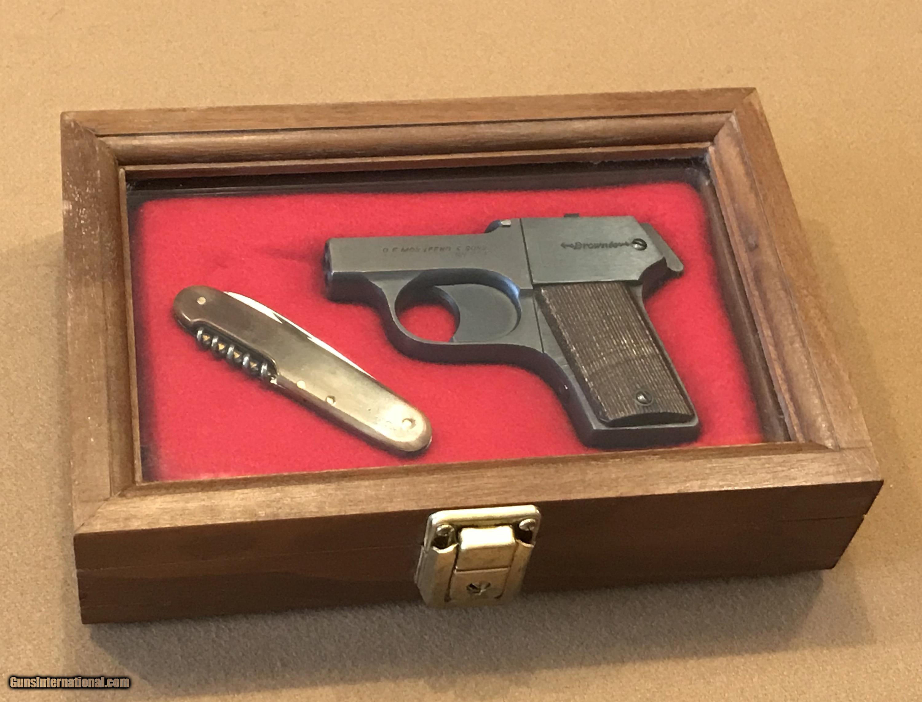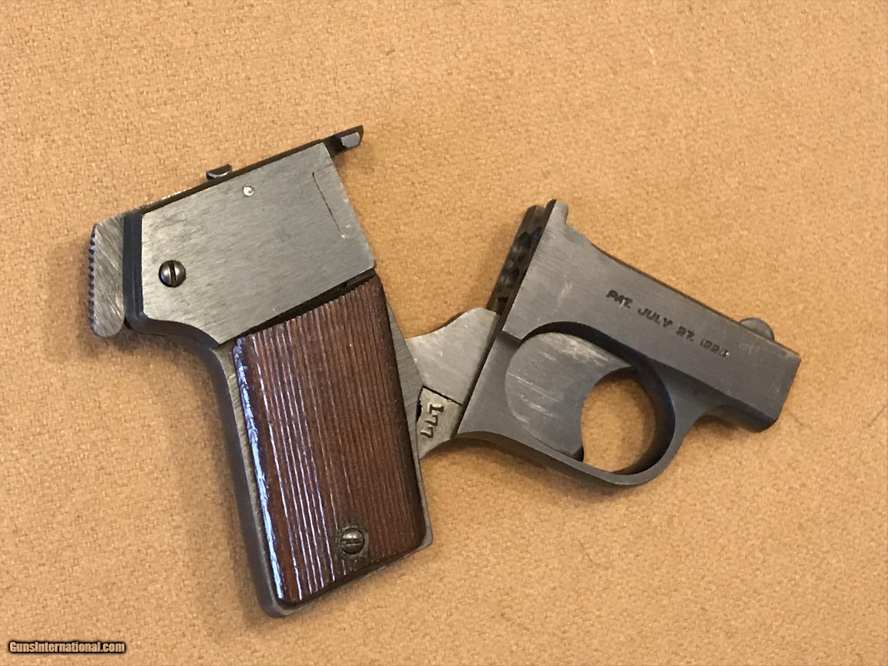 Description: MOSSBERG "BROWNIE" CAL. .22LR.***SOLD*** This beautiful little Mossberg "Brownie" .22LR Cal Gun is in perfect condition! It is a historic gun - the first gun to be produced by O.F. Mossberg & Sons in 1920. It has about 98% of the blue and its striated wooden grips are in very good condition with no chips or splits. It also has the original extractor rod on the left side which is almost always missing from these guns. The gun locks up tight and the 4 bores have well defined riffling. This beautiful little gun is in "like new" condition and comes in a hinged, wooden display box with glass lid and an antique knife/bottle opener to make a wonderful addition to your curiosa collection! Serial Number: 30177 SOLD Curio/Relic: Yes Manufacturer: Mossberg Model: Brownie Serial Number: 30177 Caliber Info: .22LR Extras: Glass Top Box & Knife |