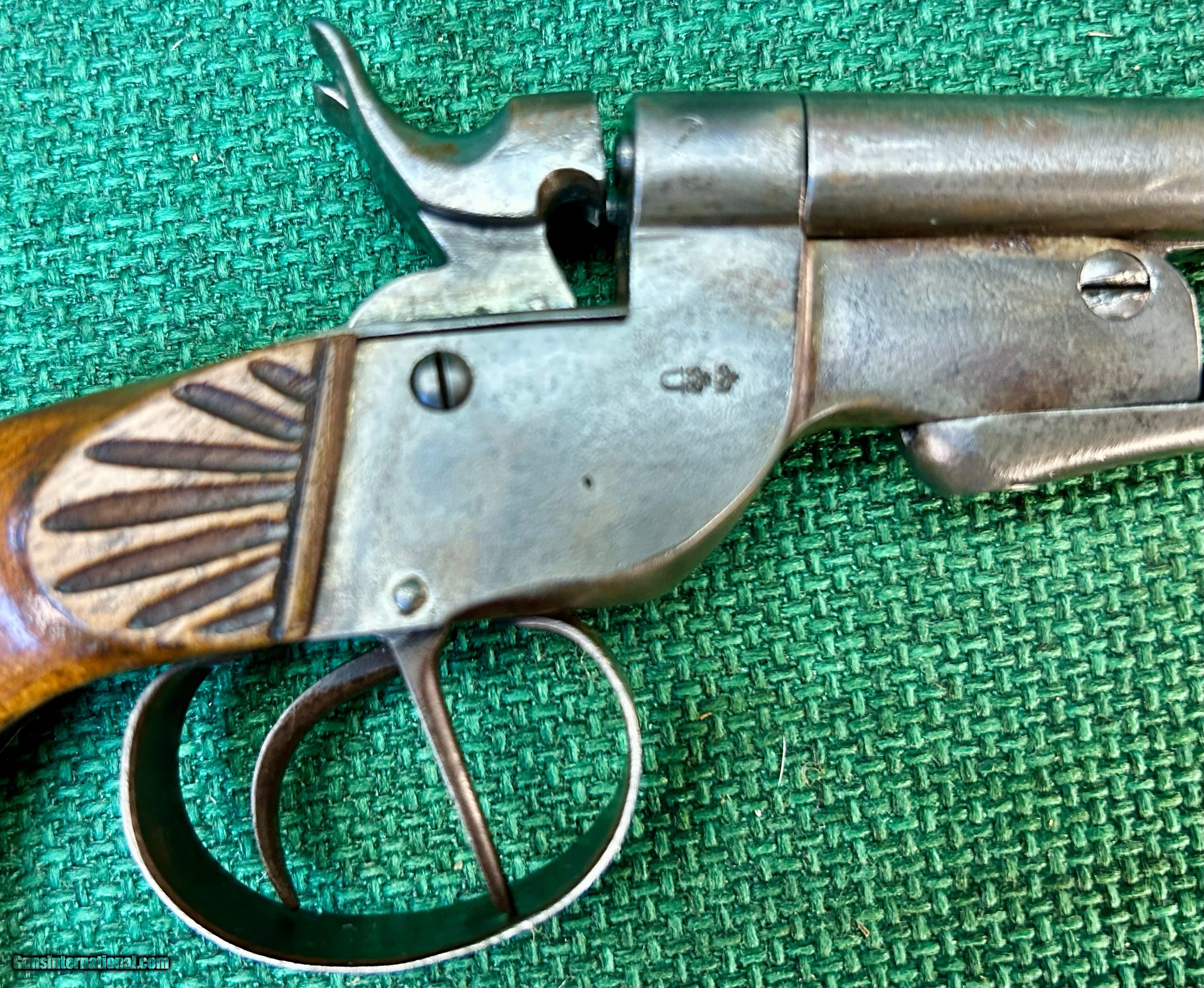 Description: Listed is a pair of pistols. The purchaser will be buying both for $299. The first pistol is a single shot swivel breech, chambered in .22 Rimfire. With hammer pulled back, the breech easily swivels to the left for loading and unloading. Hammer and trigger operate normally. The grips are oil rubbed with no cracks or gouges. There is one minor chip found on the butt of the grip. The finsh on this pistol is clean with a light patina. The second pistol is a double hammer centerfire pistol. It has been black powder proofed. A German proof can be found under the lever. The pistol's muzzle diameter measures .304". Pistol has a lanyard ring. Grips appear to be hand carved. Signs of use on grips are present, but there are no cracks found. While not fired by us, the pistol's hammers and triggers fuction with strong springs. Please see pictures for details. We accept USPS Money Order, cashier’s check, or credit card for immediate shipping. Please note credit card sales are subject to an additional 3% fee. US shipping only. Shipping costs are actual postage, with adult signature required, to your FFL 01 or 03. We will pay the insurance for the amount sold. All items are for sale locally, so make contact as soon as you make your decision. Inquiries will be handled in chronological order. All postings will remain active until funds are received. We appreciate funds to arrive within 10 days of verbal agreement. After such time we will entertain other inquiries in the order they were received. SOLD Curio/Relic: Yes |