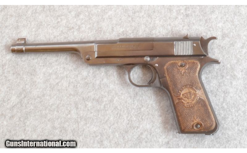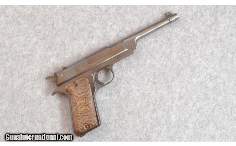 Description: A unique firearm and rather balanced in the hand. SOLD Caliber Info: .22 LR Metal Condition: Very good for an older firearm. Wood Condition: Good. Bore Condition: Clear and clean. Barrels: 6 inches. Triggers: Standard. Stock: Wood grips that are checked. Weight: 1 lbs. 14 oz. Sights: Notch rear and raised blade front. Extras: One Mag. Item Location: Lone Tree, CO |