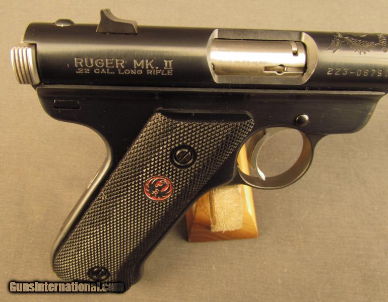 Description: S#223-08791, .22 L.R. 4.6 inch barrel, bright excellent bore. This 1999 built pistol features a stainless bolt with Ruger logo on back, 50th Anniversary crest on frame and red background ruger medallions on grips. Pistol remains in excellent condtiion retaining 99% blue and showing light use with very light marks on bolt. Comes in a red plastic box with two magazines, instructions, loader and lock. A great 22 pistol for plinking , targets and the Ruger Collector. FFL SOLD Manufacturer: Ruger Model: MKII Serial Number: 223-08791 Caliber Info: .22LR Gauge Info: .22LR |