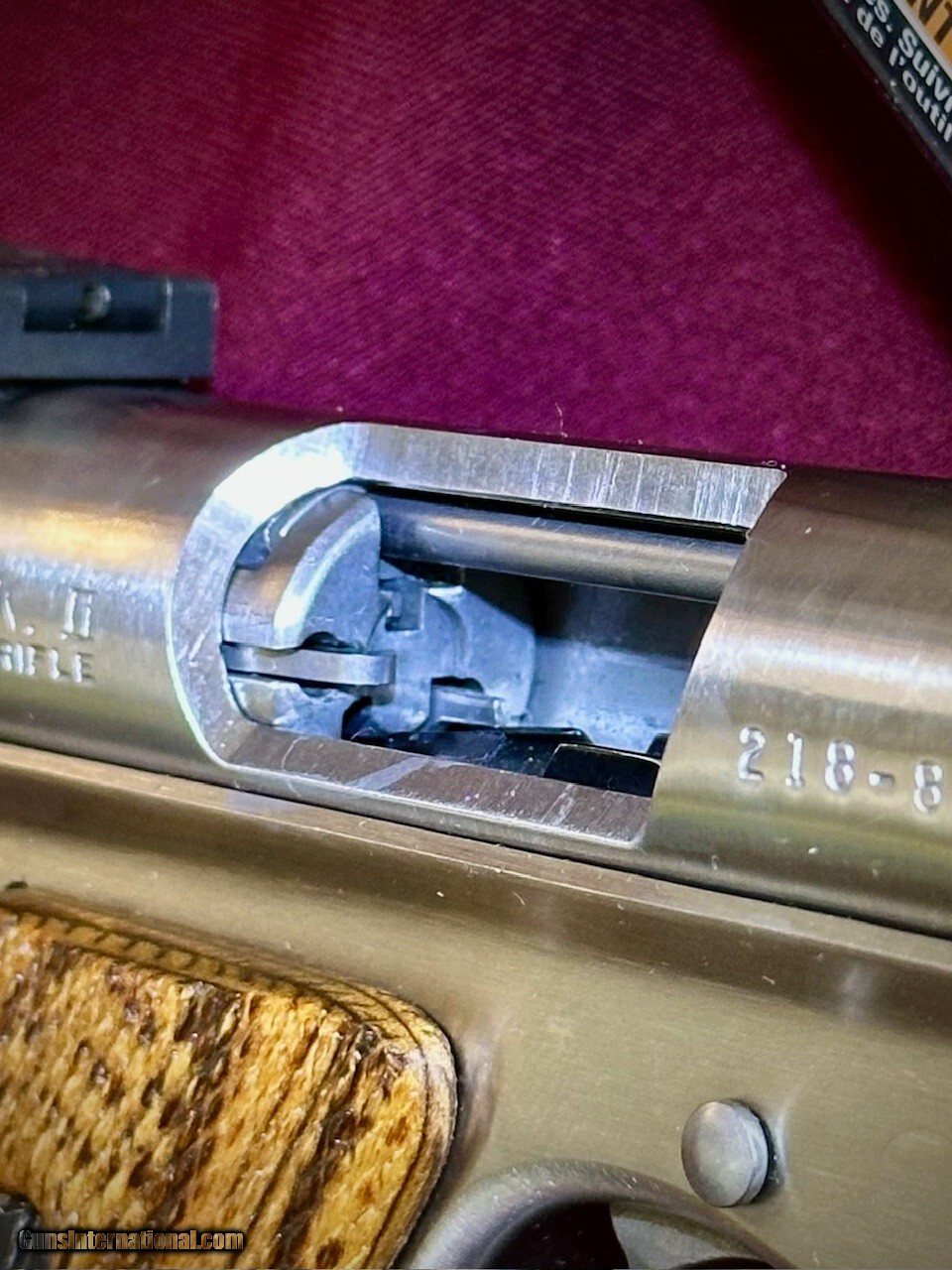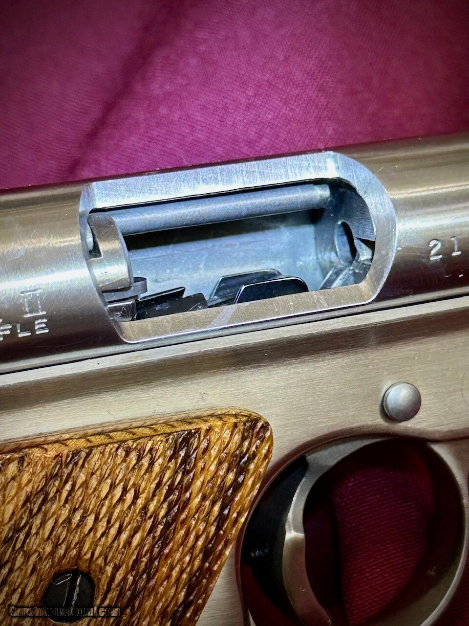 Description: Available for sale is a Very Nice Example of a Ruger “Volquartsen Custom” Mark II Stainless model with a 3.5” Volquartsen Heavy 1" Bull Barrel. This Mark II also has a Volquartsen Precision Trigger and is a super crisp competition pull. Pistol also has a Bo-Mar Precision Adjustable Rear Sight for Windage and Elevation. The Beautiful Custom Ergonomic wood grips are designed for a right handed shooter. The Condition of this pistol is Excellent and was manufactured in 1998. The Stainless metal and wood grips show little to no scratches, dings, etc. There is a small amount of finish wear on black front sight. (See pics) Bore is very clean with sharp Lands and Grooves. Pistol comes in Ruger Box, with one magazine, lock & Key. There is one very tiny spring included inside a small plastic bag…not sure where the spring is designed to fit? No Paperwork is included. I can only ship to the lower 48 states…..sorry, but no sales to CA, NY, NJ , DC. Make sure this pistol is legal to transfer and own in your City/State before purchasing. Shipping will be a flat $25 in the lower 48. FFL license is required for transfer. Will only accept USPS Money orders and checks as payment. Once cleared, I will ship to your FFL address only. I have great feedback on GB since 2003, so buy with confidence. Please ask any questions before purchasing or making an offer! If you need more details on the pistol, or have questions, please email or text and I will help. Thanks for looking! Brian Handgun Caliber: .22 Long Rifle Manufacturer: Ruger Model: MK II Serial Number: 218-85189 Barrel Length: 3.5 Condition: Exc Metal Condition: Exc Wood Condition: Exc Bore Condition: Exc Barrel Type: Volquartsen Action: Semi-Auto Triggers: Volquartsen Finish: Stainless Manufacture Date: 1998 Item Location: TX Grips: RH Wood Optic: Bo-Mar Adjustable Price: $1,100.00 Buy Now Contact Seller |