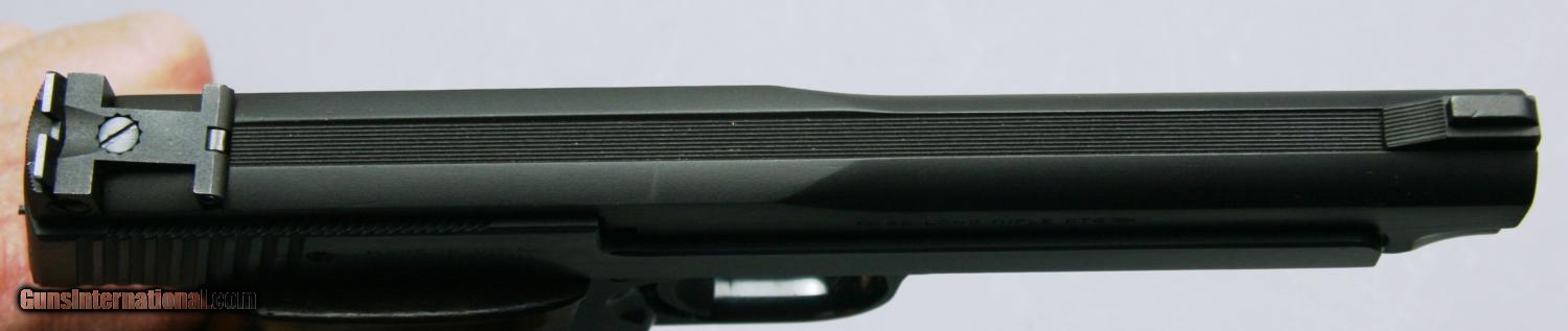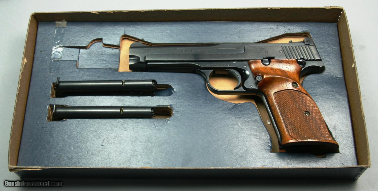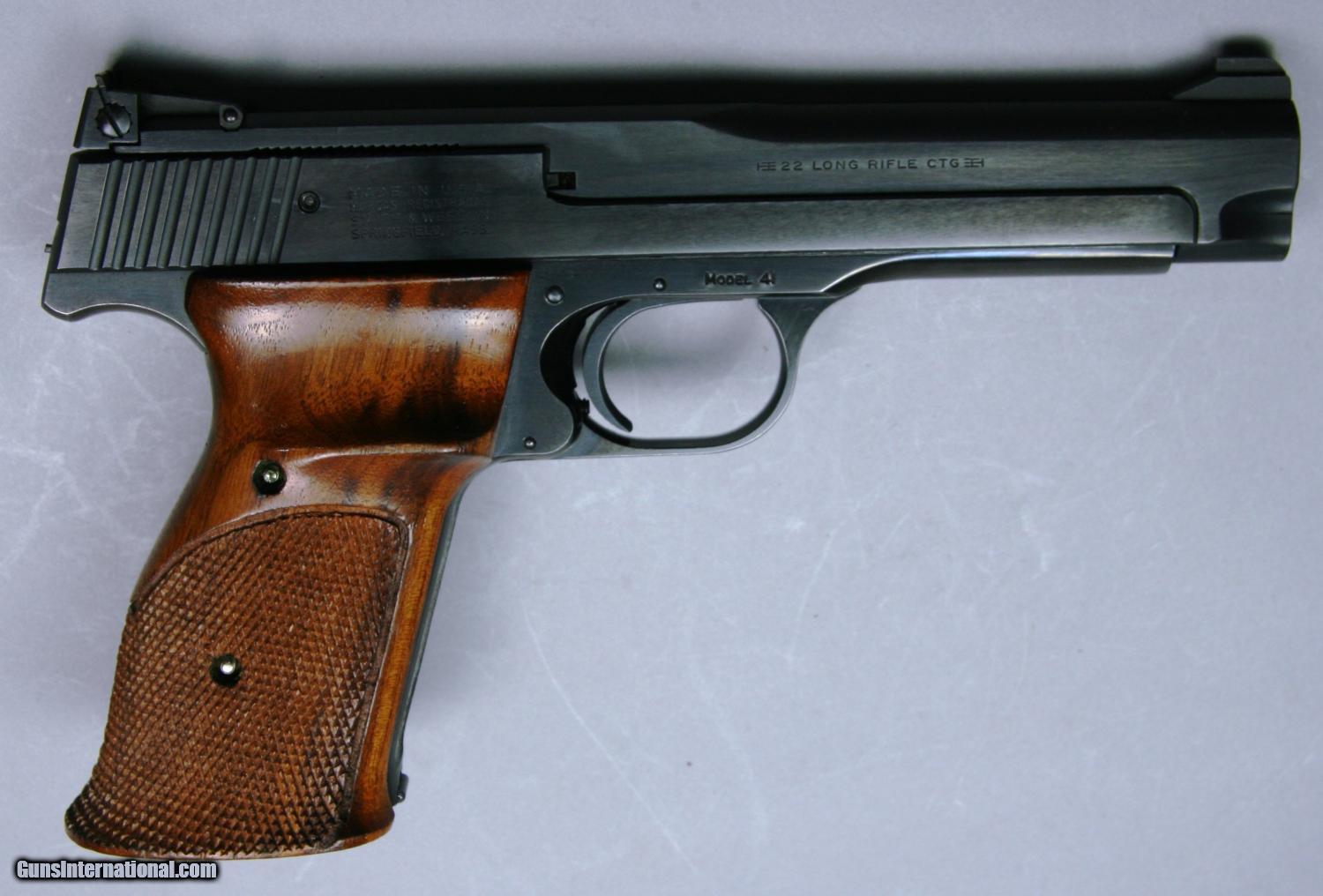 Description: This S&W Model 41 Target pistol has a 5 inch barrel and was made in 1973. It has the cocking indicator and beautiful wood grips. The condition is 99% with no noticeable wear. It does look to be fired, but well cared for, as most expensive target pistols are. The bore and mechanical condition are Exc. It has two original Mags. and the original numbered box, and instruction sheet. .22 LR Cal. 5” Barrel, Serial Number: A226558, FFL Required Beaver Creek Arms TERMS & CONDITIONS Objective: As a collector of 35 years and Licensed Firearms Dealer since 1989 I have a clear definition of a satisfactory transaction. I will be paid as we agreed to, and you will be satisfied with your purchase. My goal is to establish a client list of satisfied repeat customers who will recommend me to other collectors. It’s just that simple. Exiled Saudi princes with secret funds needing change from an over paid purchase need not apply. Notice: ALL Federal, State, & Local firearms laws will be followed. I will take NO shortcuts in the process of a legal sale or transfer, so please don’t ask. SHIPPING: Normally shipments are made via U.S.P.S. Priority Mail, Insured, with a return receipt. Typical Packing, Shipping and Insurance cost for a handgun is $30.00, and for a Long Gun is $45.00. Availability: All items are in stock and available for immediate shipment. Please call or email and an Item will be held up to a week with your Name, Address, & Phone Number. Items marked Reserved are being held for awaiting payment or on layaway. If you are interested in a reserved item, please call or E-Mail to be placed on a backup list. FIREARMS: Modern firearms, post 1898, can only be shipped to a Type 01 Federal Firearms License address. Curio-Relic firearms, as defined by the BATF list, can usually be shipped to a Type 03 Collectors License address. Some states have additional restrictions such as CA, CT, DC, IL, MD, NJ and NY. A signed valid FFL license copy either mailed or emailed will be required for shipment to only the license address. Antique firearms, pre 1898 do not require a Federal License. For purchase, a copy of a Government Issued Identification (Driver’s License, Etc.), showing date of birth and current address will be required. GUARANTEE: Your complete satisfaction is assured, see objective above. If you are not satisfied, please contact me within 3 days of receipt. Please don’t fire the weapon, safety, function and accuracy are NOT Guaranteed. Any weapon offered by Beaver Creek Arms is never test fired nor is there any representation the gun is functional and safe to fire. These guns are sold for collectors and only represented as used firearms that must be checked by a competent person, observe all the necessary safety precautions prior to attempting to load and fire one of these weapons RETURNS: Returns must be made within 3 days of receipt. They must be received in exactly the same condition with no parts exchanged. If it has been altered, damaged, or fired, a refund will not be made. Packing, shipping and insurance cost will not be refunded. All layaway purchases are returnable for merchandise credit only. Sales: All sales are made with the buyer’s full acceptance of the stated terms of sale. All sales are made in strict compliance with all Federal Firearms Laws. No items contained in thissite are offered for sale where prohibited by any Federal, State or Local laws. By ordering, the buyer certifies that their purchase will be in full compliance with all Federal, State and Local laws. All transactions shall be deemed to occur in Pennsylvania regardless whether by telephone, mail, internet or the physical location of the buyer. All transactions will be subject only to Federal and Pennsylvania State law. Any disputes will be resolved in a Pennsylvania Court. PAYMENT: Bank check, Personal check, and Money Orders are preferred. Visa and MasterCard are accepted with a 3% processing fee. For Visa and MasterCard orders please provide the account number, code number, expiration date, name on card, phone number and card billing address. This information can be phoned in, or E-Mailed. All orders must be paid in advance, C.O.D. orders are not accepted. Checks, both Bank and Personal must clear before the order will be shipped, usually a 2 week delay. LAYAWAYS: A 20% deposit is required. Balance is due in 60 days. Deposits are non-refundable and are forfeited after 60 days. Layaway sales are returnable for merchandise credit only. SALES TAX: Pennsylvania state sales tax is 6% for in state purchases. The payment of other states sales tax, if applicable, for shipped items is the buyer’s responsibility. DISCREET: Client information will remain Confidential. Your privacy is protected. SOLD |