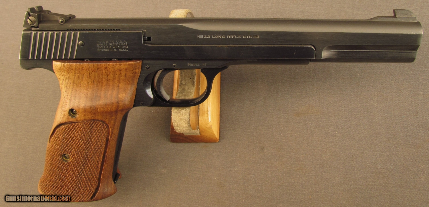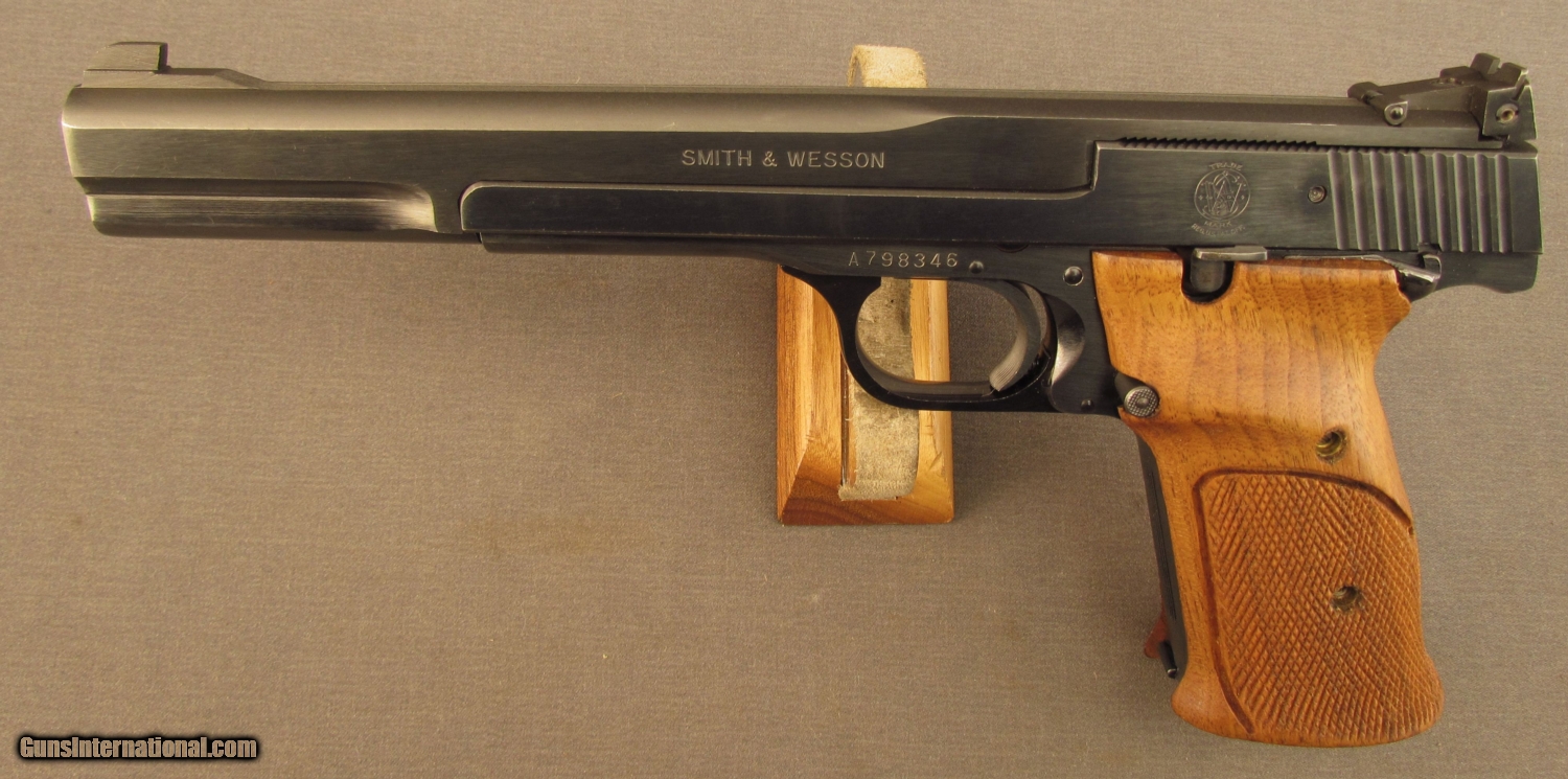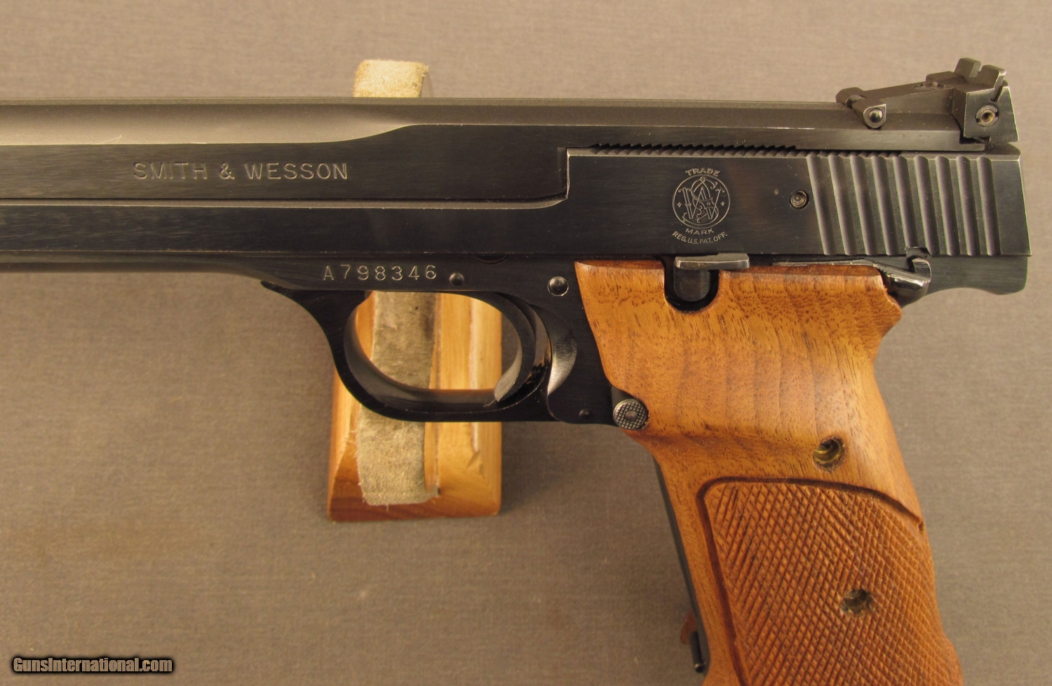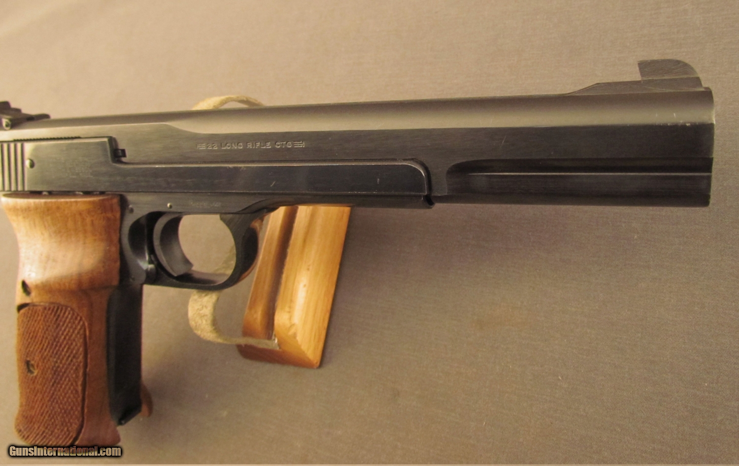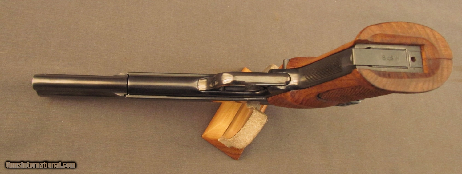Description: Serial #A798345, .22 LR, 7” barrel with an excellent, bright bore. This is a handsome, early '80s-made Model 41 (without cocking indicator) that retains 98-99% of the original blue finish that has silvered ever so slightly along a few of the exposed edges and projections. The checkered walnut grips are in fine shape, although the original, fairly glossy varnish has been removed leaving smooth, clean wood with sharp edges and points. The pistol comes with a single original magazine and is in excellent overall condition. FFL SOLD Manufacturer: S&W Model: 41 Serial Number: A798345 Caliber Info: .22LR Gauge Info: .22LR |