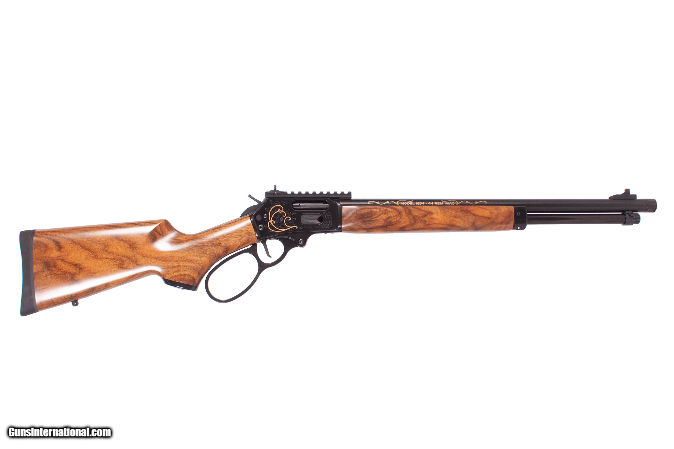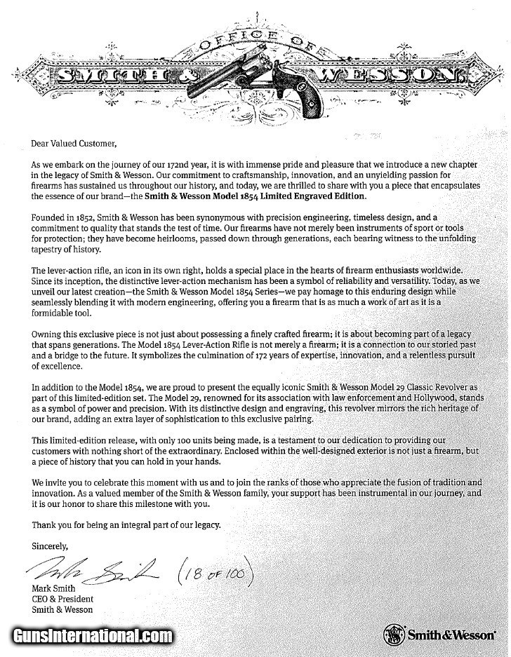 Description: Smith & Wesson Models 1854 lever action rifle with threaded barrel and 29-10 revolver limited series set both chambered in 44 Magnum in pristine condition and unfired sold as a set. This set was created in commemoration of Smith & Wesson's pedigree harkening back to the era of the Volcanic Repeating Arms company by showcasing the introduction of the model 1854 combined with it's smaller, yet equally powerful companion, the Model 29 revolver. Combining modern day engineering and manufacturing techniques, the new 1854 lever action limited series boast beautiful high-grade walnut furniture in satin finish combined with a contrasting, yet eye-catching, blued finish highlighting what is possible within the lever action rifle market today. To further showcase this limited run, Smith & Wesson released both models adorned in beautiful factory engraving with golden inlay exhibiting the pairs limited run of only 100 units. Further commemorating the release of this set, a factory letter from Smith & Wesson CEO Mark Smith accompanies these two beautiful pieces contained within the factory display case complete with wall hanging hardware to proudly display number 18 of 100 in your collection today! The NRA grading condition for this USED firearm is Perfect (Like New). We ship domestically in the United States. Additional shipping rates apply to Alaska and Hawaii. Dury's Lifetime Warranty: All firearms purchased from Dury’s Gun Shop, NEW or USED, are covered by a lifetime warranty. We will repair or replace, at our discretion, any firearm purchased from Dury’s Gun Shop, Inc. for as long as it is owned by the purchaser. This warranty is not transferable. WE BUY GUNS! NO COLLECTION TOO BIG OR SMALL FOR OUR GUNS INTERNATIONAL CUSTOMERS ALL OF OUR FIREARMS CAN BE PURCHASED DIRECTLY FROM OUR DURY'S GUNS SITE ! Manufacturer: Smith & Wesson Model: 1854 Limited Series Set Caliber Info: 44 MAGNUM Barrels: 20inches Price: $21,999.99 Contact Seller |