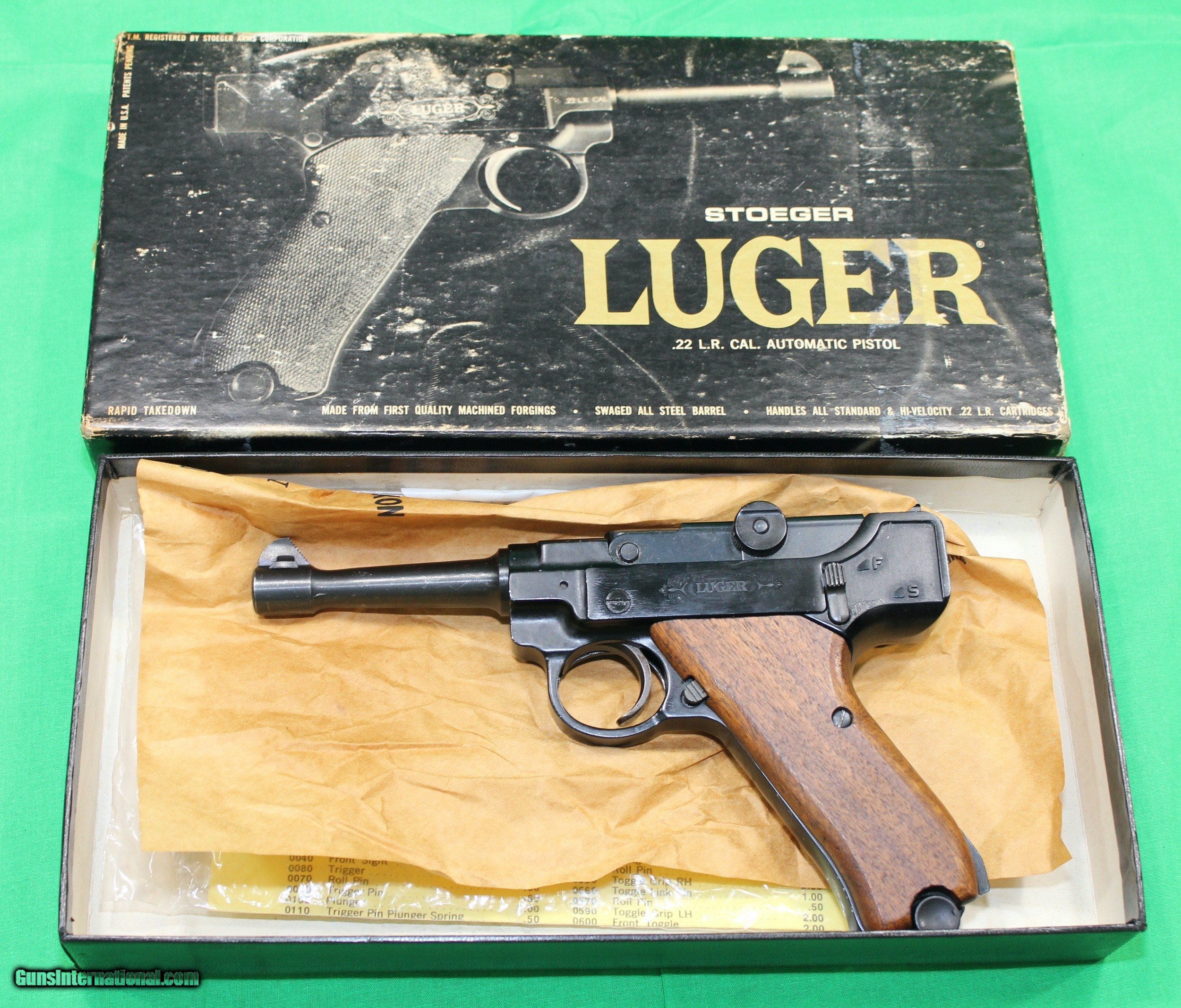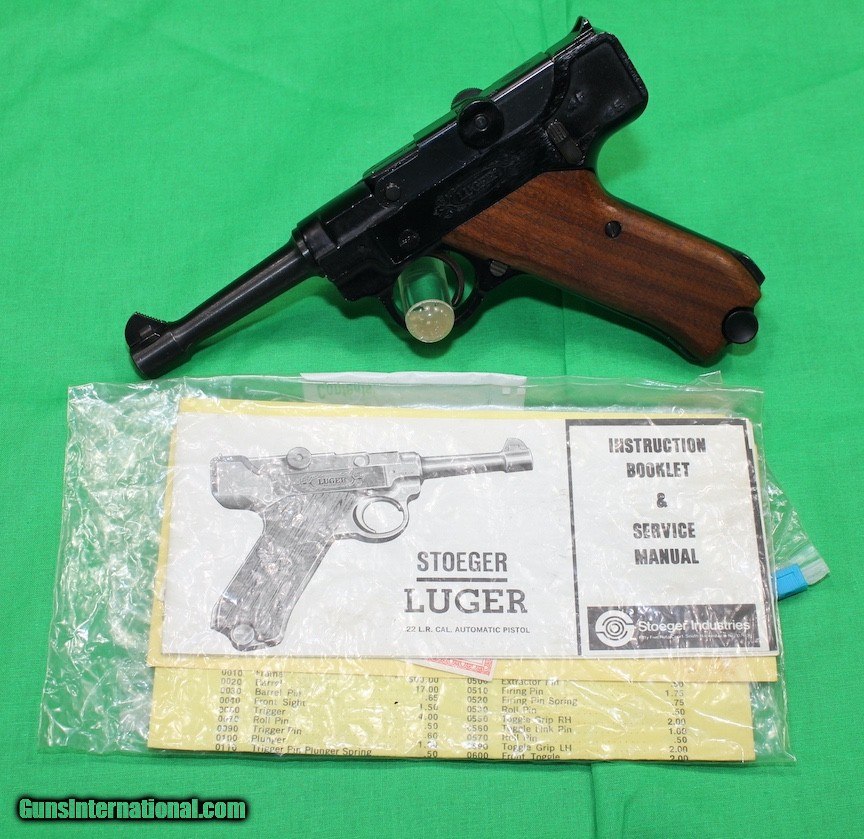 Description: This is a like new Stoeger Luger .22LR with box and paper work and paperwork. It comes with three factory magazines as well which are difficult to find. I'm in the process of downsizing and cannot take everything. $449.00 + $30 shipping to you FFL holder. Money order only. SOLD. SOLD Handgun Caliber: .22 Long Rifle Manufacturer: Stoeger Model: Luger Condition: excellent Metal Condition: excellent Wood Condition: excellent Bore Condition: excellent |