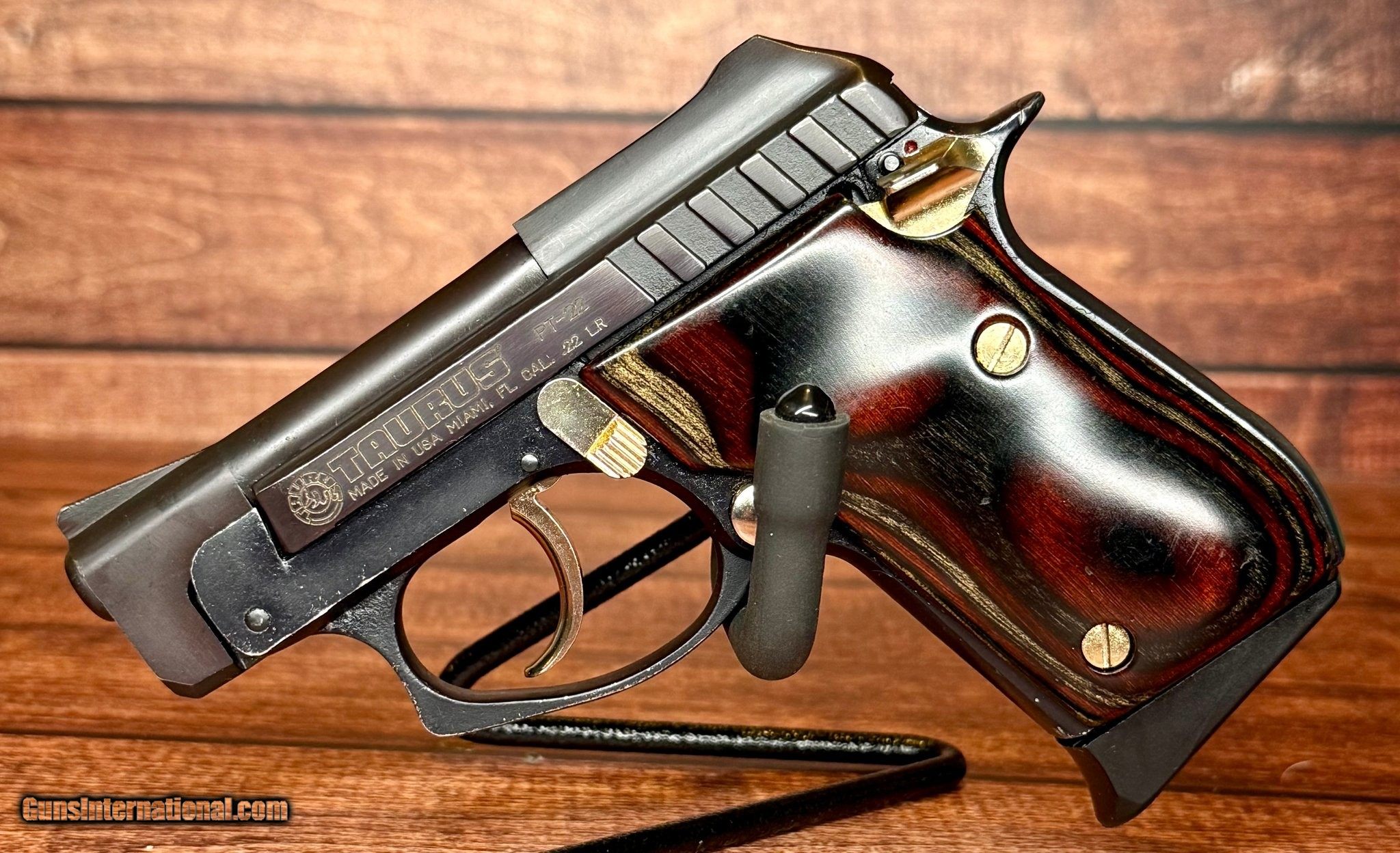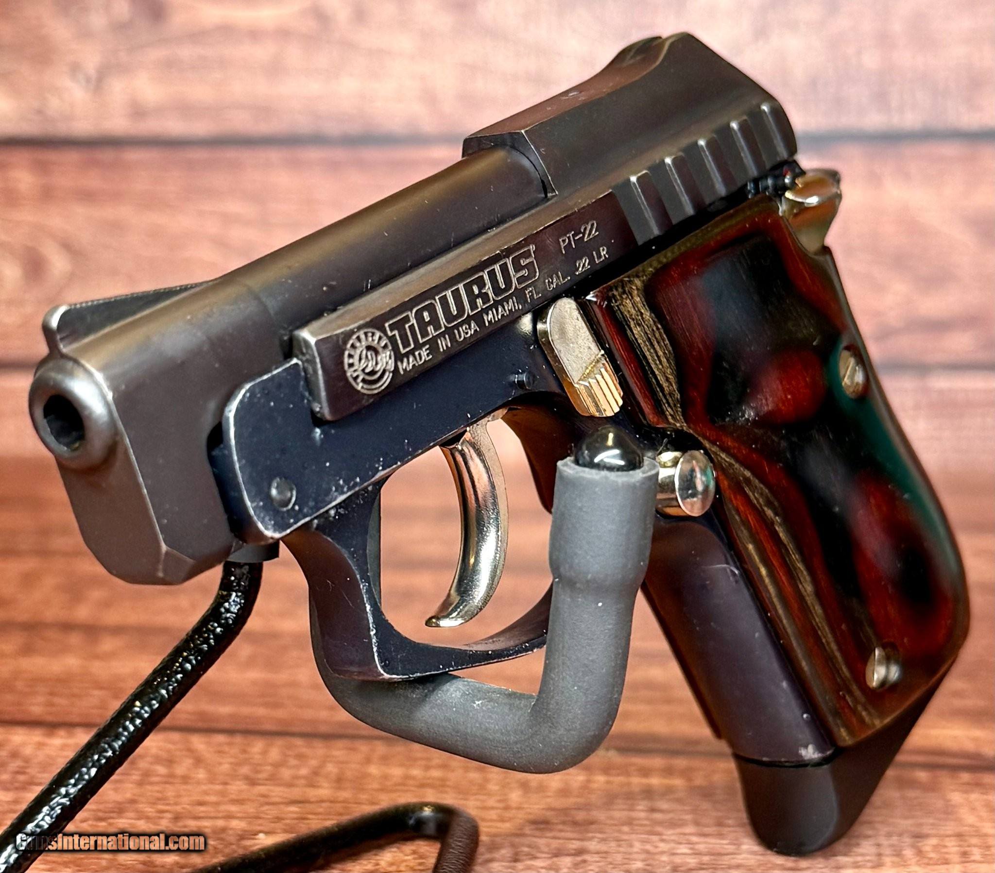 Description: Guns Listing ID: 618635 Discover the superior craftsmanship and timeless appeal of the Taurus PT22 Semi Auto Pistol. This legendary firearm, one of the first Taurus models to be manufactured in the United States, showcases the brand‚s commitment to quality and innovation. The PT22 is in very good condition, exhibiting only minor, superficial signs of prior handling or use. Firearm does not come with a pistol case but does include a single 8-round magazine. The PT22 boasts a robust .22 LR caliber and a Double Action Only (DAO) mechanism. Its barrel length is a compact 2.75 inches and features a unique tip-up design that sets it apart from its competitors. The blued finish adds a touch of sophistication and style to the piece, while the aluminum frame and wood grips offer an elegant contrast. Despite the very small scratches on the barrel and wood grips, the overall allure of the firearm remains unmarred. The black fixed sights, with a serrated front, ensure precision and accuracy. With an 8+1 capacity, the PT22 is not only an excellent collector‚s piece but also a reliable choice for personal defense. Its compact size makes it the perfect pocket pistol, while the wood grips and gold-colored accents add a touch of elegance. Don‚t miss this chance to own a piece of Taurus history, a testament to American manufacturing, and a reliable, stylish firearm. Specifications Manufacturer Taurus Model PT22 Caliber .22 LR Overall Condition Very Good Bore Condition Excellent UPC 7 Action DAO Capacity 8 + 1 Barrel Length 2.75\" Finish Blued Stock/Grips Aluminum frame, Wood Grips Sight/Optic black fixed sights, serrated front Country of Origin United States Manufacturer: TAURUS Model: PT22, PT-22 Caliber Info: .22 LR Condition: Used - Non-Certified Barrels: 2.75" BARREL Action: SEMI AUTOMATIC Finish: blue/gold Price: $278.99 Contact Seller |