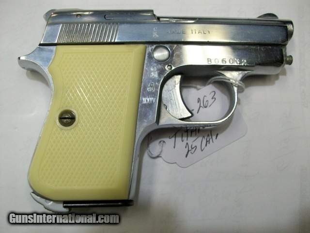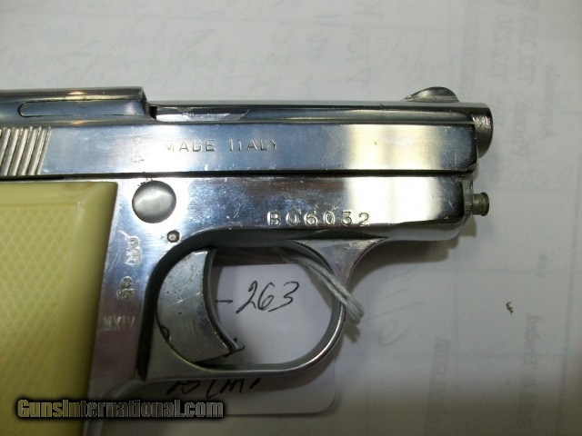 Description: This .25 Cal. micro pistol is a MADE IN ITALY Titan. Comes with the top half of the box. Very good condition. No scratches, rust or flaking. $170.00. rmgrigoletto#yahoo 732 280 8750. SOLD |