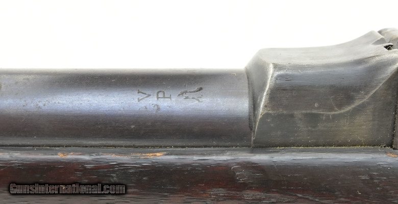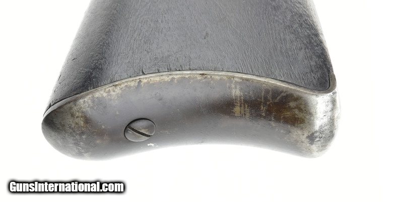 Description: U.S. Springfield Model 1873 Trapdoor .45-70 caliber rifle. Early model 1873 Springfield Trapdoor rifle. Barrel looks to have been from a “Model 1879”, as it has the 1879 buckhorn rear sight and large “V/P/” over eagle head. Bluing is starting to turn to patina. Bore is bright with strong rifling. All metal parts are a light grey patina. Breech block is a high arch. Hammer is the second type with the oval stamped knurling. Serial number is 21062. Wood is good, shows minor use and handling wear. An inspectors’ mark is noted rear of the trigger guard. This is a very good looking trapdoor rifle! SOLD |