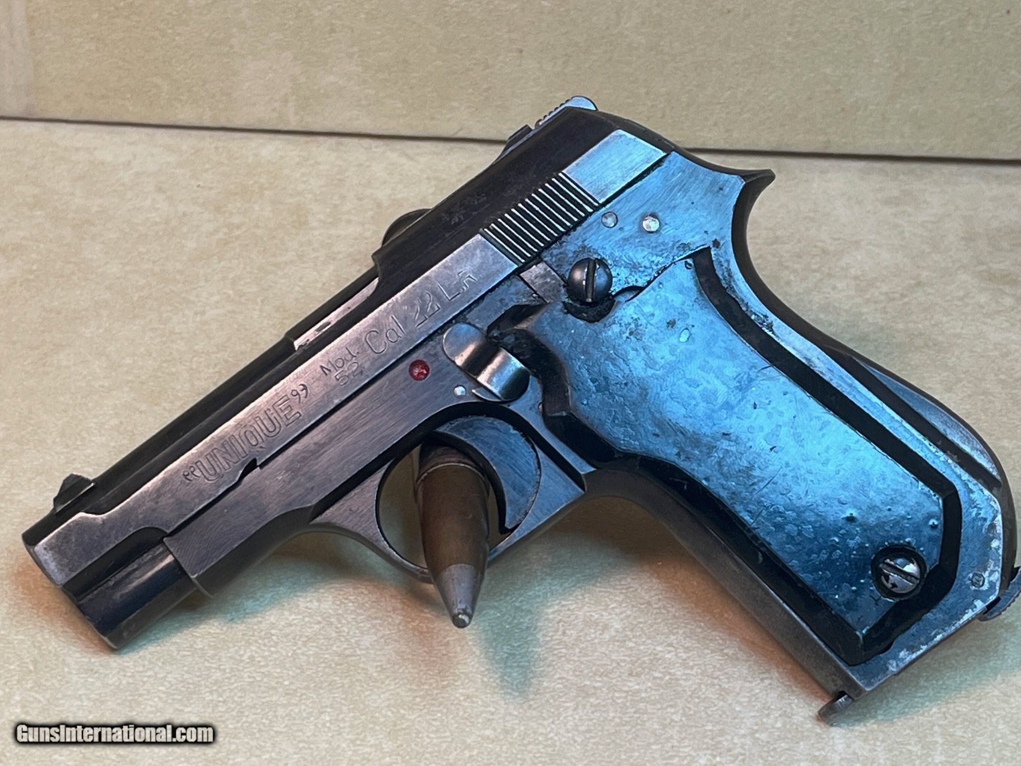 Description: Guns Listing ID: 1283811 A very \"Unique\" handgun made in France broken grip(see pictures) one mag no box SOLD Manufacturer: UNIQUE ARMES FRANCE Model: mod 52 Caliber Info: .22 LR Condition: Used - Non-Certified Barrels: 3 BARREL Finish: BLUE |
