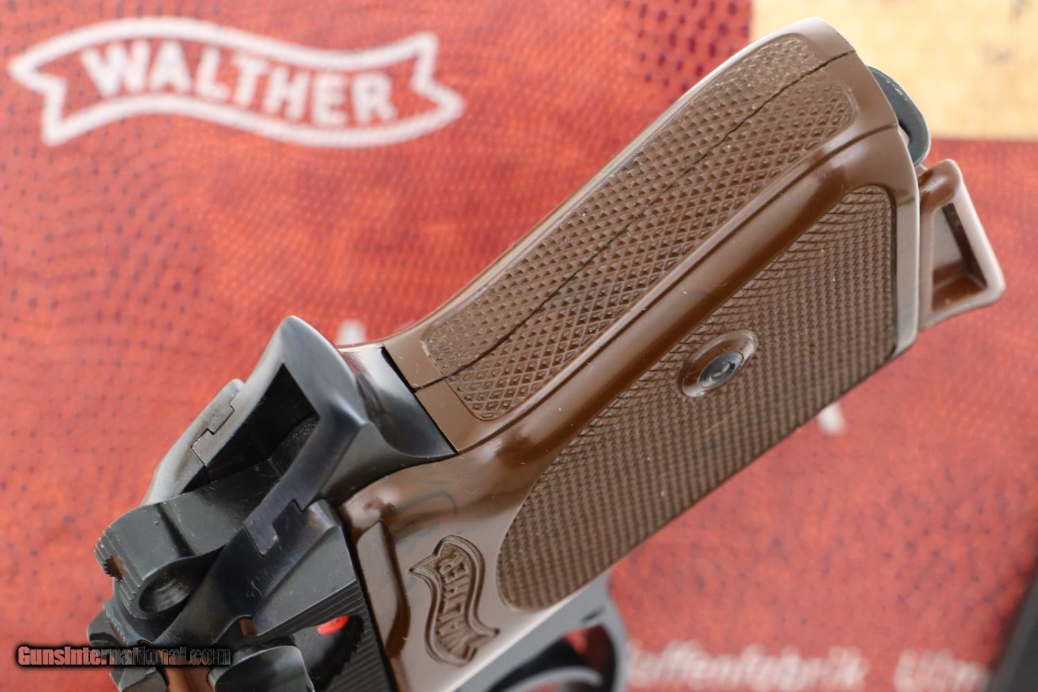 Walther PPK made in 1965, caliber .22LR, with fixed front sight, drift adjustable rear sight, and no loaded indicator. Usual slide address on left side reflecting manufacturer, model, caliber, and location in Ulm, Germany. Red dotted safety indicator. Full serial number on right side of frame. Fitted with two piece brown plastic grips and brown finger extension magazine. Complete with spare standard length magazine, factory matching test target, care advisory, instruction booklet, and original factory matching faux alligator box.