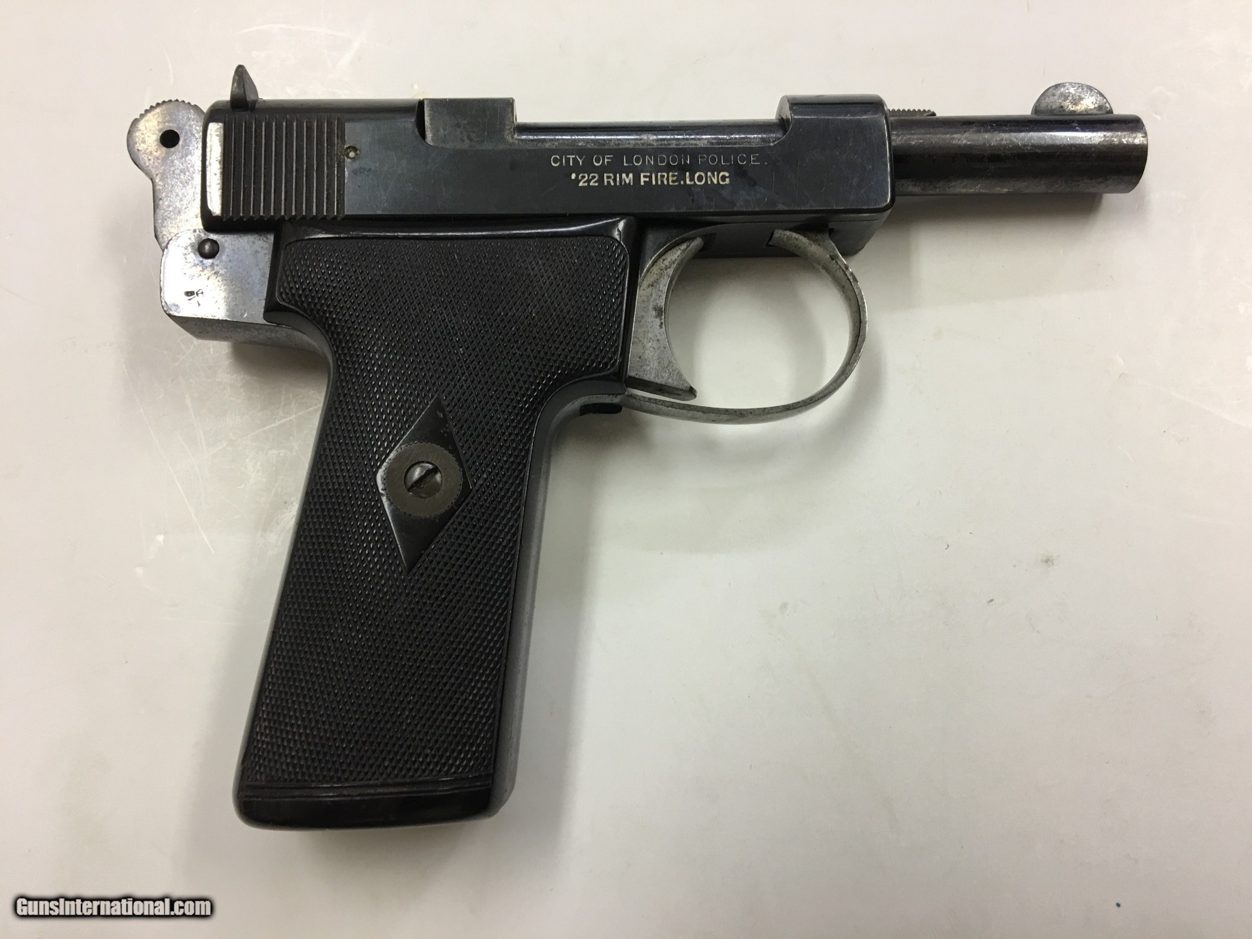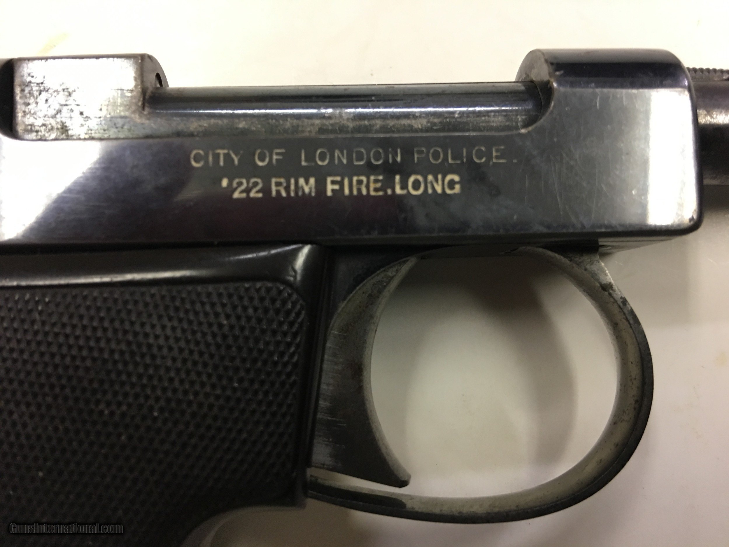 Description: Webley & Scott Model 1911 .22 Rimfire. This model was used for training purposes by the City of London Police. Has British broad arrow proof marks, instead of the standard BV BP proof marks. Marked "City of London Police". 90% bright blue finish. Seldom seen with the 4.5" barrel. Produced 26 March 1912. This is a single shot model. The police used this model for training, because it was less expensive to five a .22 instead of a 32acp for training purposes. At this time patrol officers did not carry a pistol. The pistols were kept at the station house, and if needed had to be checked out. SOLD Curio/Relic: Yes Manufacturer: Webley & Scott Model: 1911 Serial Number: 68XXX Caliber Info: .22 Rimfire |