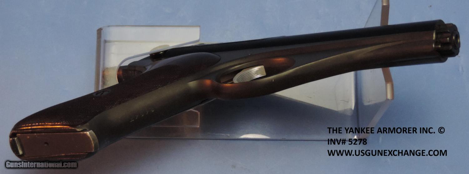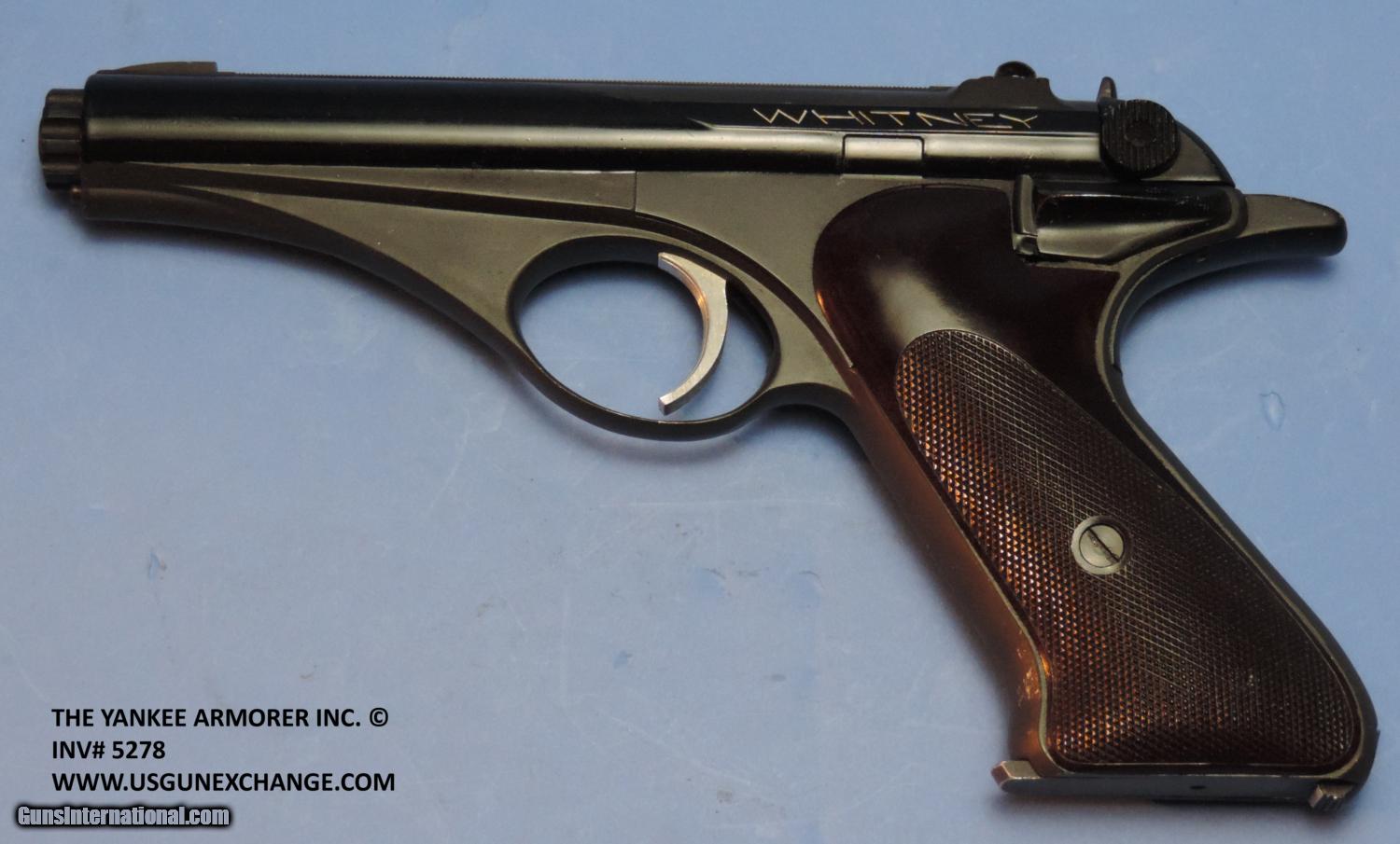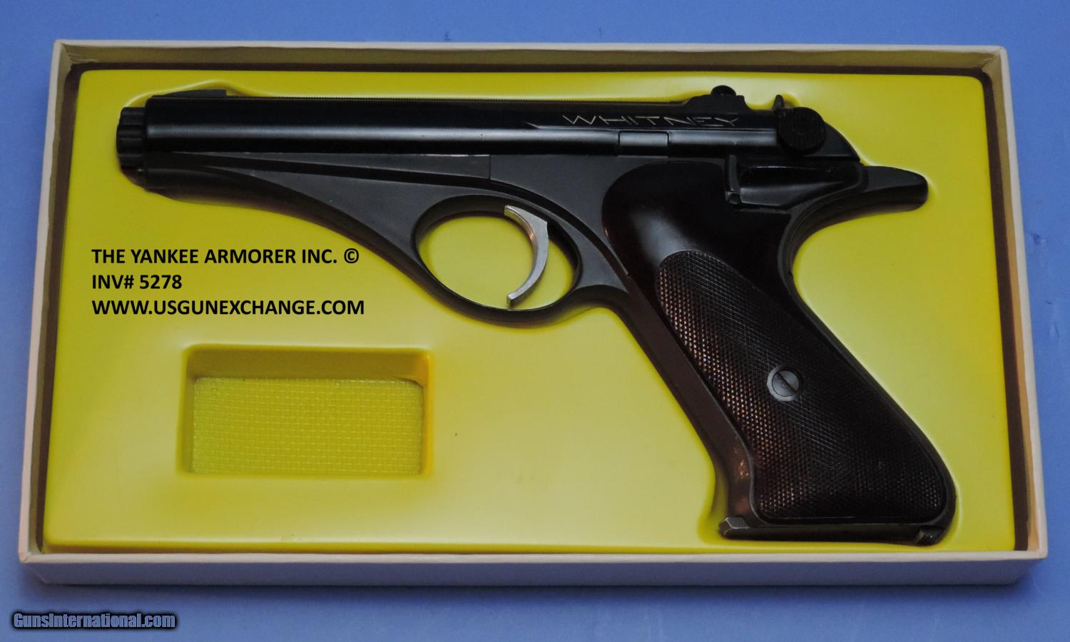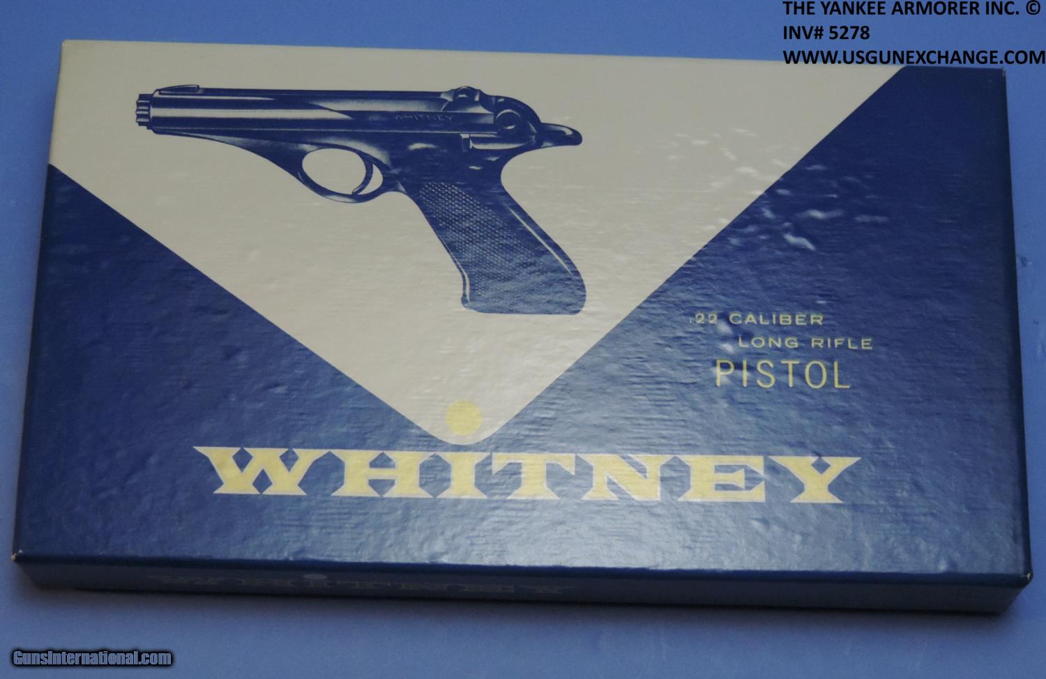 Description: Inv. 5278 Whitney (Wolverine), Caliber .22LR, Serial Number 349XX. This was Bob Hillburn's most famous design Bob Had done work previously as chief designer for High Standard, He also had done work for Remington, Winchester and the CIA (Clandestine stuff) to name just a few. Unfortunately his marketing skills were not up to his engineering skills. The company eventually failed making this unique design a rare collector's item indeed. This particular gun is as close to factory new as you can get with the exception of a few tiny hairline surface scratches none over a 2/8th "long on the front grip strap. . The brown plastic grips re perfect showing no use, with no chips or splits. The grips screws are unmarred. All parts are correct as it left the factory. The bore is as you would expect, appears to be in unfired condition. The gun comes with one original factory magazine. The original factory box is mint and we also have the original cardboard sleeve for the box. A simply beautiful a "safe queen" if there ever was one. $1995. To purchase this firearm or if you want to request more information contact us at: Email ckgunsymail Phone 201-512-0002 Cell 201-575-6838 FAX 201-215-4759 We accept most major credit cards. Prices shown are Discounted 3% for Cash or Check. The buyer must be familiar with all the laws governing the purchase and the ownership of firearms in their own city and state. The Yankee Armorer, Inc is not responsible for any failure to comply with or observe these laws. The Yankee Armorer, Inc will only ship after full payment and receipt of all required documents. Shipping: Add $35.00 for handguns, $45.00 for long guns. New Jersey buyers are subject to a 7% sales tax. The Yankee Armorer, Inc offers a 3 day inspection period with full refund upon return of intact firearm and in the original condition. The Yankee Armorer, Inc offers a no interest lay away program - 25% down; 25% in 30 days; 25% in 60 days; and full payment in 90 days. Any violation of this policy is subject to restocking and forfeiture of all payments. Any variation from this policy must be agreed to in advance. Unshipped Cancelled sales are subject to a 20% restocking fee. Be advised that all firearms sold by The Yankee Armorer, Inc. or the Gun Exchange, LLC (SELLER) are sold as collector’s items. They have not been fired or tested for safety and must be examined by a license gunsmith prior to use. By purchasing any item from the (SELLER), you are agreeing to hold the (SELLER) free from any damages or lawsuits of any nature. Any item left for transfer or storage will be charged to $25.00 per month, per item from the day of its receipt. Any variation from this policy must be agreed to in advance. Store hours 10:00 am to 5:00 pm Tuesday -Saturday. It's always best to call for appointment. Store 201-512-0002, cell 201-575-6838. SOLD Curio/Relic: Yes Manufacturer: Whitney Serial Number: 349XX Caliber Info: .22LR |