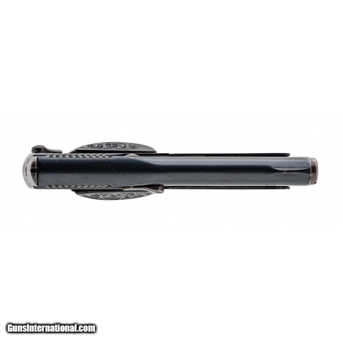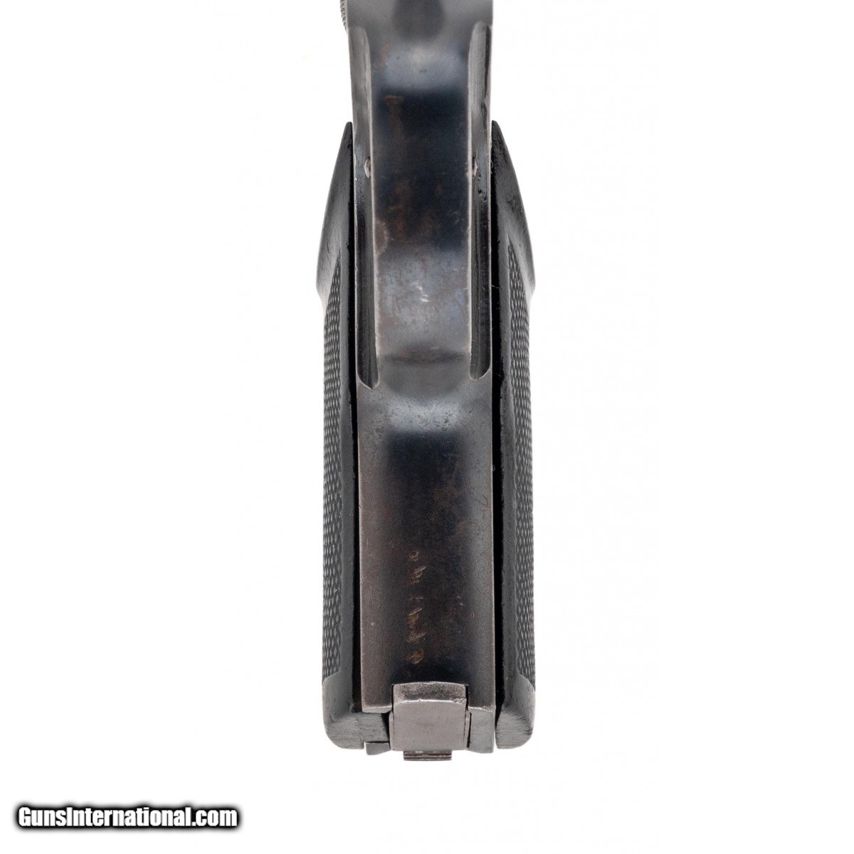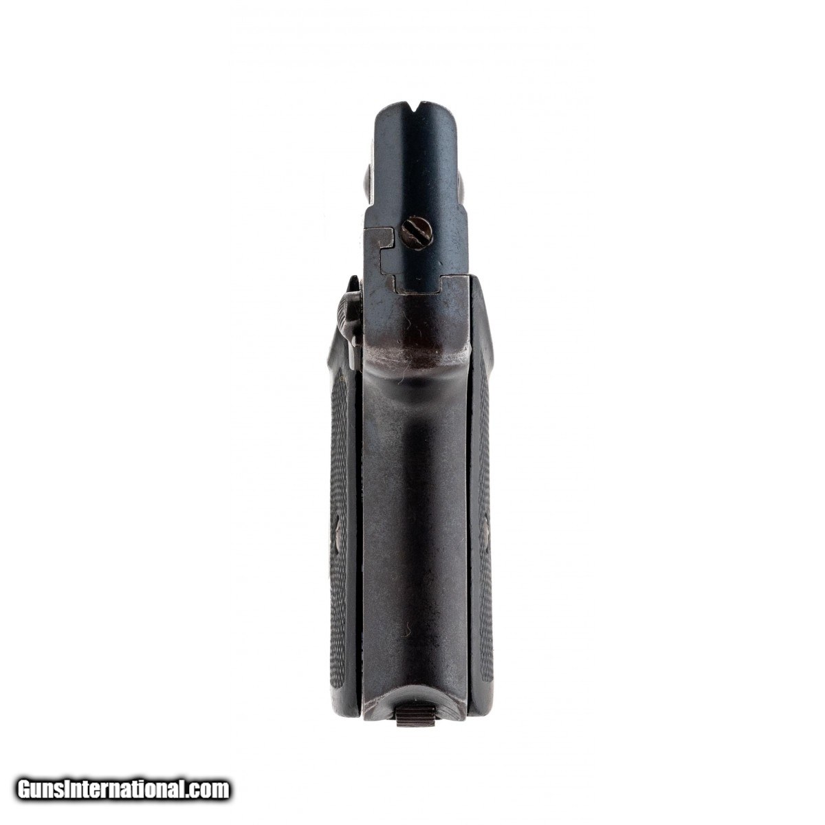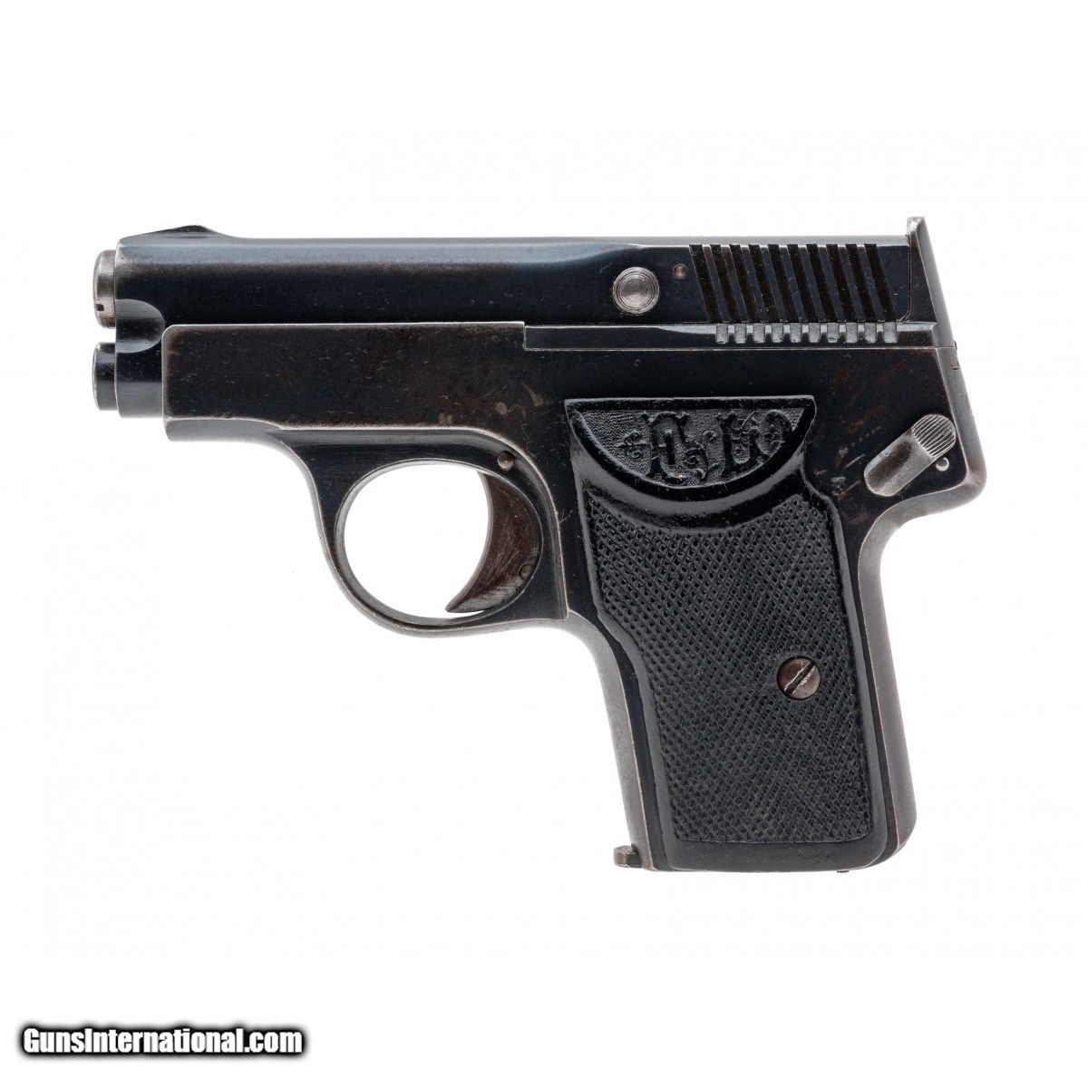 Description: " SN:12723. Circa 1920s, .25 ACP, with 2.5"" barrel. Bore is in very good condition. German made semi automatic pistol with proof markings. Metal has 40% original finish with patina. Grips are in very good condition with very slight wear. Overall in vey good condition. SOLD |