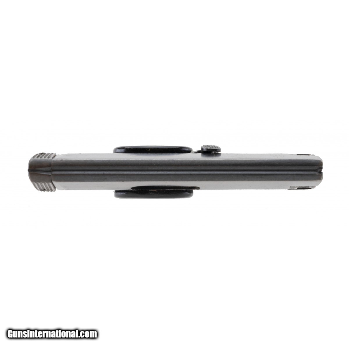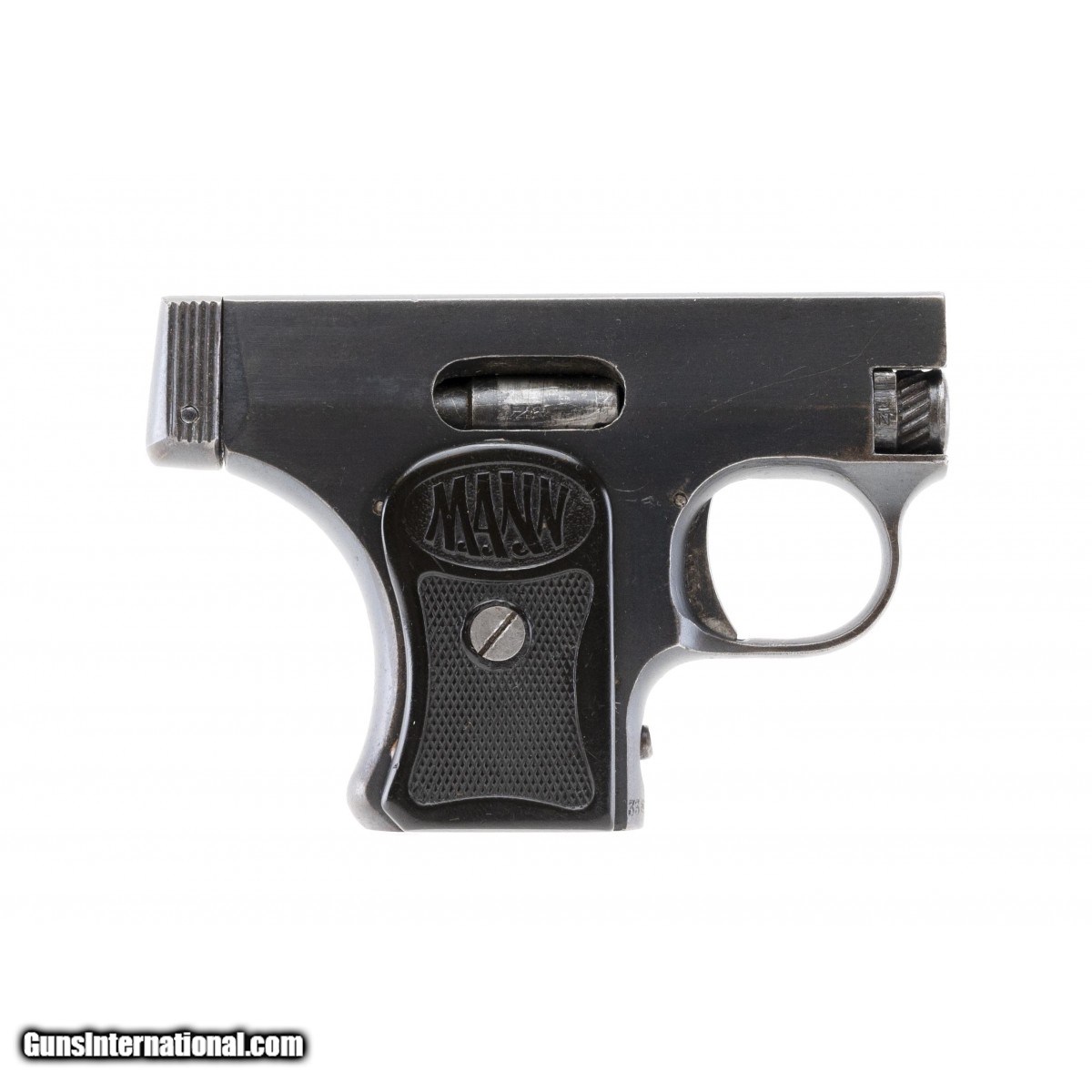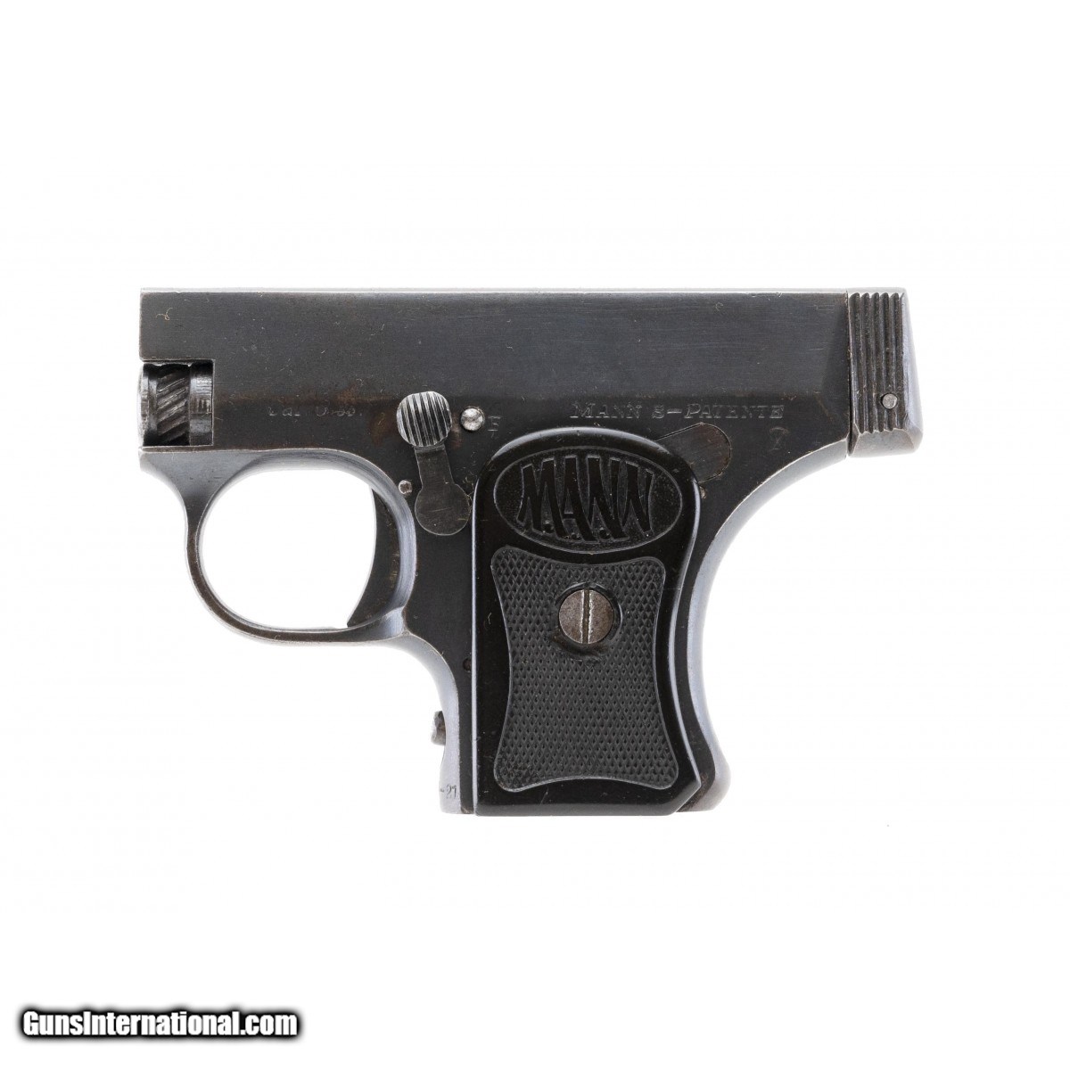 Description: " Bore is good, no pitting. Pistol is marked on frame ""Mann's Patente"". Grips are very good. Mann Autos have a most unusual slide design with slide angled to join at the top! The magazine pops out when spring loaded button on the front grip strap is pressed. A scarce early pocket auto. SOLD Curio/Relic: Yes |
