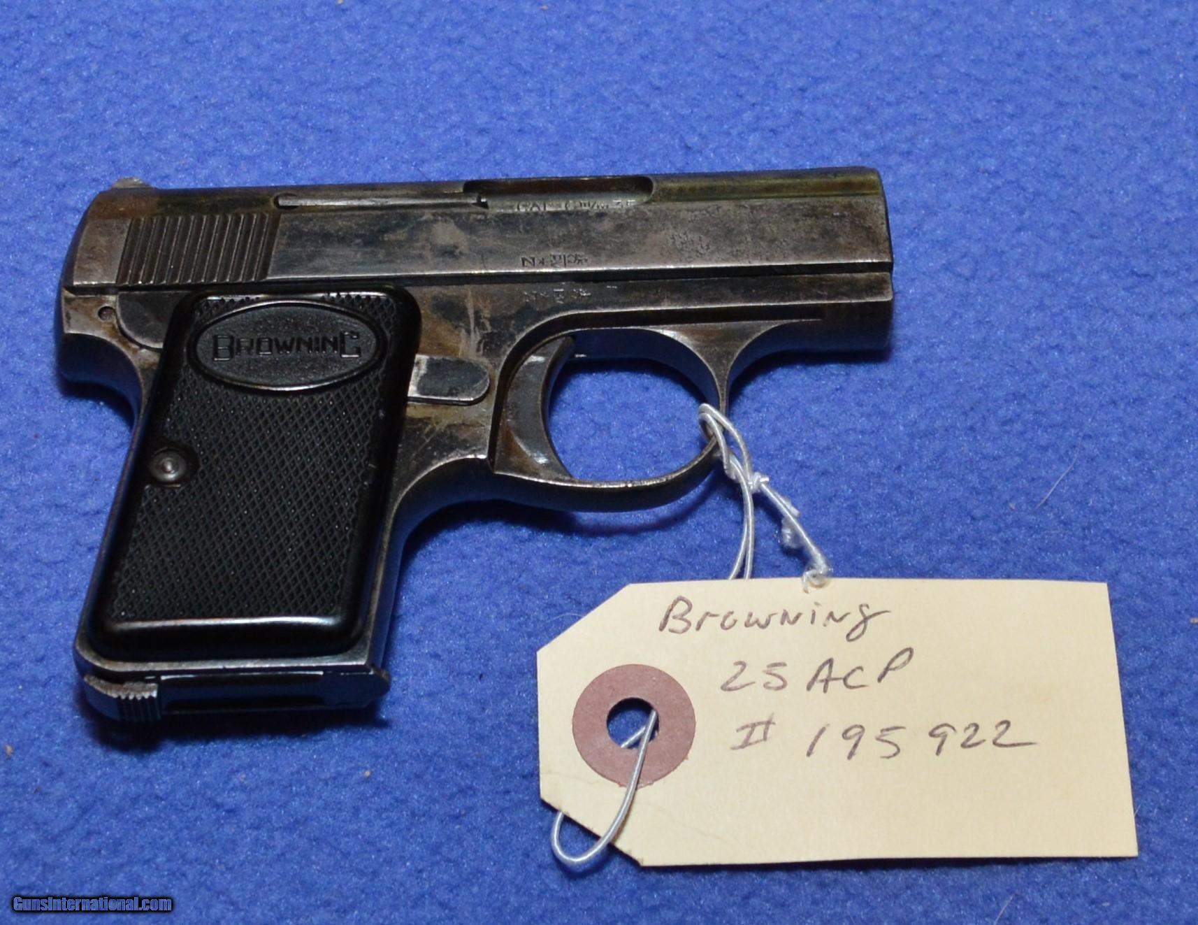 Description: Baby Browning 25 ACP She is a little rough on the exterior finish but still functions fine. This Browning 25 ACP or 6.35mm bears serial # 195922. This little guy once belonged to the current owner’s late mother who, back in the day ran a roadhouse type establishment. It had the honor of riding in her brazier while her mother worked there. She apparently was fairly serious about her business staying her business. I’d put the original finish at 60-65% original remaining. Bore is very good, magazine is FN marked. Yes, we can and do ship into California. Shipping will be $10.00 USPS Priority Mail. If illegal to own in your area don’t bid. Payment with US Funds from US Banks ONLY!!! We accept Cash, Checks, Money Order and US Postal Money Orders. We also accept Visa, MasterCard, AMEX and Discover at 2.8% service fee. No fee lay away available with 25% down balance in 30-45 days. Call for details. All items ship when payment clears, no exceptions. We cannot accept PayPal for firearms or ammunition, their rules not ours. Call 865-805-1187 for details or questions. Out of state buyers no sales tax yet. Local buyers must pay 9.50% TN sales tax and $10.00 TBI state back ground check fee. Please encourage your congressman and senator to vote against an internet sales tax and instead encourage local shops to hire persons to post on the web. I’ve done both! SOLD Manufacturer: Browning Serial Number: 195922 Caliber Info: 25 ACP Bore: Very Good Chambers: Excellent Condition: Very Good Metal Condition: 65% Bore Condition: Very Good Action: Semi Auto |