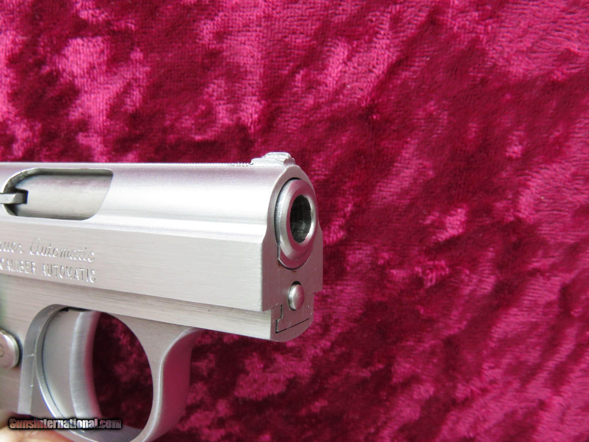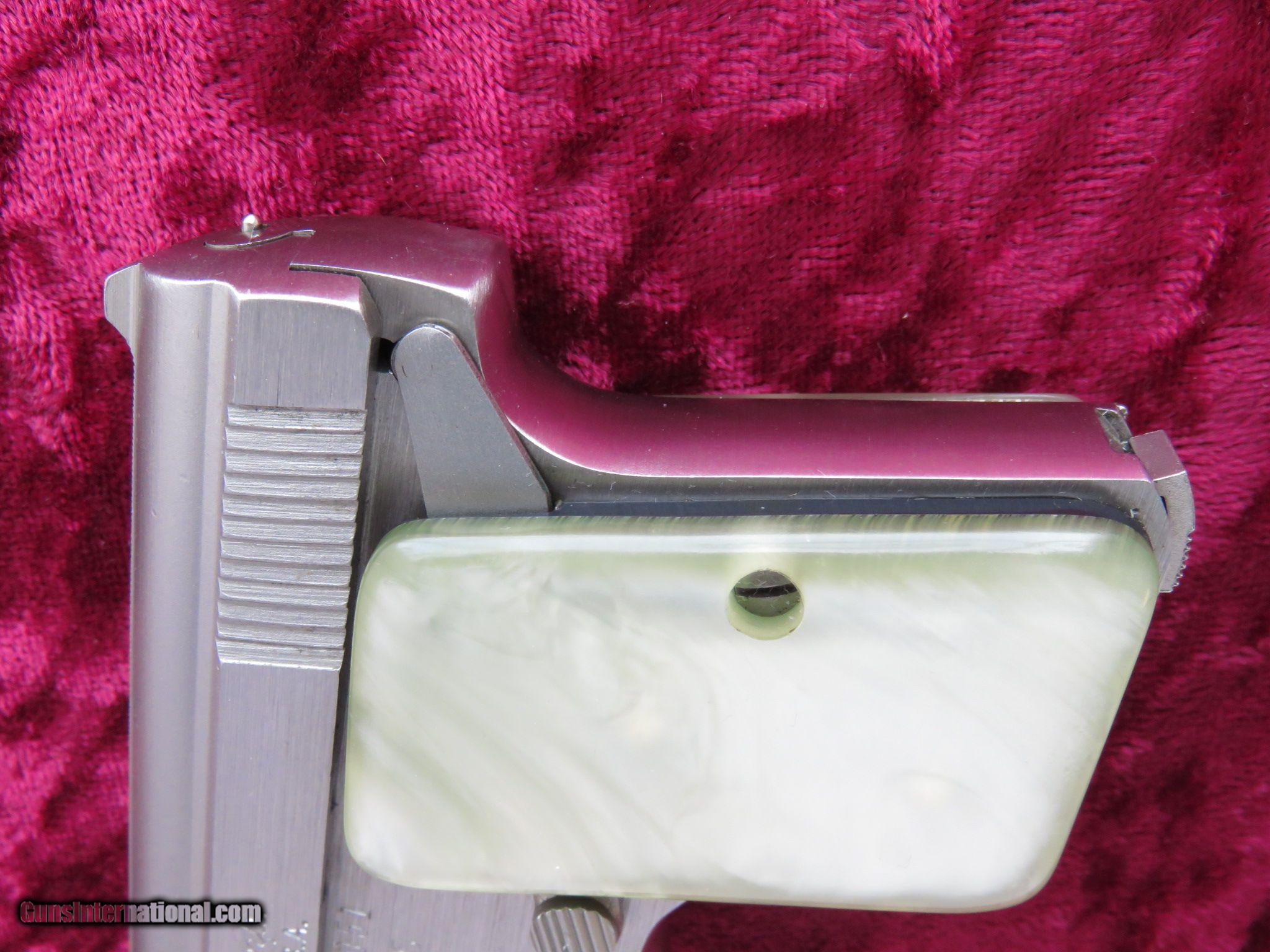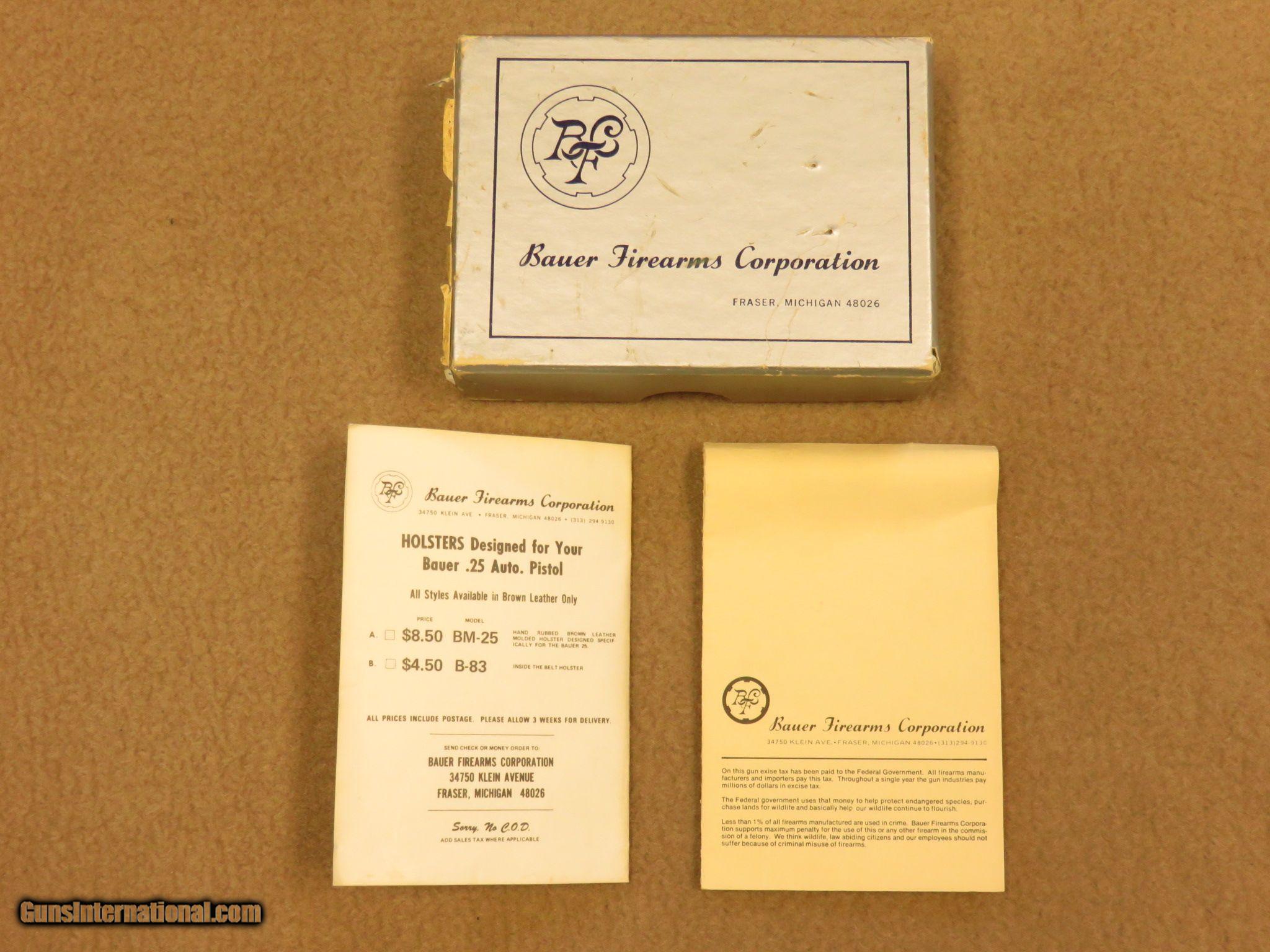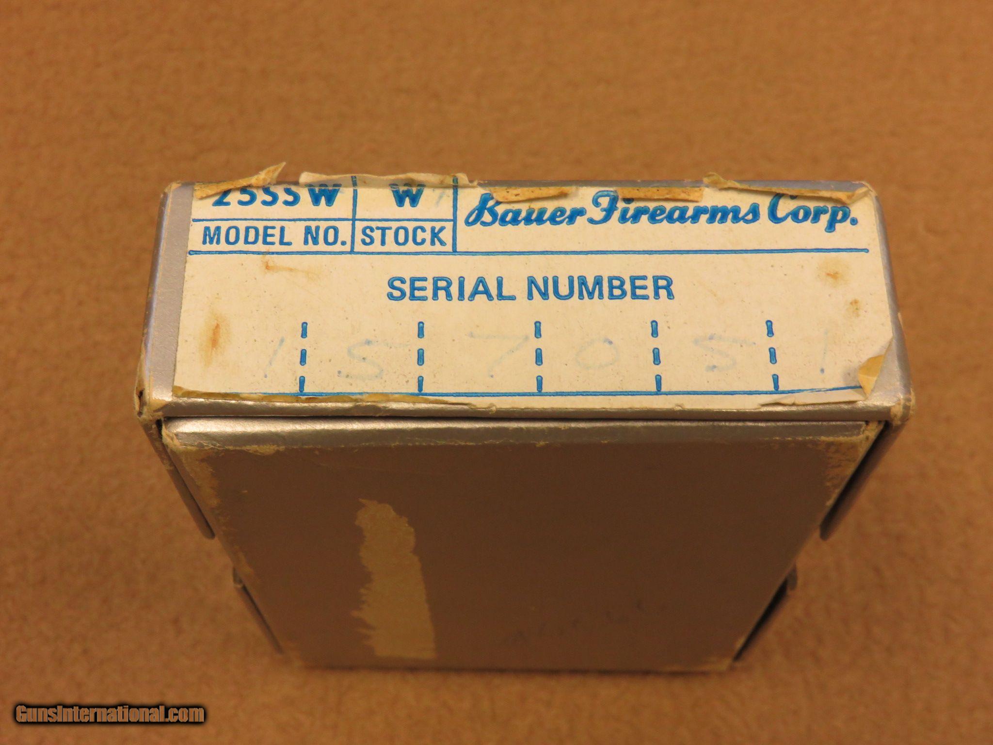 Description: These little Bauer .25 ACP Pistols were made from 1972 to 1984 and are identical to the Baby Browning, except in stainless steel.. The small pistols were fitted with a 2 1/2 inch barrel, 6-shot magazine, fixed sights, checkered walnut or pearlite grips, and were chambered in .25 ACP.. This Bauer is as described and is fitted with pearlite grips. The gun is in like new condition, appearing to having been fired very little, maybe only factory test fired. Comes with its original numbered to the gun box and all paper-work. PRICE: $350 We are Antique & Modern Firearms in Lexington, KY, dealer of fine firearms since 1974. PH. 859-276-1419 We Buy, Sell and Trade Firearms & Knives. Have a Individual Firearm, Firearms Collection, or Firearms Estate to sell, let us know, we can buy or consignment sell it for you. (sales at am-firearms) SOLD |