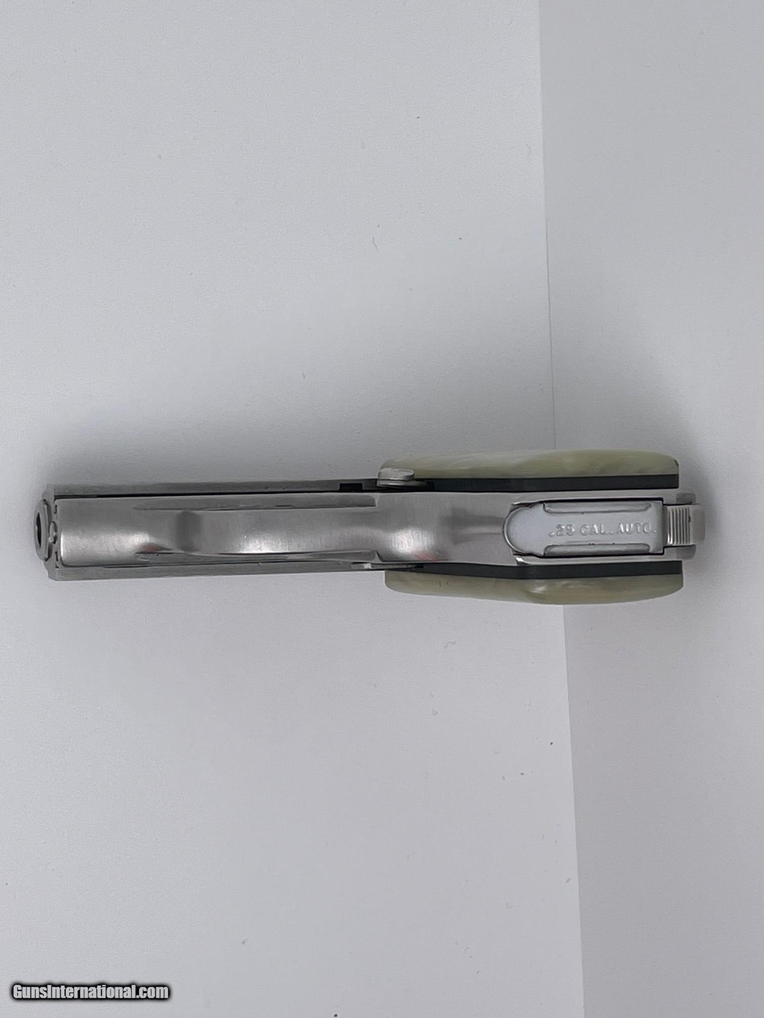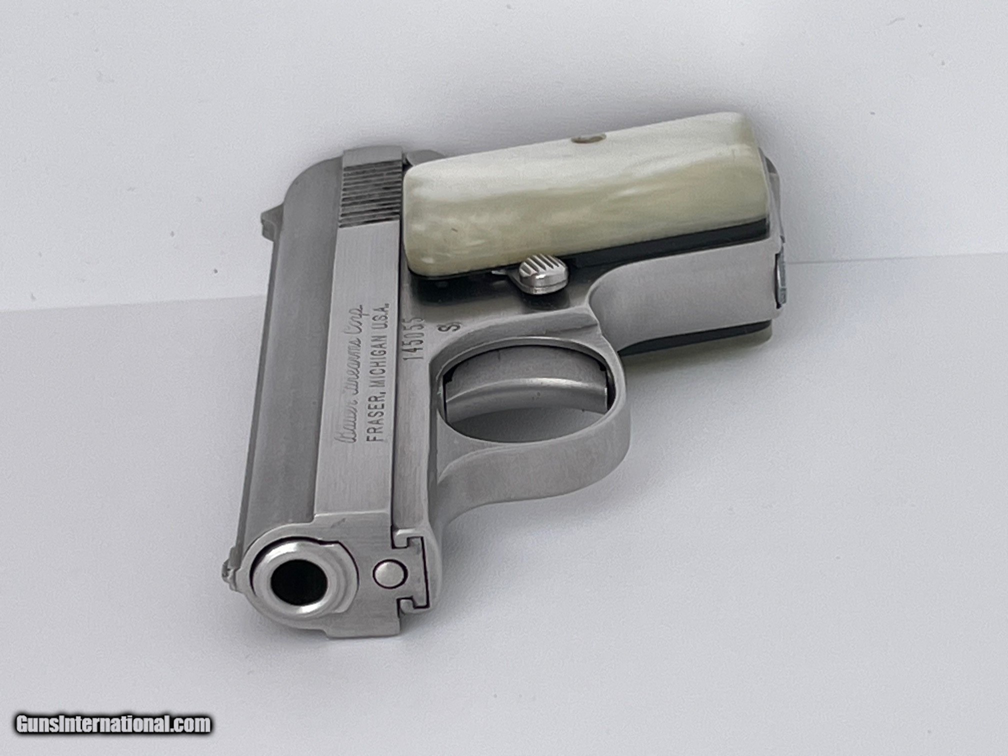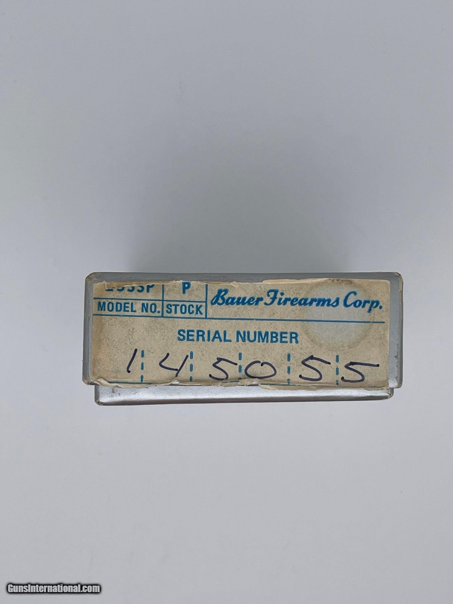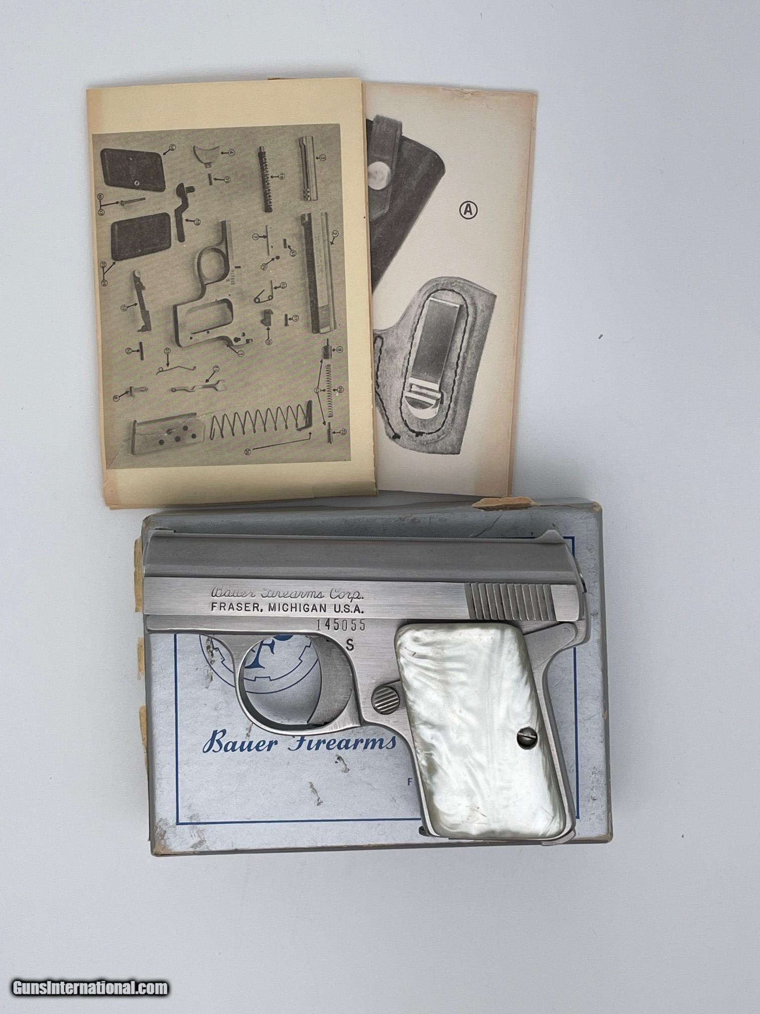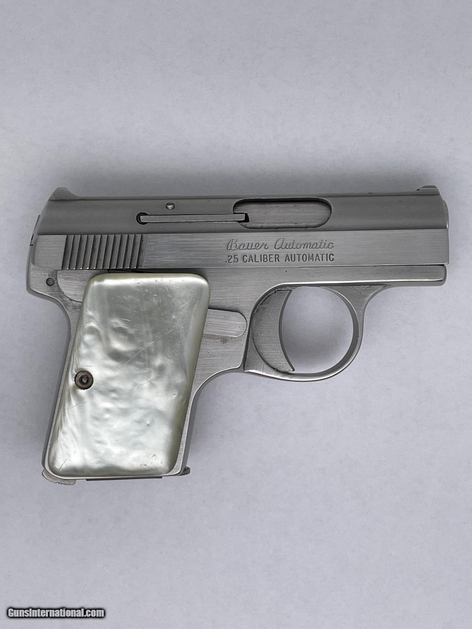 Description: This listing is for a stainless steel Bauer .25ACP baby Browning clone in excellent used condition. Comes with the number matching box, one factory six round magazine and paperwork. Selling from my private collection and will ship to your FFL dealer via UPS Second Day Air at a cost of $20. Add $25 if your dealer requires shipment from an FFL. No sales where prohibited, please know your local laws. Feel free to contact me with questions or for additional photos. SOLD Handgun Caliber: .25 ACP (6.35mm Browning, 6.35×16mmSR) Manufacturer: Bauer |