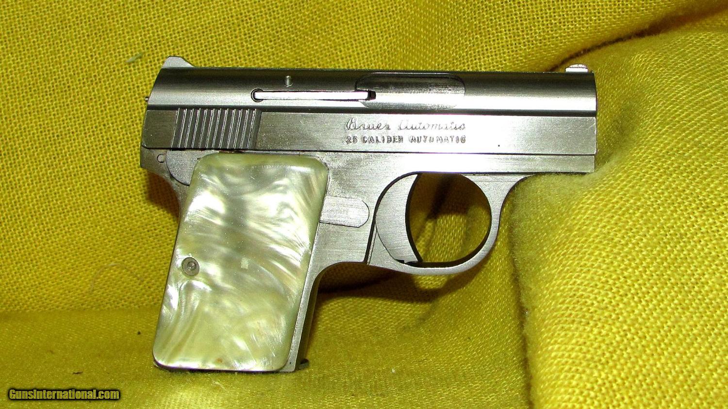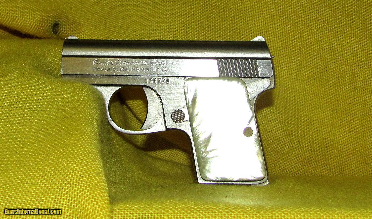 Description: BAUER model POCKET in .25 ACP CAL., with 2" barrel. Color STAINLESS STEEL. BAUER MODEL POCKET, BORE, GRIPS BOTH EXCELLENT, 98%+ FACTORY FINISH, COMES WITH ONE FACTORY MAGAZINE, LIKE NEW CONDITION. OUR NEW STOCK # D31425 Condition 98%+. Serial number 056728. SOLD |