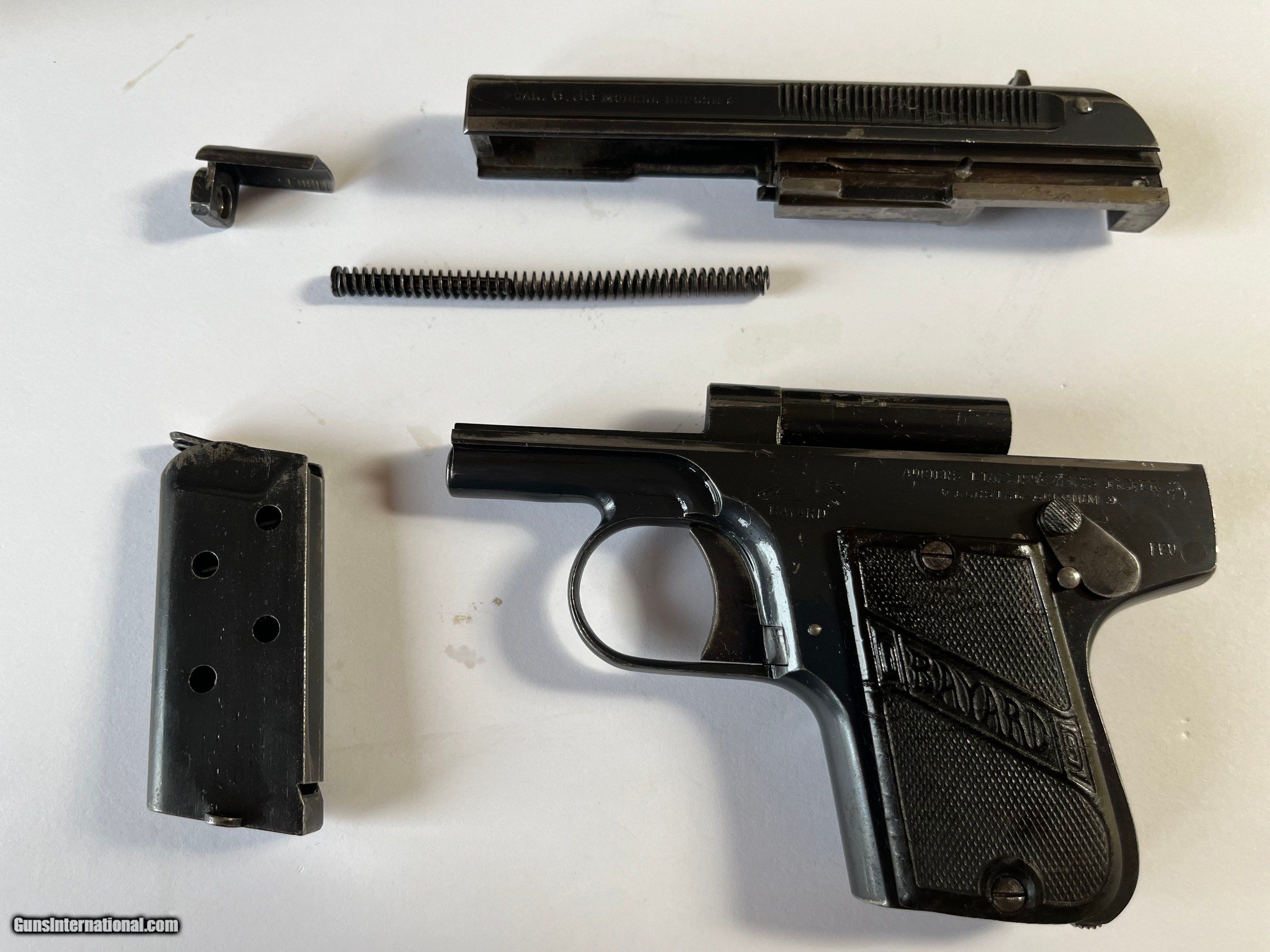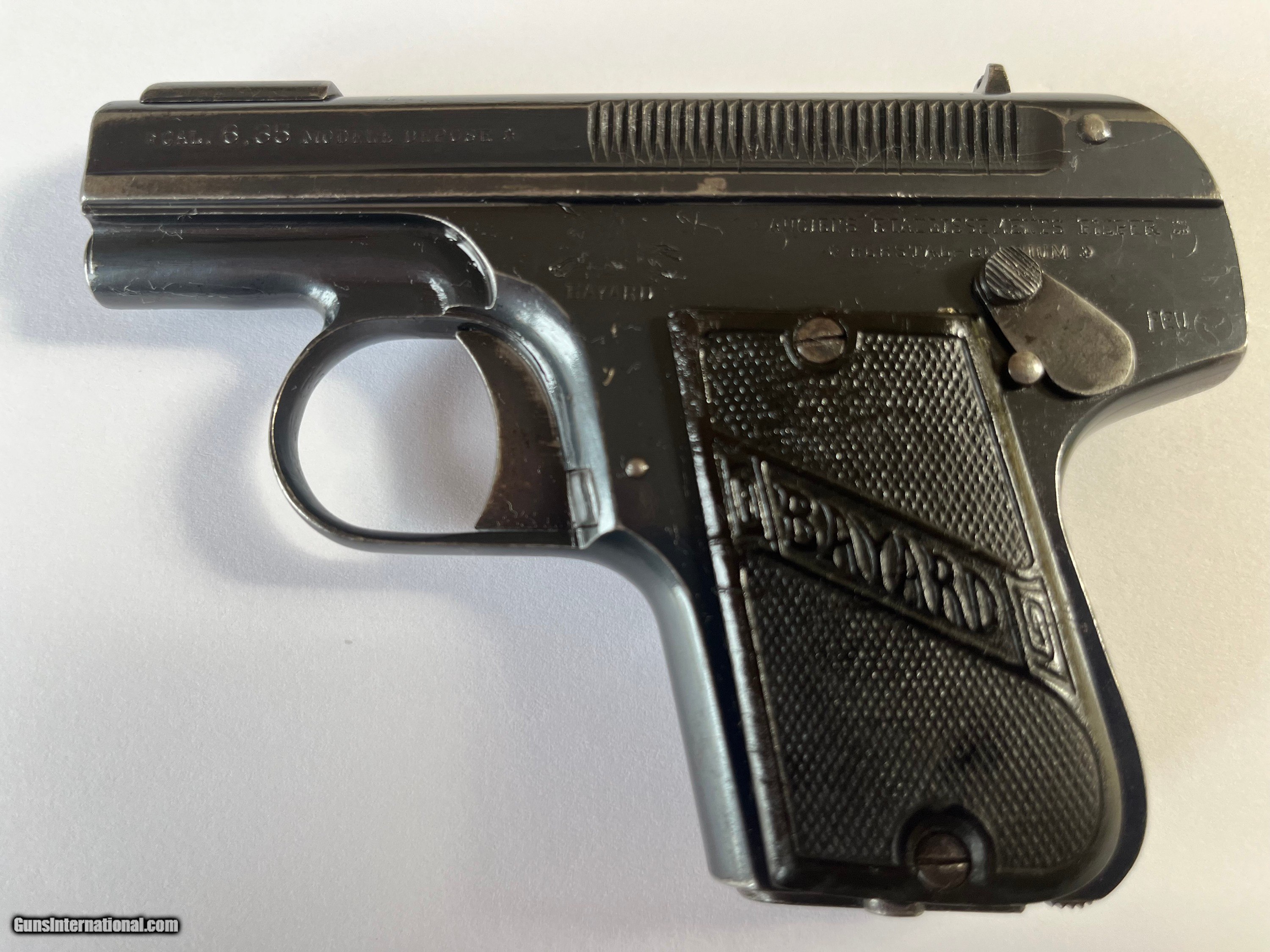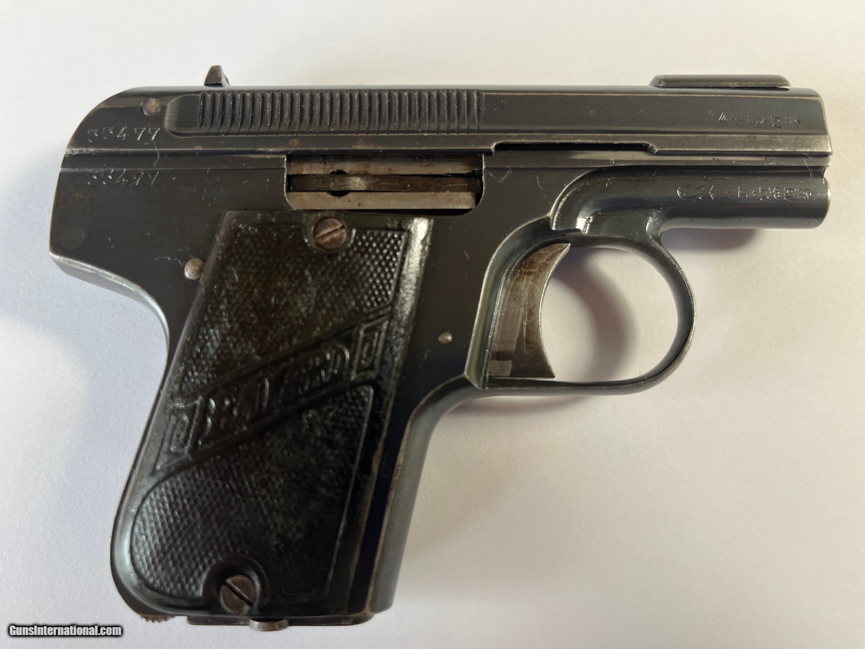 Description: For sale is a Bayard Self Loading Pistol in .25 ACP, commonly known as a Bayard 1908. I would date this to about 1915. The pistol retains about 96% of its finishing. I have test racked the pistol but never fired it. Comes with one correct magazine. Stored in a climate controlled safe. There were three calibers of these pistols made, including 25 ACP, 32 ACP and 380 ACP. They were considered very well made pistols for the era. I am also including a box of period vintage ammo. As with all vintage firearms, you should consult a firearms expert if you intend to fire any pistol of this vintage. Payment is by USPS Money Order or Bank Certified Check. The pistol ships when the payment clears. Shipping from my FFL to your FFL, no exceptions. Please see my other listings and contact me if you have any questions. Not for sale to states where not allowed. It is your responsibility to make sure you are legally allowed to purchase this. Curio/Relic: Yes Manufacturer: Bayard Pieper Model: 1908 Serial Number: 33477 Condition: Very Good for Age Metal Condition: Very Good for Age Bore Condition: Very Good Price: $650.00 Buy Now Contact Seller |