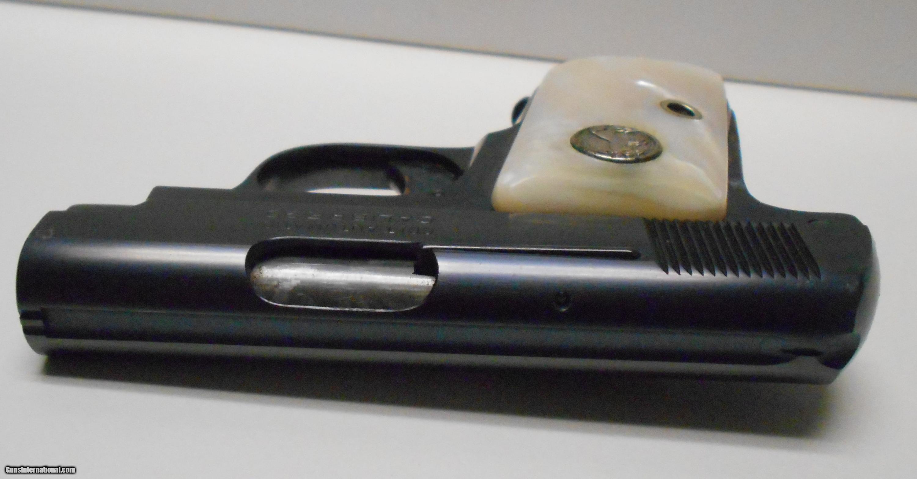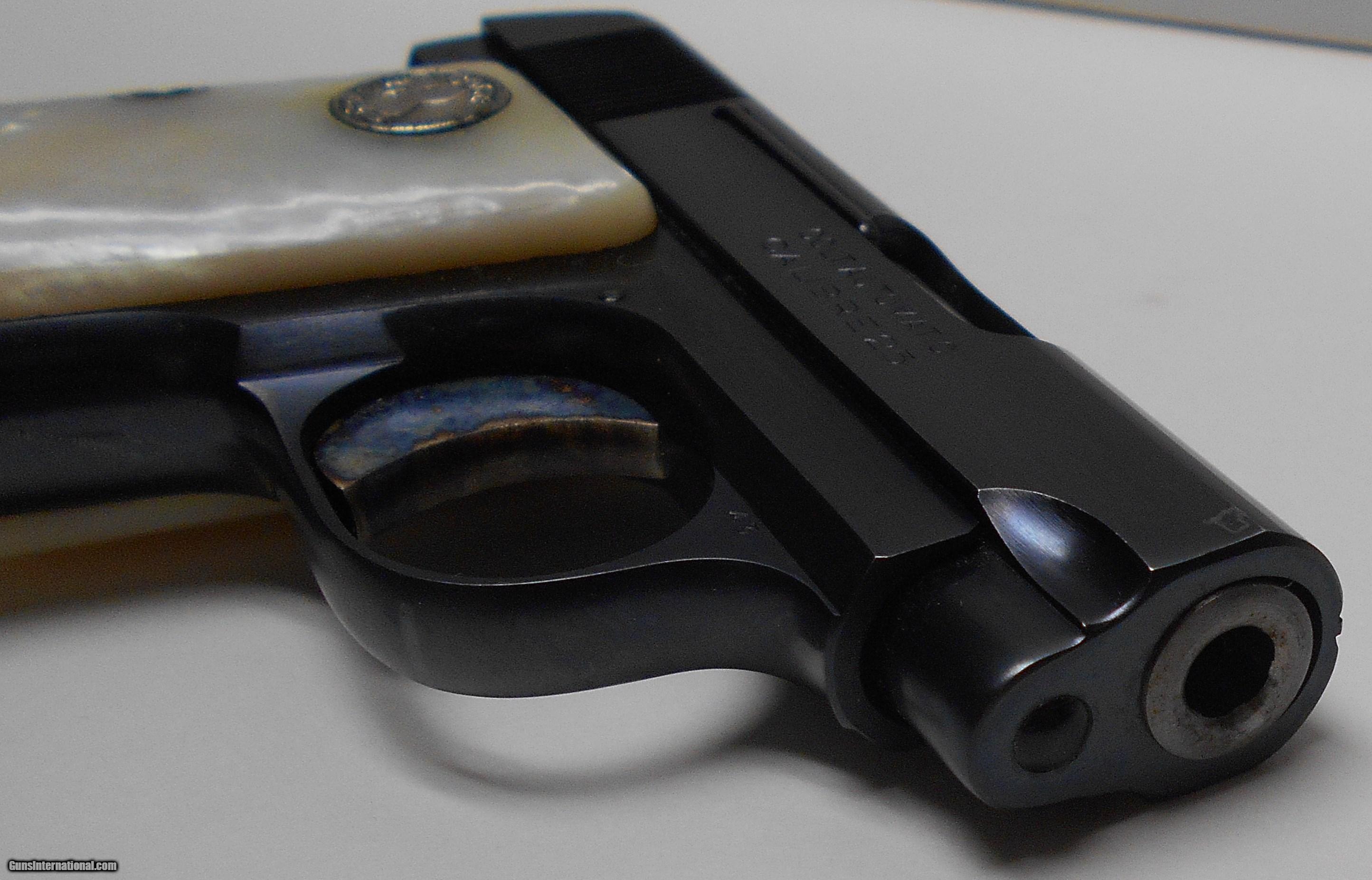 Description: I guarantee this pistol to be 100% correct, original, and untouched. This is a very nice Colt 1908 Model N .25 caliber semi-automatic pistol. It comes with factory pearl grips, an original numbered box, instruction brochure, and factory letter. It was shipped to Wolf and Klar of Ft. Worth, Texas. Shipping date was January 11, 1929. End label on the box says PEARL-BLUE. The original blue finish will rate 99% as will the original case color hardening. Action is smooth and tight. Bore is excellent. All markings are clear, correct, and original. This is a fine Colt. It will make an outstanding addition to any collection. I am new to Guns International, but have been on another well known for a long time with over 850 A+ ratings. Thought I would give it a try here. American Arms & Antiques SOLD Curio/Relic: Yes Manufacturer: colt Model: N Serial Number: 374891 |