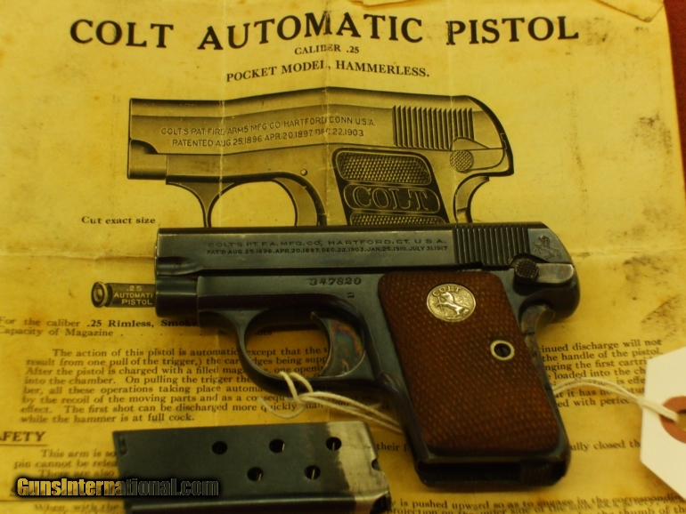 Description: Colt 1908 Vest Pocket Hammerless, 25acp. 98% overall, all original, with owner's manual, #347000, original wood grips and two tone magazine. SOLD |