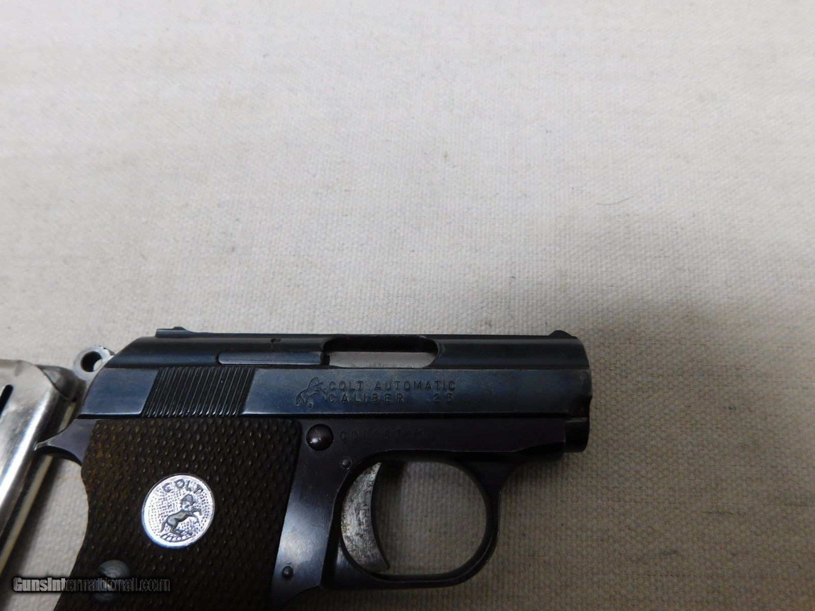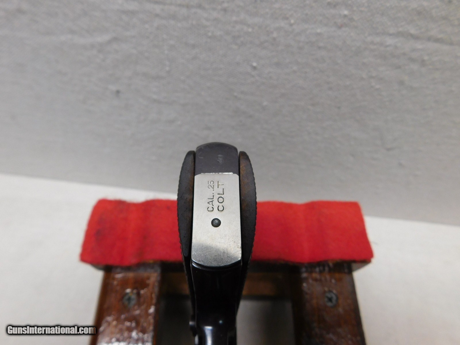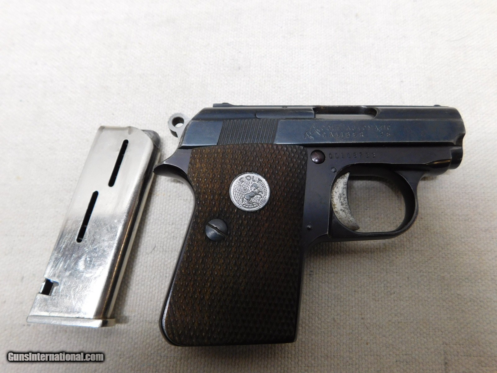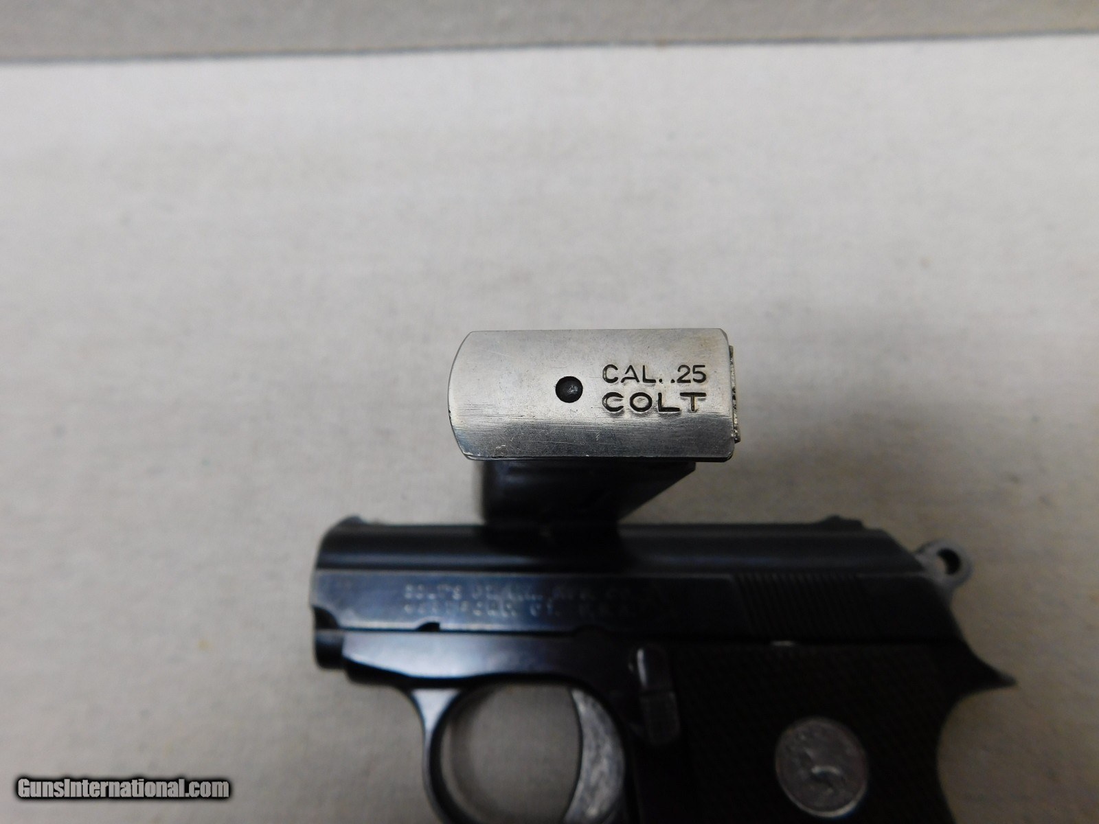 Description: Colt Automatic Cal.25 Model,25ACP,2-1\4" Barrel, Checkered Walnut Grips,Made in USA By Firearms International For Colt,About 95% Bluing with High Edge Holster Wear, Excellent Grips, Excellent Bore, Circa 1973!! Store hours Thurs-Fri-10AM-8PM Sat-9AM-12PM All Other times please leave a message,Thank You! No California Sales Lower 48 State Sales only Pa. Residents 6% Sales Tax applicable Shipping $ 35.00 SOLD Handgun Caliber: .25 ACP (6.35mm Browning, 6.35×16mmSR) Manufacturer: Colt Model: Auto 25ACP Serial Number: OD108733 Barrel Length: 2-1\4 |