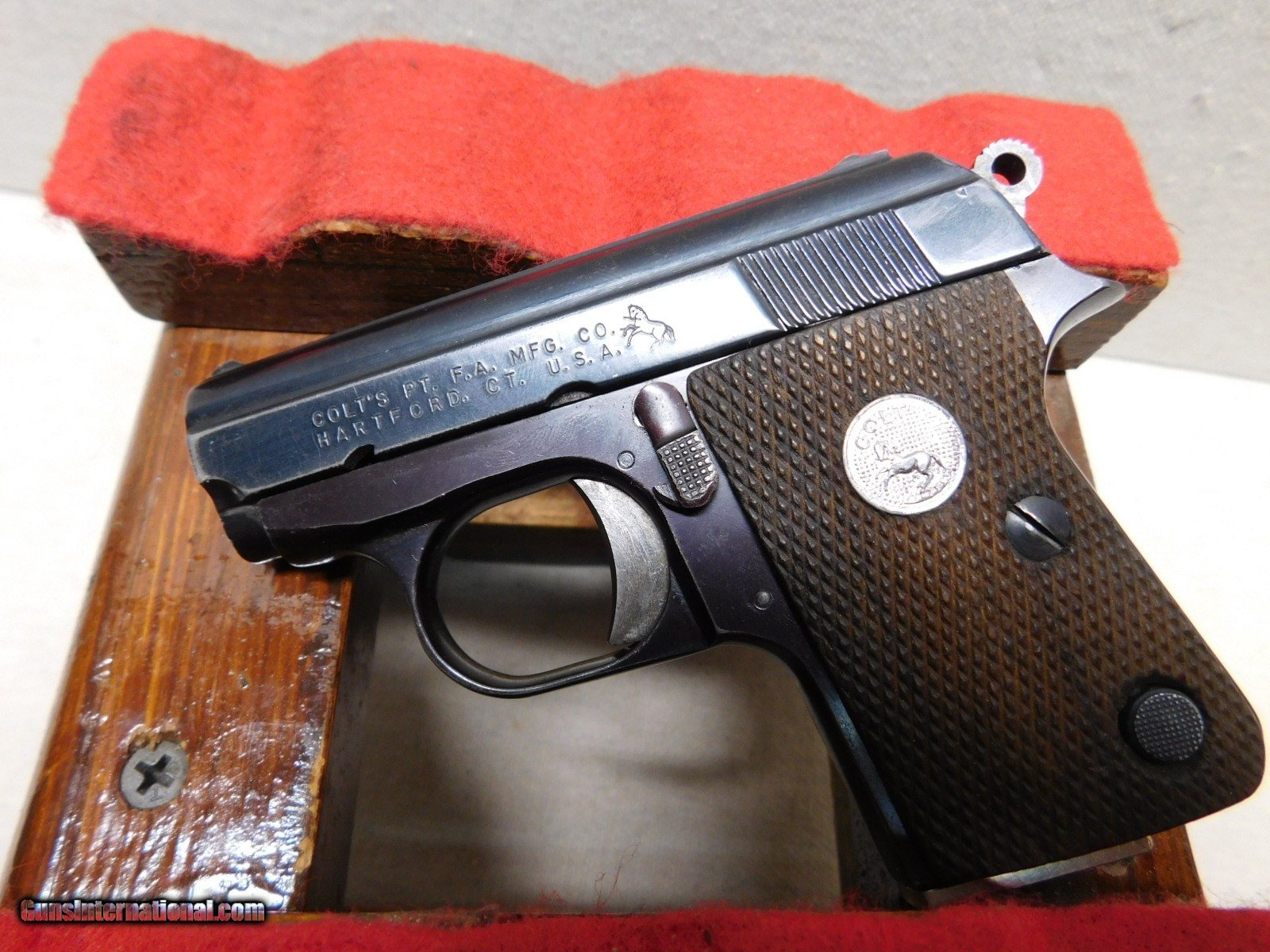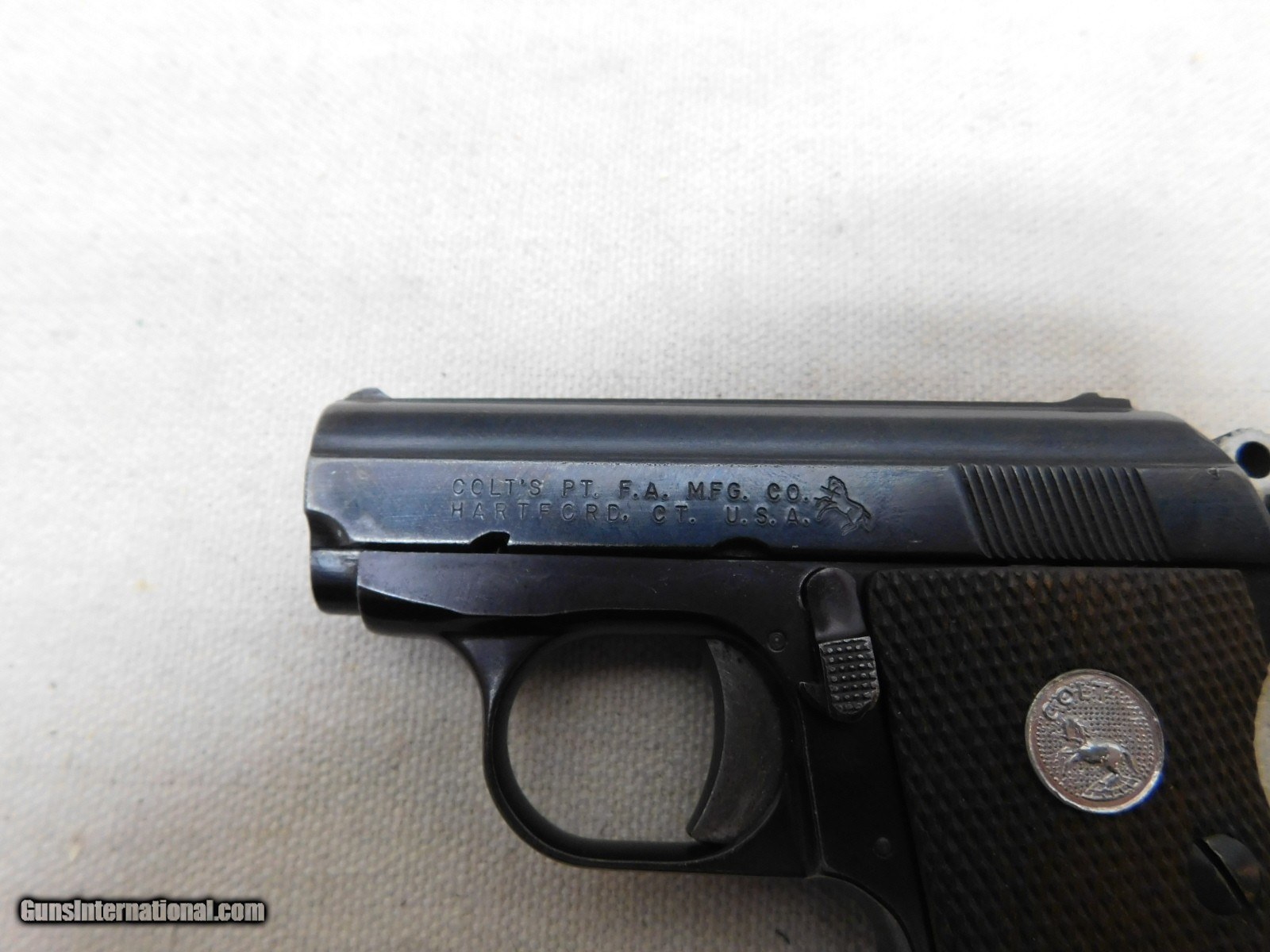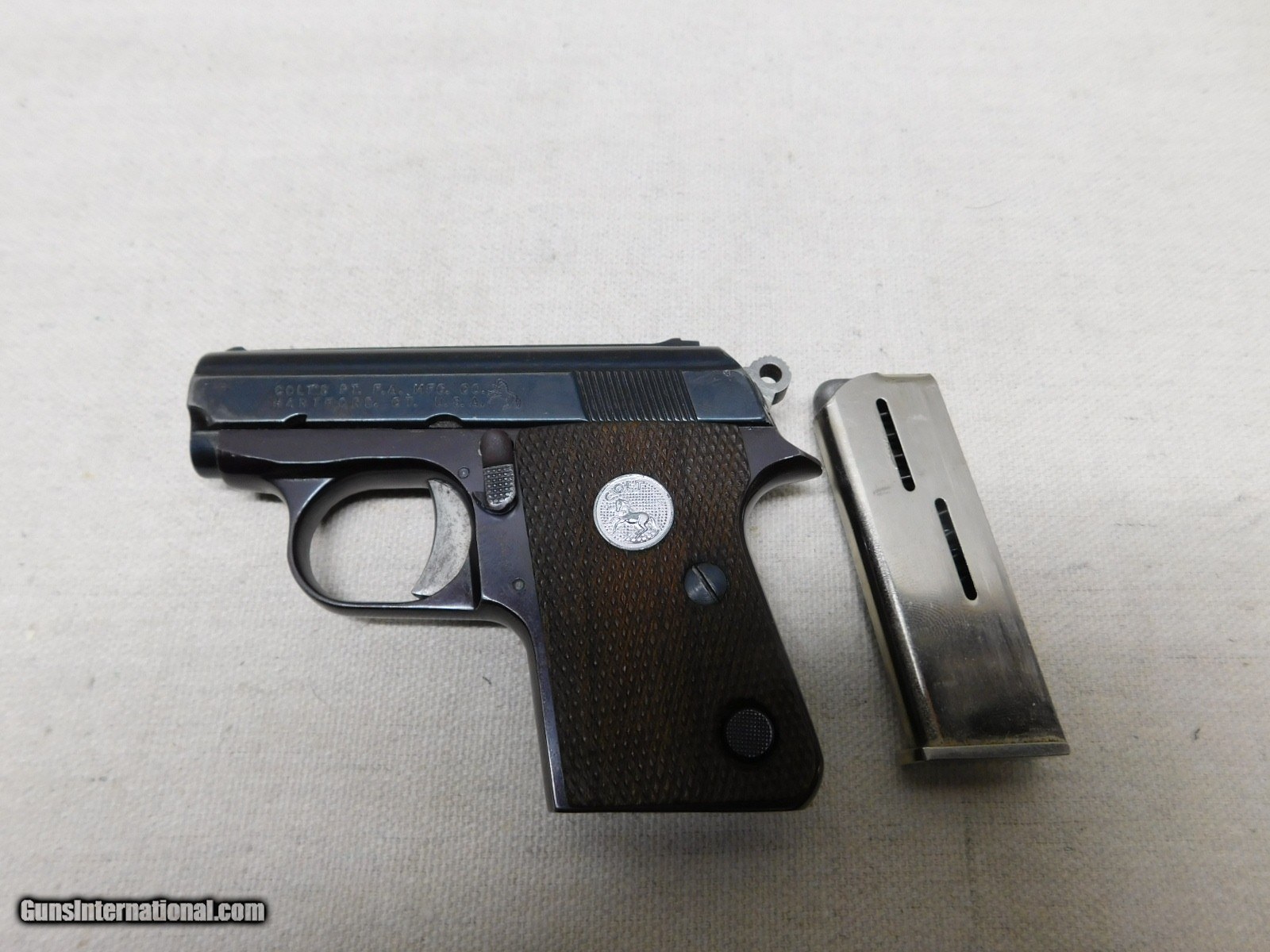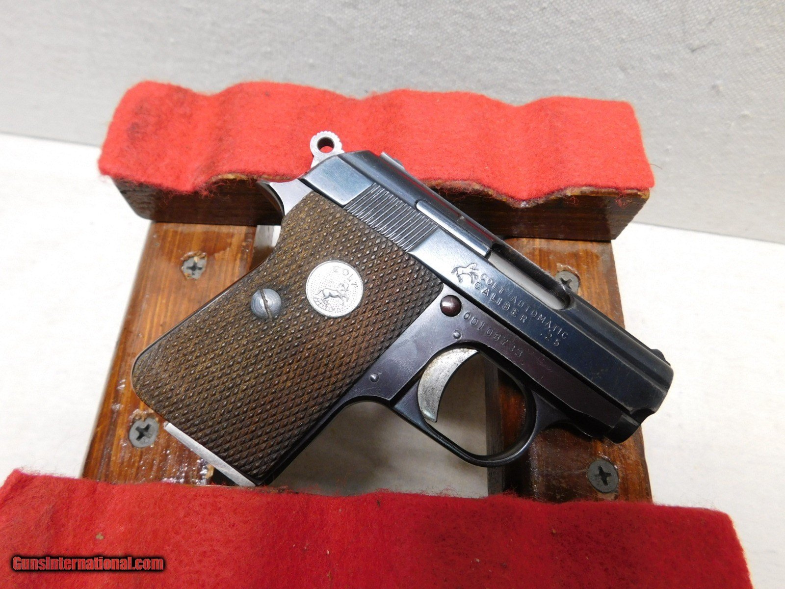 Description: Colt Automatic Cal.25 Model,25ACP,2-1\4" Barrel, Checkered Walnut Grips,Made in USA By Firearms International For Colt,About 95% Bluing with High Edge Holster Wear, Excellent Grips, Excellent Bore, Circa 1973!! Store hours Thurs-Fri-10AM-8PM Sat-9AM-12PM All Other times please leave a message,Thank You! No California Sales Lower 48 State Sales only Pa. Residents 6% Sales Tax applicable Shipping $ 35.00 SOLD Handgun Caliber: .25 ACP (6.35mm Browning, 6.35×16mmSR) Manufacturer: Colt Model: Auto 25ACP Serial Number: OD108733 Barrel Length: 2-1\4 |