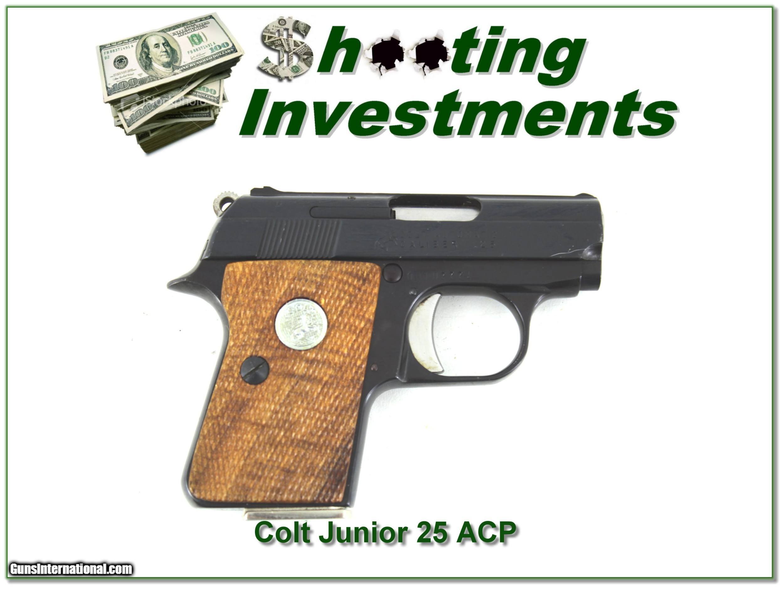 Description: This is a mint condition Colt Junior in 25 ACP. I believe it is unfired and I find no marks or signs of use. I only have the gun. I am selling this one on consignment and as such lay-a-way can’t be used. It does of course have the standard 3-day inspection. Shipping and insurance is $39. Please email me with any questions or larger pictures. (Consign your quality firearms with Shooting Investments for only 12%! Let me know if you have any you would like to sell!) 21-1173 Payment: Payment is by Money Order, Cashiers Check or Personal Check. I can now also accept Credit Cards (MasterCard, Visa, Discover & American Express) with a 3% convenience fee. Shipping: The shipping charge will be listed in each description. It is $39 for most firearms. Some heavy guns or those insured for over $2000 will be higher. Shipments to Alaska and Hawaii are higher because air shipment is required. Most firearms are shipped on Tuesday and Thursday and usually in 5 days of receipt of payment. We package all shipments carefully and insure them. Optics are shipped Priority Mail and most other non-firearm shipments are shipped First Class. Returns: Our return policy is simple. If for any reason you are not pleased with your purchase, you may return your item for a full refund of purchase price. Ammunition cannot be returned. It is important to us that you are happy. Guns cannot be fired or dissembled before returning them and they must be returned in the same condition as received. Notification of a return must occur with-in 3 days of receipt at your dealer. Shipping, convenience and dealer fees are not refundable and are the responsibility of the buyer. Lay-a-way: If needed, we offer a 60 day lay-a-way option on most firearms. It is 1/3 now, 1/3 in 30 days and 1/3 in 60 days. Lay-a-way firearm sales are final and if not completed the first payment cannot be returned. Consigning your firearms with Shooting Investments: We will help you get top dollar for your firearms. While most local guns shops charge 20% or more, our fee is only 12% with a minimum of $75. At your local gun shop it might take months to sell. Selling on-line provides instant access to thousands of interested buyers. You won’t find any other on-line dealer willing to sell your firearms for only 12% or listing every gun on 3 separate s. Selling through an House typically costs the seller 15% and the buyer an addition 15% (so 30%) and you have to wait several months to sell and longer to receive funds. If properly priced, we will sell your firearms in a few weeks. Send us an email or give us a call and we’ll explain how easy it is for you to get top dollar. Trading: Trading for use is really just buying your gun to re-sell. If you have a gun you want to trade, please email a picture and we will let you know what we can give or it. You will always get more if we sell it for you on consignment. Help for California Buyers: We are happy to ship to California. It is the buyer’s responsibility to make sure any item you buy is legal in your state. We are also happy to help with your purchase of a firearm from someone other than us. If you see a gun you would like to buy but the seller can’t or won’t ship to California they can ship to use and we’ll then ship it to your California dealer. The cost for this service is only $30 + shipping. Let us know if we can help! SOLD |