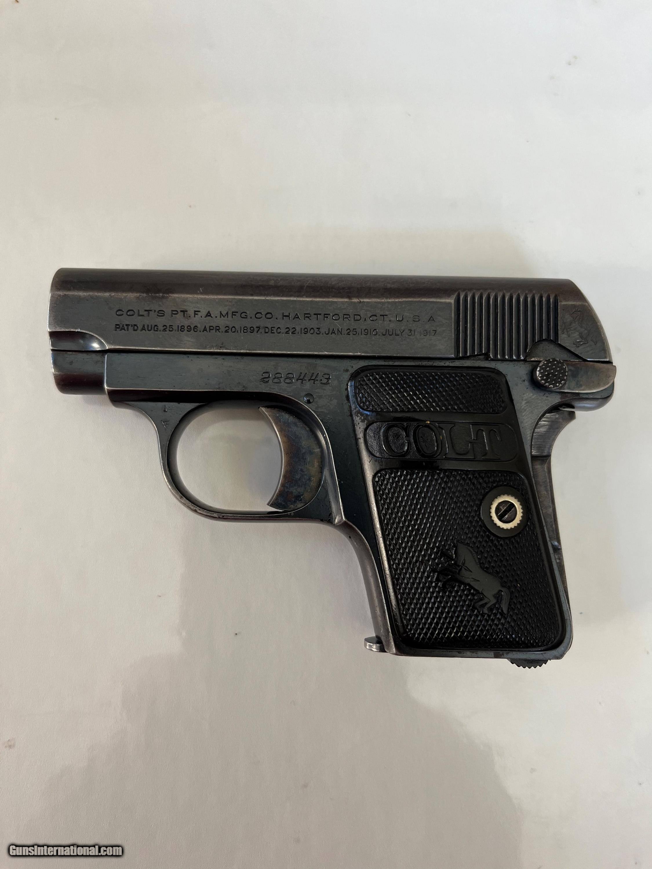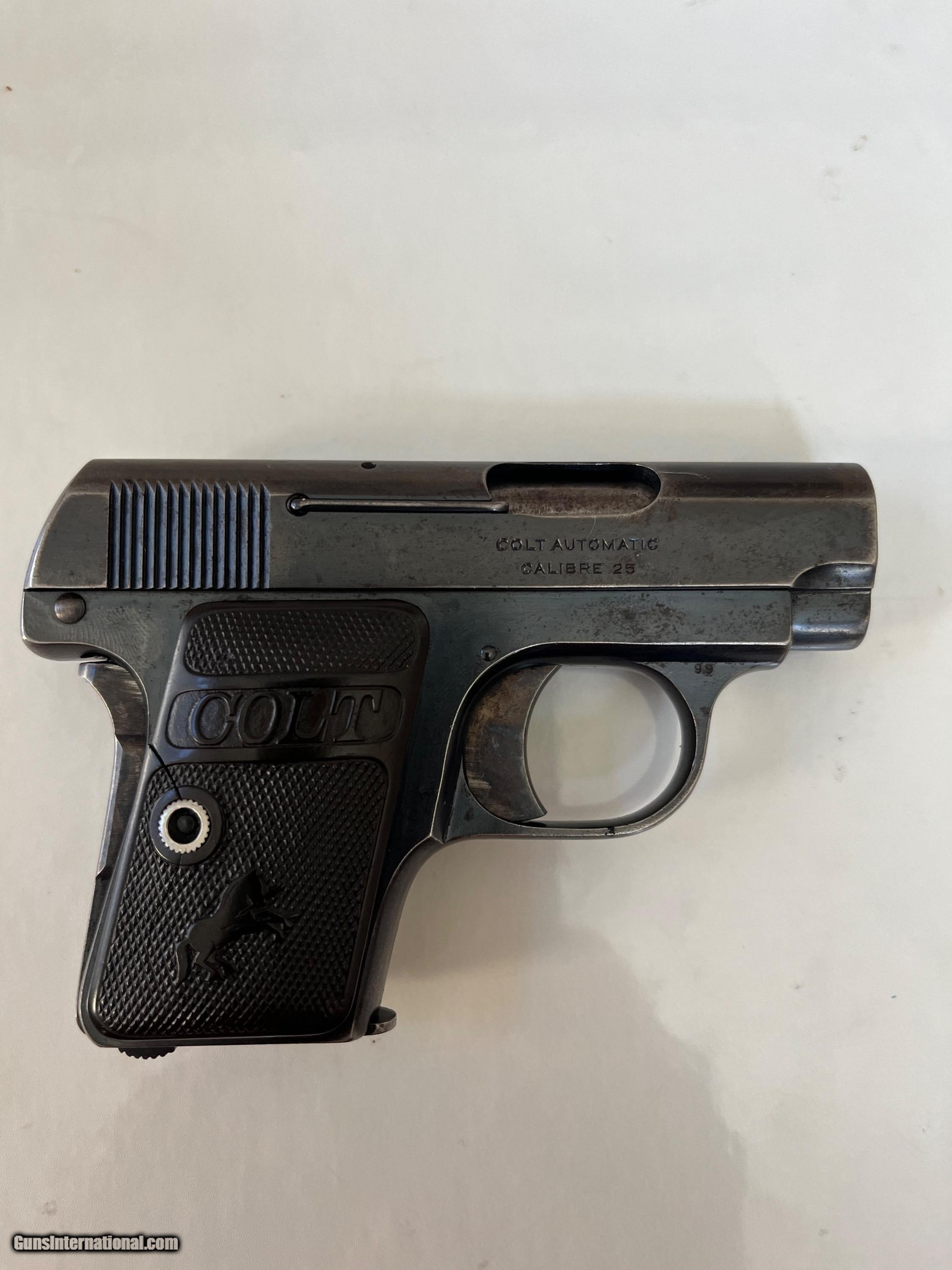 Description: Colt Semi auto, 2 inch barrel chambered in 25 ACP caliber with most of the original blue finish remaining and some light peppery oxidation that is mostly concentrated on top of the frame and exposed barrel under slide. Nice case colors on the trigger and grip safety. 2 Piece checkered hard rubber Rampant Colt grips. Small crack on right side. Nice markings. Good bore. 6 shot magazine. Should make a fine shooter or carry gun. Made in 1921. Respectable Colt for being over 100 years old. SOLD Curio/Relic: Yes Handgun Caliber: .25 ACP (6.35mm Browning, 6.35×16mmSR) |