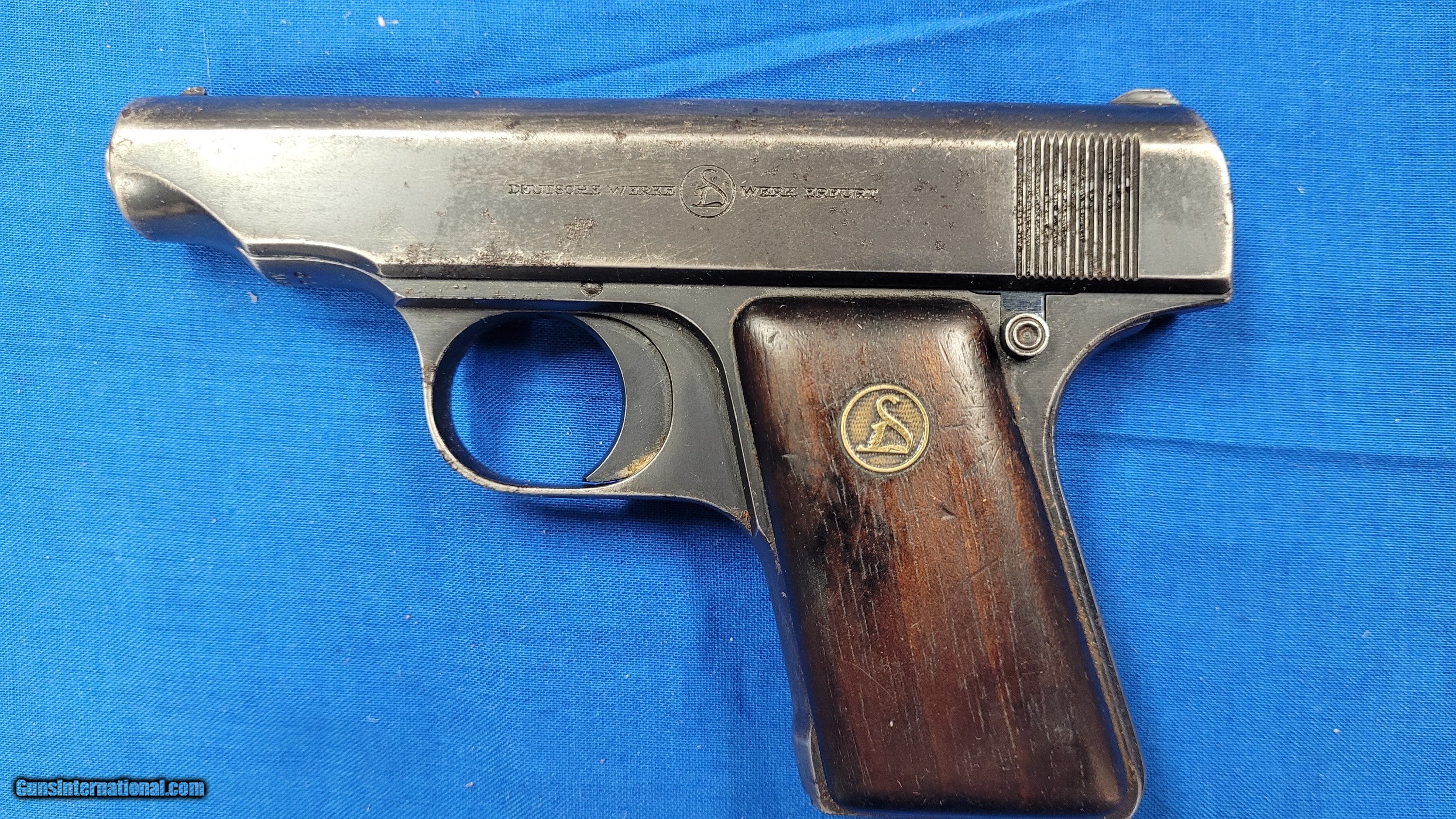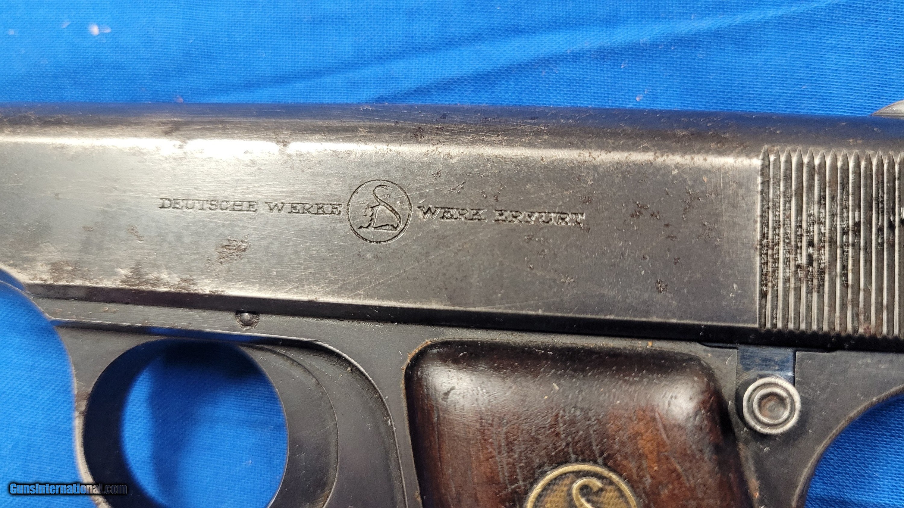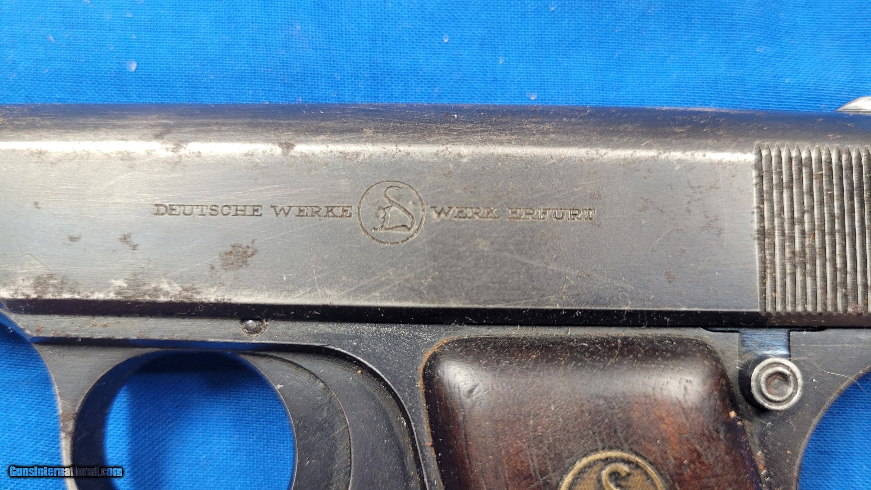 Description: This German pistol is chambered in 25 ACP is an ortgies patent. Magazine capacity is 8 rounds. Not sure of the year of manufacture but sometime after the first World War. The gun has light pitting and light rust spots on the slide and frame. I have oil them but they are still visible. The handgun appears to function and the back strap safety is working. I don't know much else about the pistol. I will not sell this pistol in states or jurisdictions where it is not allowed. Please know your local firearm laws before you purchase this pistol. Shipping is $40 flat fee conus. K9 SOLD Handgun Caliber: .25 ACP (6.35mm Browning, 6.35×16mmSR) Manufacturer: Deutsche Werke Werk Erfurt Model: Ortgies patent |