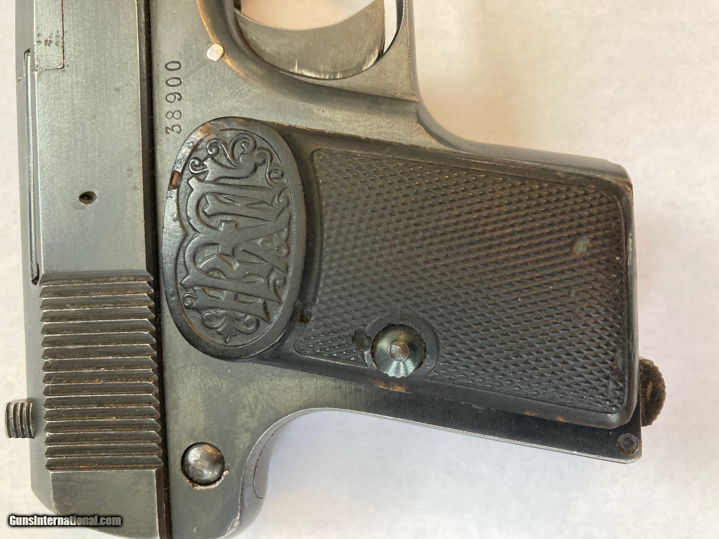 Description: This highly collectible and well-made German pistol was designed to compete with the FN 1906 (and Colt 1908) as it is nearly identical in size and profile, although it does not have the grip safety. The design makes field stripping fast and easy. This model is the Type IIB variant. Markings are clear and distinct. The bluing shows edge wear but is very good overall. The grips appear to be original and show minor wear, the right one more than the left, but neither one has any large chips or cracks. The magazine sticks and is hard to remove but everything functions as it should. Serial #38900. Payment by USPS money order only. Shipping $35 from my FFL to yours. SOLD Handgun Caliber: .25 ACP (6.35mm Browning, 6.35×16mmSR) |