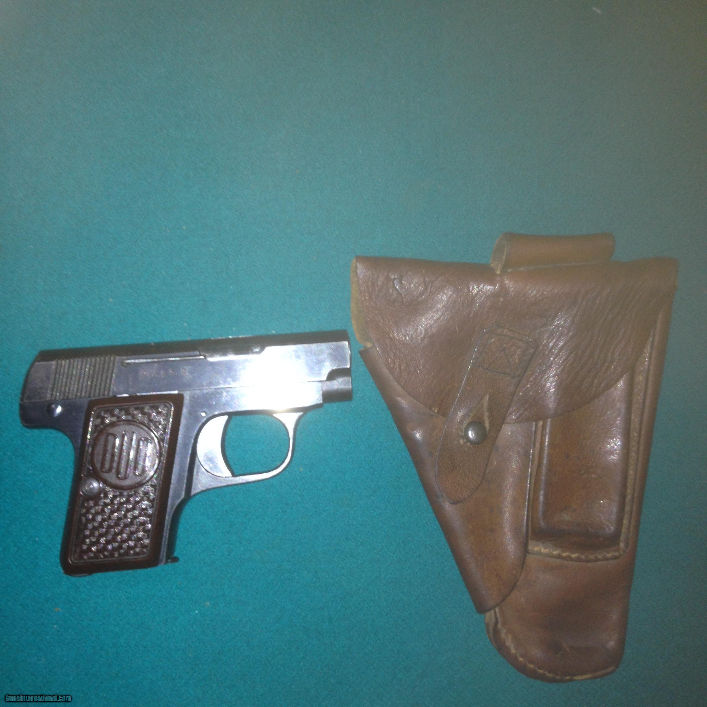 Description: 1944 Duo 25 acp (6.35mm) very good condition. Comes with Leather Holster( reworked holster) 1 magazine Taken from German officer in 1944 SOLD Manufacturer: duo Serial Number: 97458 |