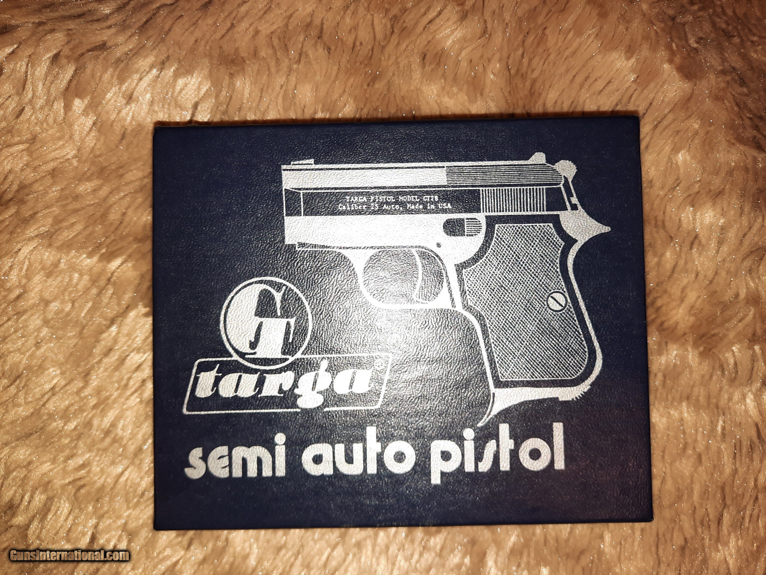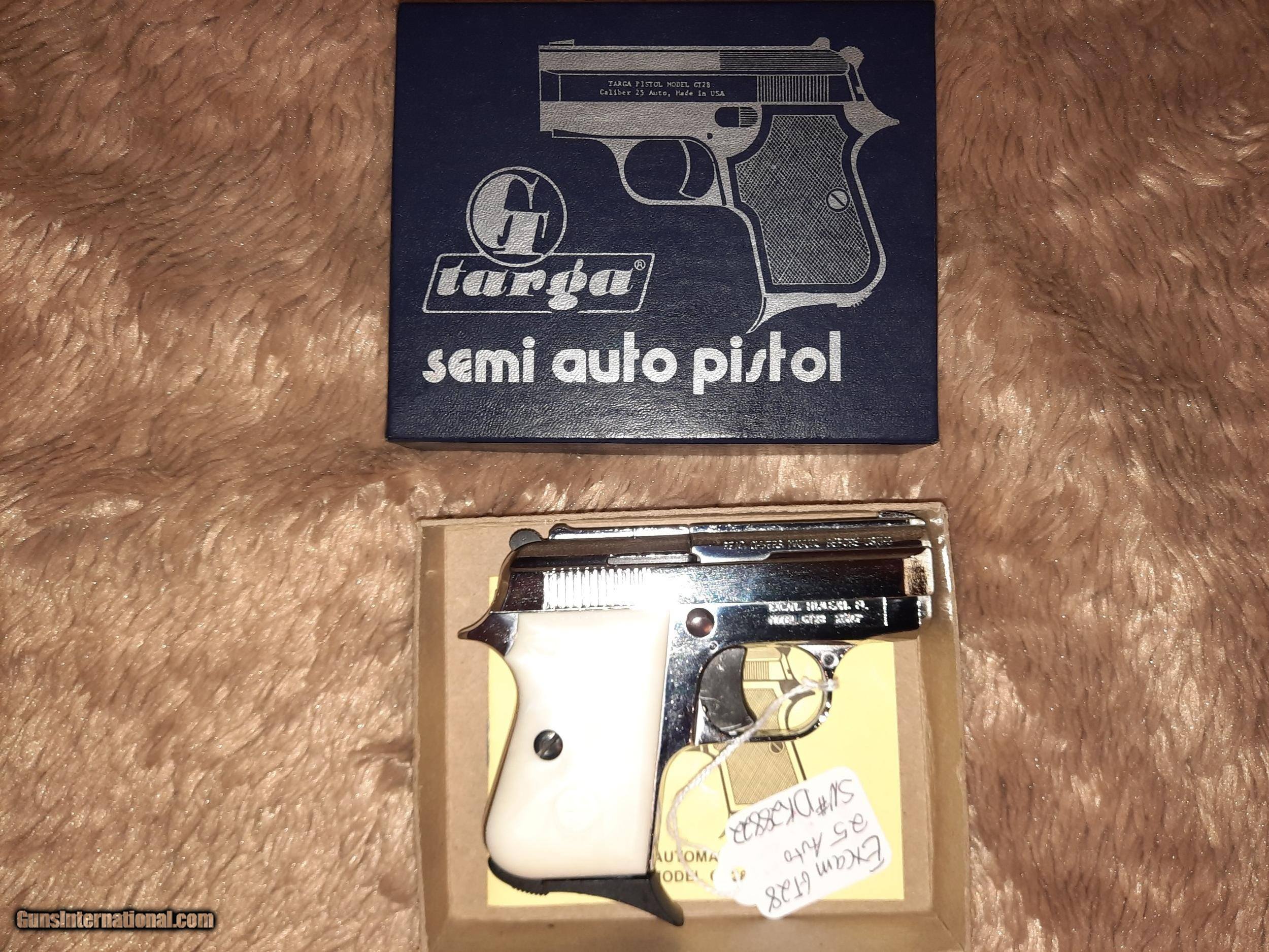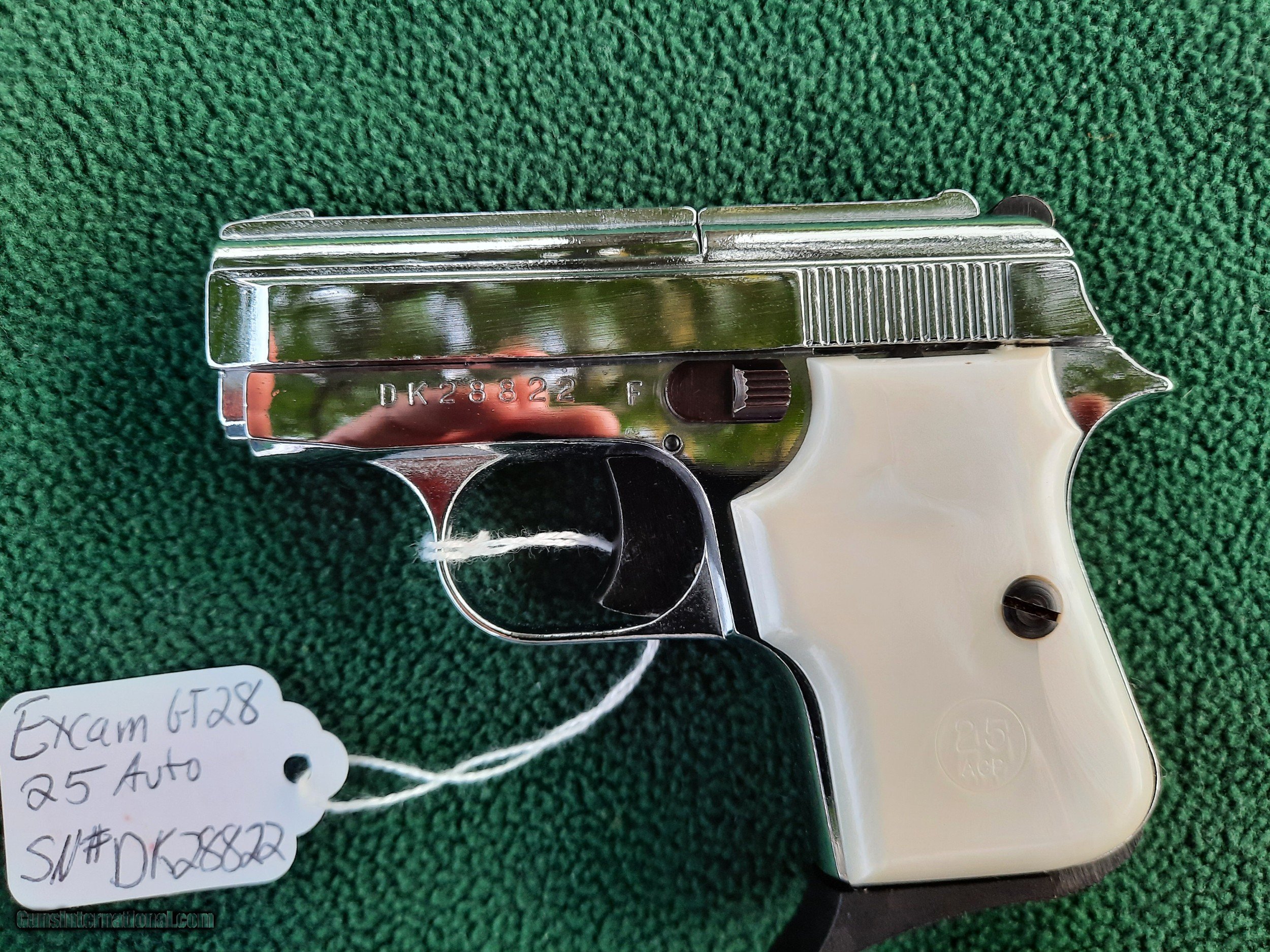 Description: SALE PENDING Excam Targa GT 25 Auto, nickel, imitation pearl grips, nib SOLD Handgun Caliber: .25 ACP (6.35mm Browning, 6.35×16mmSR) |