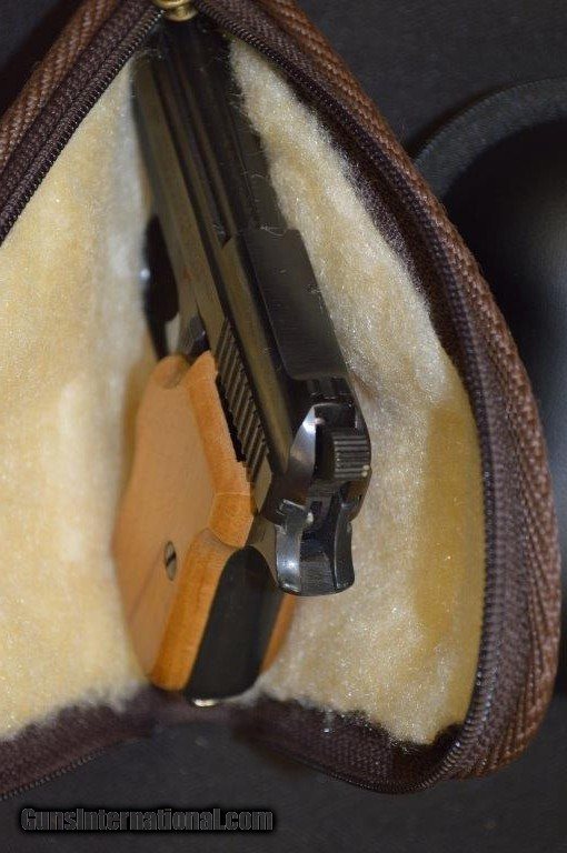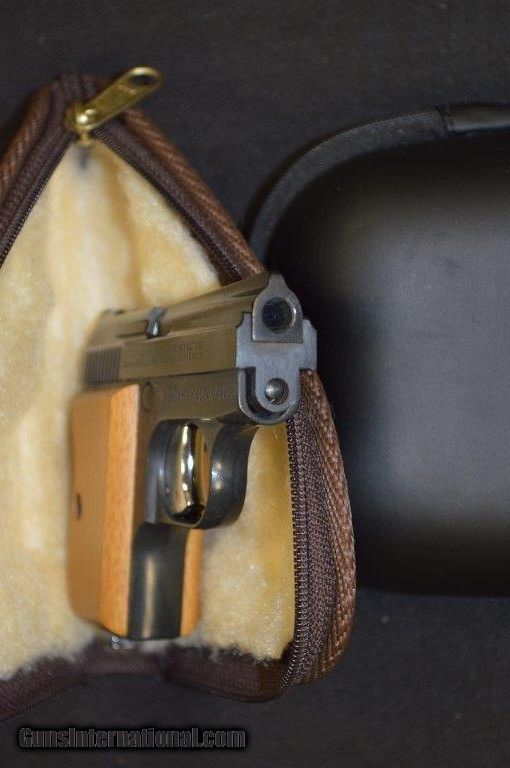 Description: The Excam Model GT 27 of Hialeah, Fl. is a pocket pistol in .25 acp and was manufactured by Armi Tanfoglio Giuseppe, located in Italy. The firm began making multiple variations of the line in various calibers: .22 Short, .22 Long, .22 L.R., 6.35 mm (.25acp) and 7.65 mm (.32 acp) as well as various finishes: blued, stainless, gold wash, etc. This pistol is the blued finish and wood grips. It is in excellent condition with a bright bore and a smooth action. There is no visible rust or pitting and the pistol still wears the original grips. The grips have darkened some over the years since this little pistol first left the factory in Italy. The pistol does come with the pouch shown which is in excellent condition for its age and does not have any rips or tears. If your in the market for a nice collectible, vintage Italian pocket pistol this would be an excellent choice. Picture taken without the 6 shot magazine in but it is part of the package. SOLD |