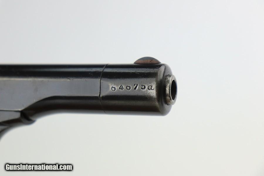 Description: This is an excellent example of a FN Browning Model 1922 sold in the commercial market in the 1940's. It is all matching and has the proper "Eagle N" commercial proofs. It has retained about 95% of its original finish. The majority of the wear is around the muzzle, but there is also very minor wear on the high edges of the slide. Comes with minty wood grips and a proper magazine. Excellent, shiny bore with strong rifling. SOLD Curio/Relic: Yes Handgun Caliber: .32 ACP (7.65x17mm Browning SR) Bore: 9/10 Condition: ~95% |