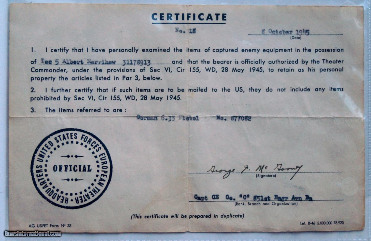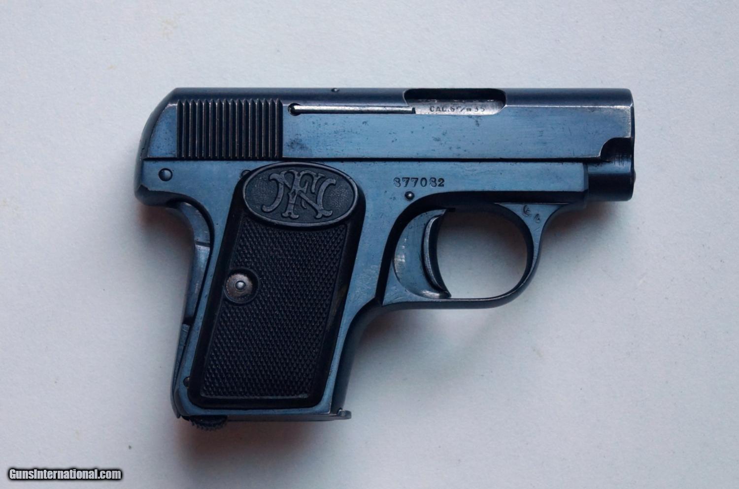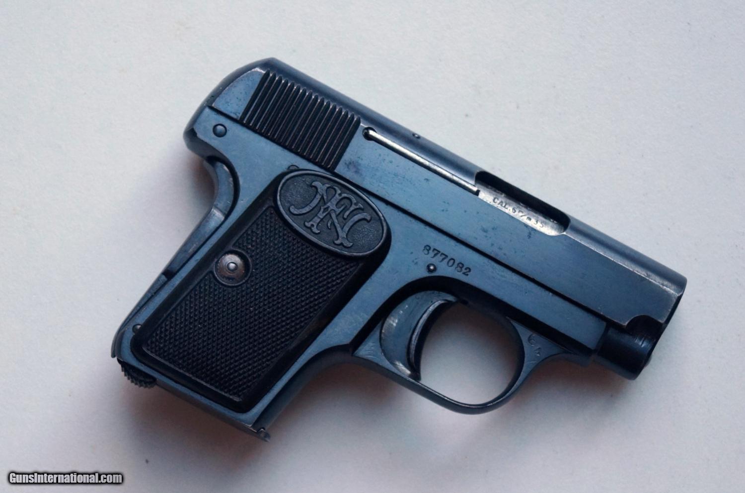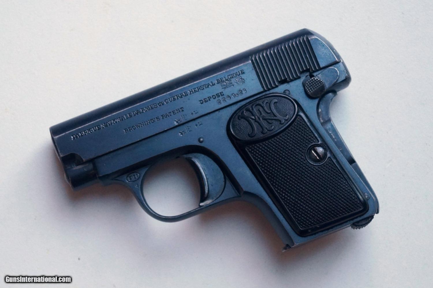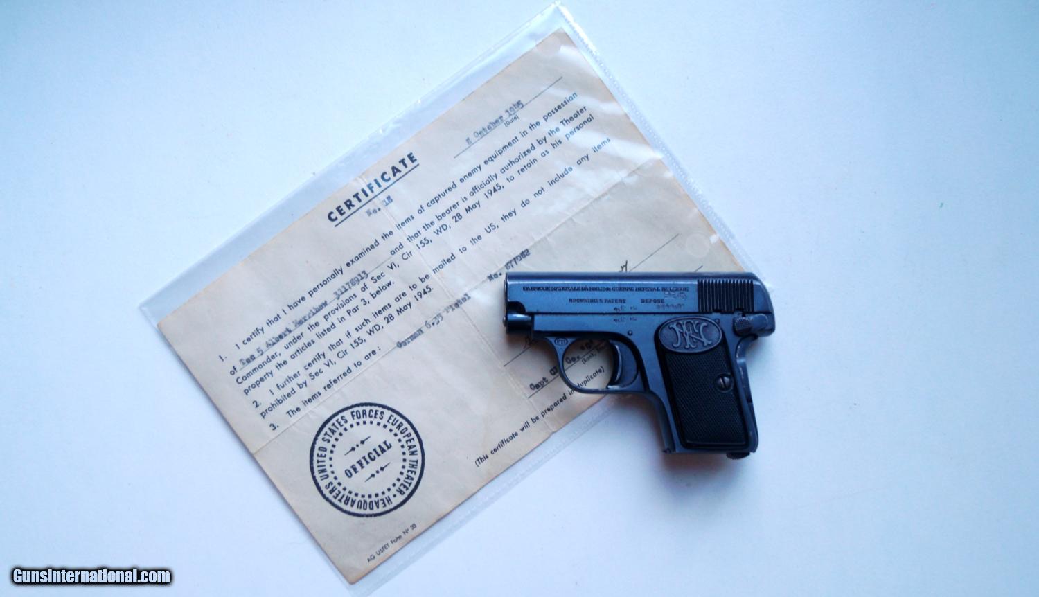 Description: THIS IS A MODEL 1906 FN / BROWNING, 6.35 MM. THE PISTOL IS IN EXCELLENT CONDITION. ALL ORIGINAL, NUMBER MATCHING, VERY GOOD BORE AND GRIPS, MECHANICALLY CORRECT AND TIGHT. THE MODEL 1906 WAS OFTER REFERED TO AS THE " BABY BROWNING" AND WAS ORIGINALLY REFERRED TO AS "PISTOLET BROWNING 6.35MM" THEY DON'T COME BETTER THAN THIS. NOTE: THE PISTOL COMES WITH THE ORIGINAL WWII DISCHARGE CERTIFICATE. MILITARY OFFICERS OFTEN CARRIED THESE PISTOLS AS AN EXTRA CONCELLED FIREARM. SOLD Curio/Relic: Yes |