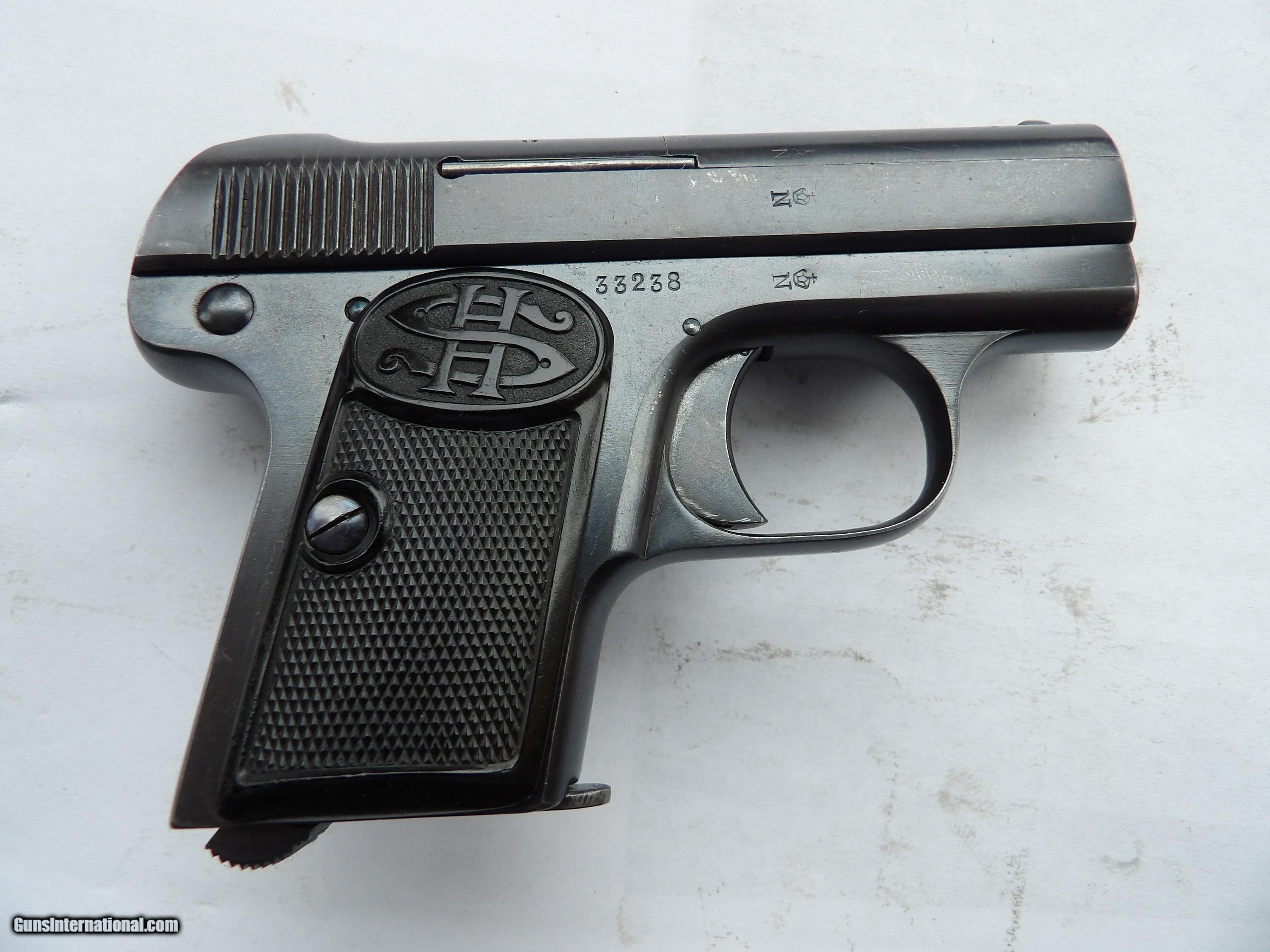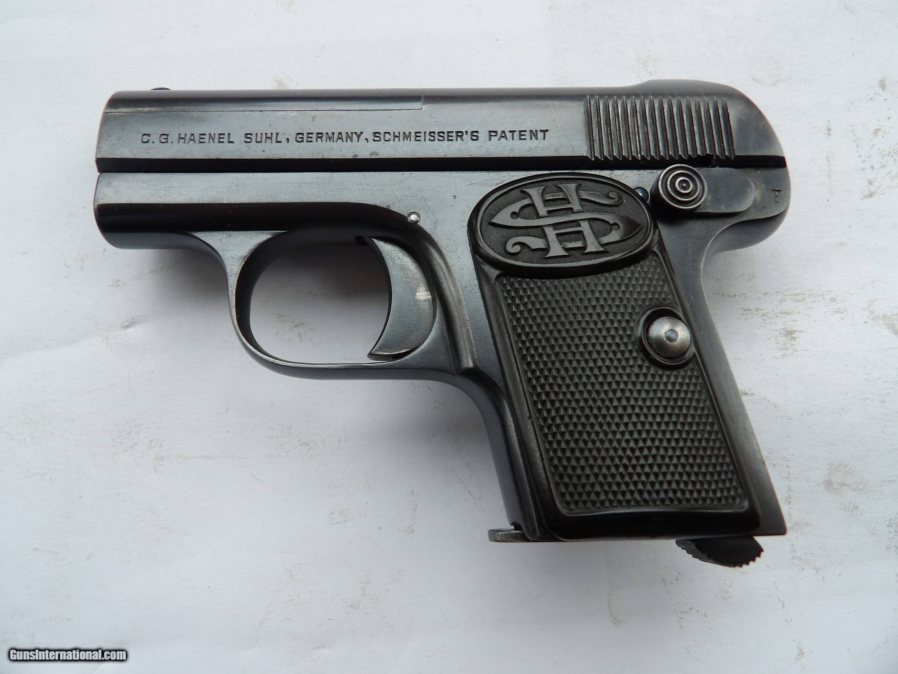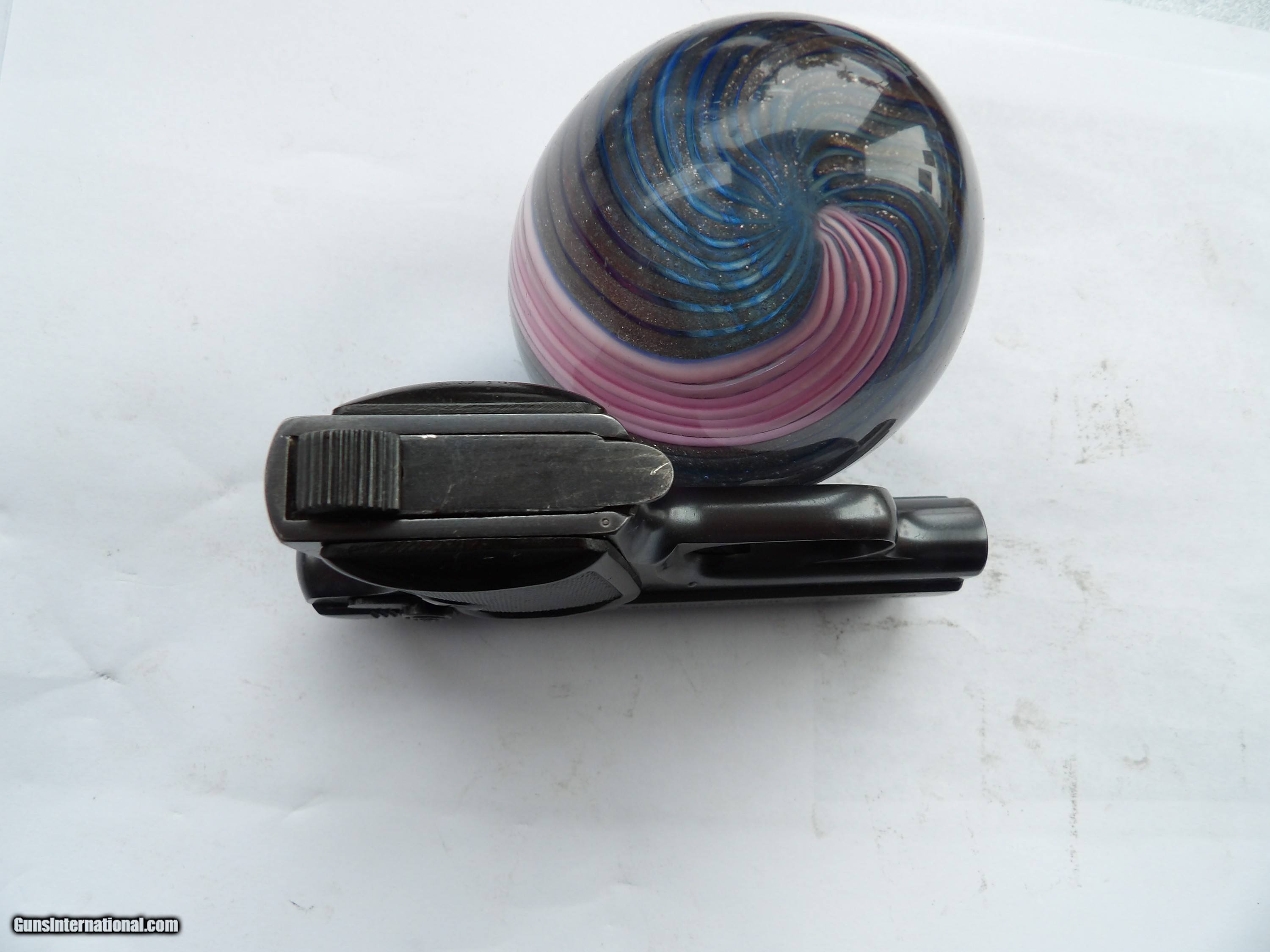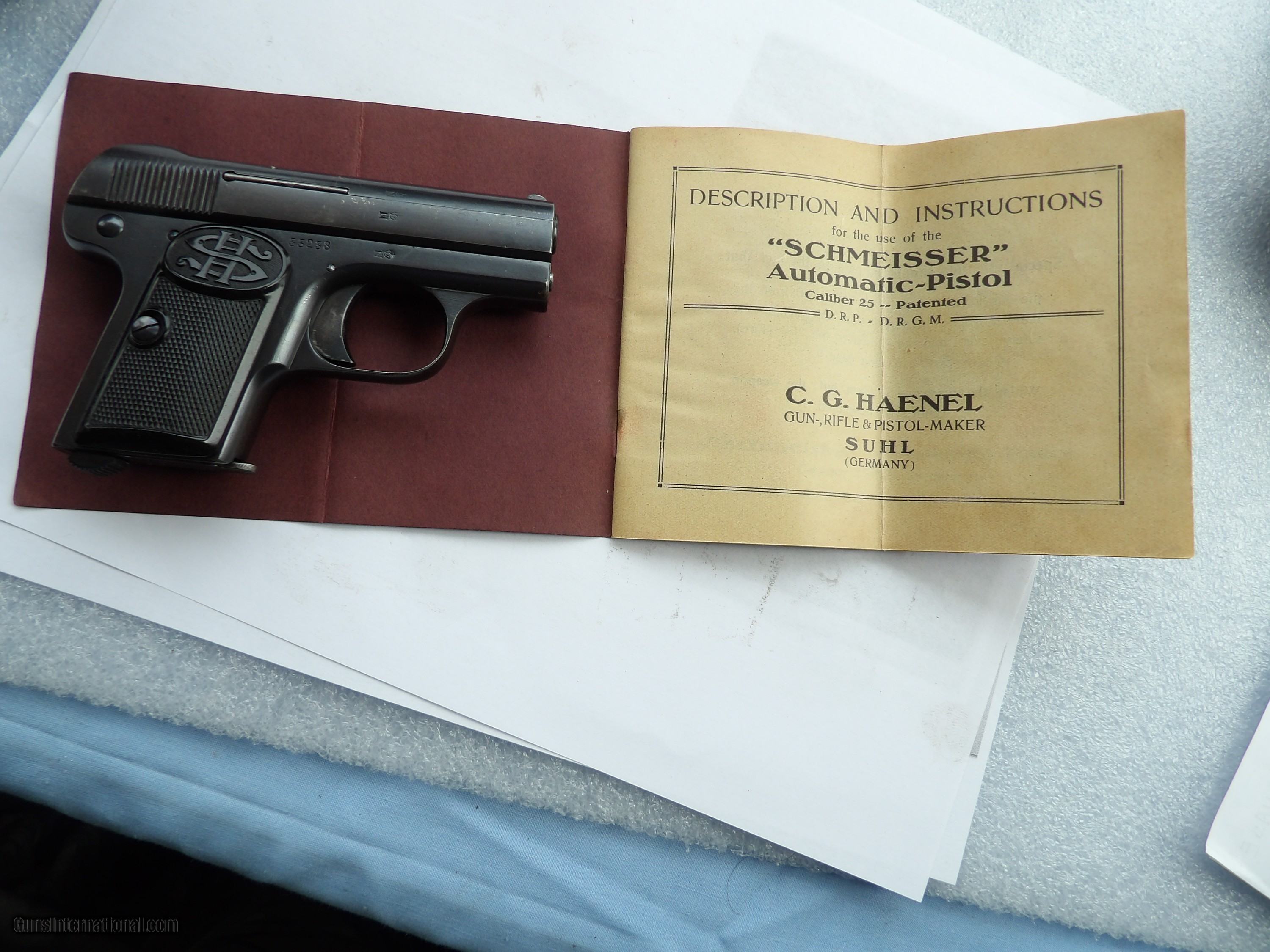 Description: SEE THE PICTURES OF GERMAN CAL. 25 ACP C.G. HAENEL SUHL. GERMANY, SCHMEISSER'S PATENT PISTOL IN ORIGINAL BOX IN EXCELENT 98% ORIGINAL FINISH, ALL MATCHING ORIGINAL PARTS AND BRIGHT AND SHINY BORE BARREL. THIS PISTOL WAS PRODUCED FROM 1921 TO 1934 IT IS A VERY HIGH QUALITY, VERY DESIRABLE AND VERY ACURATE GERMAN PISTOL. THIS PISTOL IS HIGHLY COLLECTIBLE, IT COMES IN THE ORIGINAL BOX AND FACTORY DESCRIPTION WITH INSTRACTIONS IN ENGLISH. THIS PISTOL ALSO COULD BE USED FOR HOME AND PERSONAL PROTECTION. PRICE $695 PLUS $35 SHIPPING/INSURANCE Please check our other listings. We accept bank & postal money orders or personal & business checks, but those take time to clear. We also offer 90 days layaways with 25% down & three more payments of 25% per month. The layaway plan does not have 3 days inspection privileges; therefore there is “NO RETURNS” policy. If you have offered to buy my guns, and the payment has not made soon after (from 3 to 5 days), I will not guarantee you will be the buyer of it. I can secure your purchase only when you have paid for it. If your payment comes too late, I will return it back to you. SOLD Handgun Caliber: .25 ACP (6.35mm Browning, 6.35×16mmSR) Manufacturer: C.G. HAENEL SUHL. GERMANY, SCHMEISSER'S PATENT Model: SCHMESSER AUTOMATIC-PISTOL CALIBER .25 ACP Serial Number: 33238 Barrel Length: 2 INCHES Condition: EXCELLENT Metal Condition: 98%+ Bore Condition: BRIGHT & SHINY |