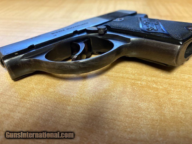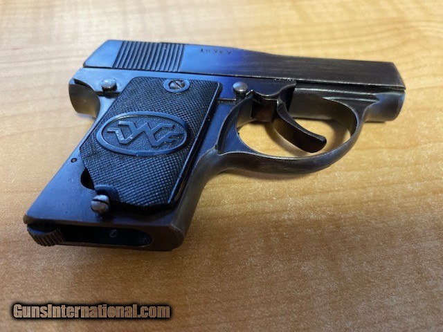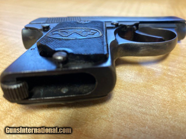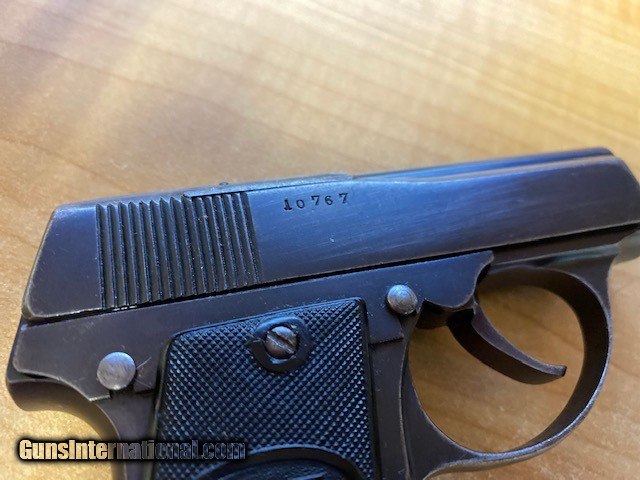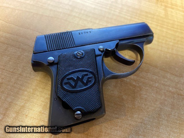 Description: "Little Tom", .25 ACP, pistol made by Wiener Waffenfabrik of Austria from 1914-1927, world's first production of double action pistols, rare and valuable collectors item, 85% overall condition, flush hammer, in working condition, missing magazine, cracked grip. Replacement of magazine and grip available from Triple K. Serial Number is 10767. For further information call John at 941-748-7318. SOLD Curio/Relic: Yes |