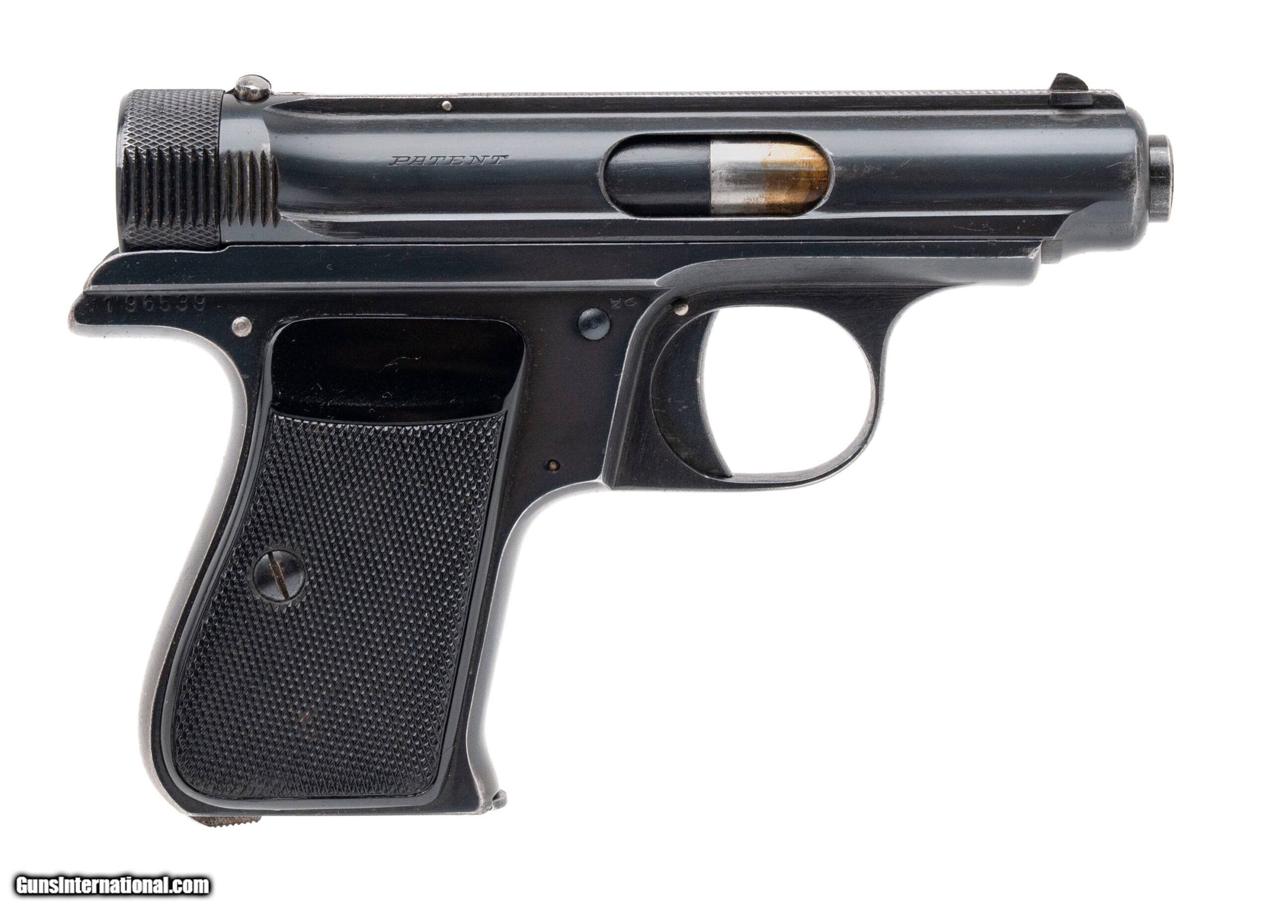 Description: "SN: 196539 made in Germany circa 1920’s. Small frame semi-auto 32 acp pistol with a 3" barrel, original plastic grips and original S&S marked magazine in very good overall condition with some light wear. Dallas Location Curio/Relic: Yes Price: $895.00 Contact Seller |