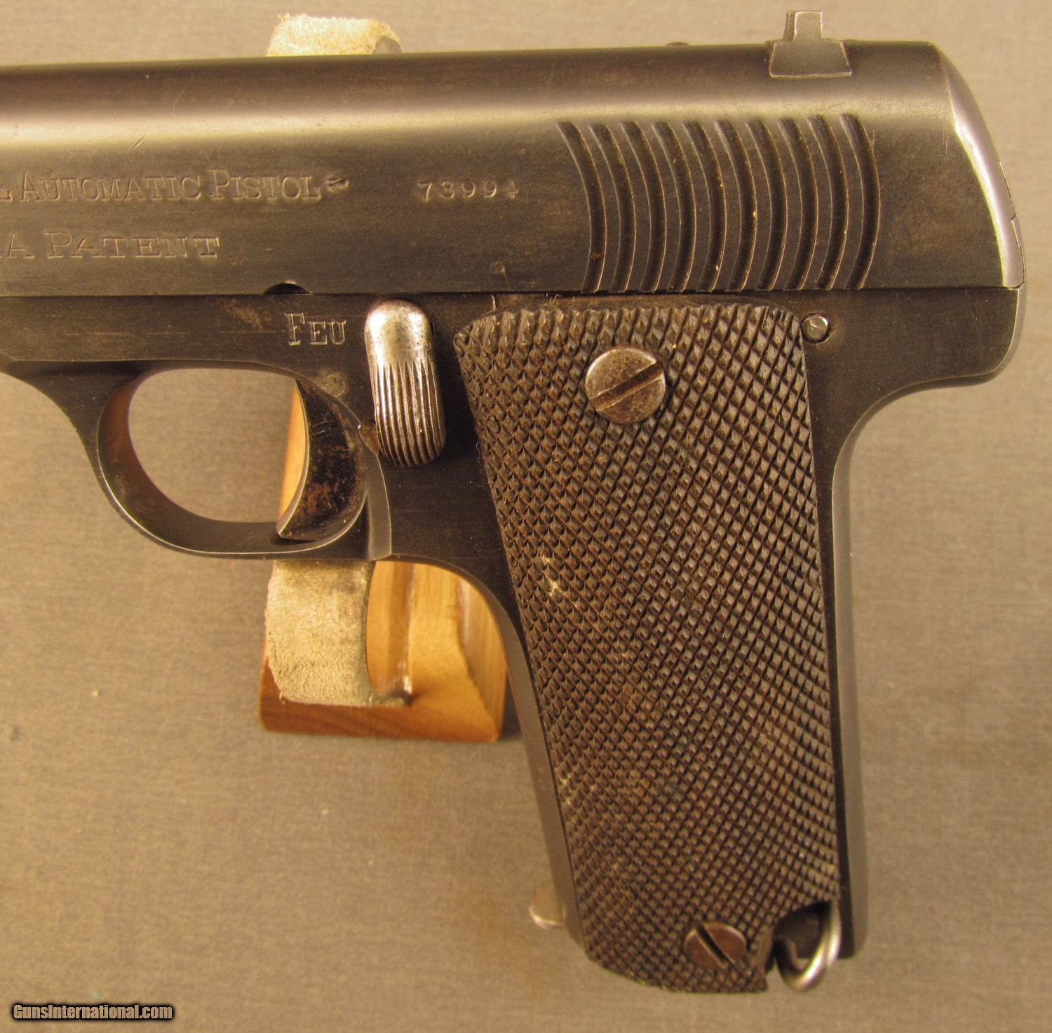 Description: Serial #73991, 7.65mm (.32 ACP), 3 1/2” barrel with a very good bore that has light-moderate frackling within the grooves. This “Ruby” style pistol retains 95-97% of the original blue finish with some trace silvering along a few of the high and projecting edges as well as some mild freckling at the muzzle. The trigger has about 50% of the original bright fire blue remaining with the balance turned speckled plum-brown. The checkered wooden grips are likewise in fine shape with only minor handling marks and flattening of the points. The pistol comes with a single magazine and is an excellent example. FFL or C&R SOLD Curio/Relic: Yes Manufacturer: Astra Model: 1916 Serial Number: 73991 Caliber Info: .32 ACP Gauge Info: .32 ACP |