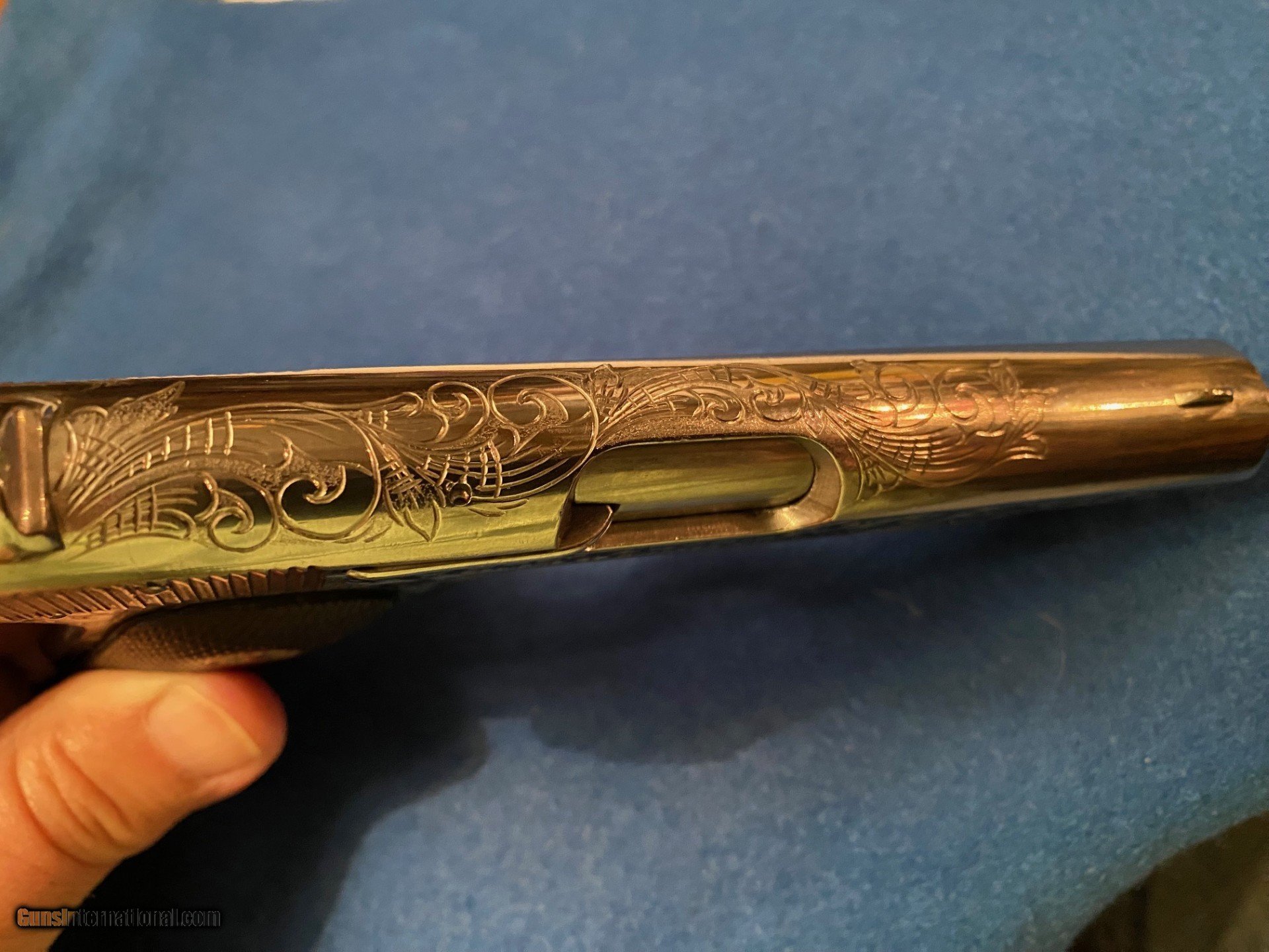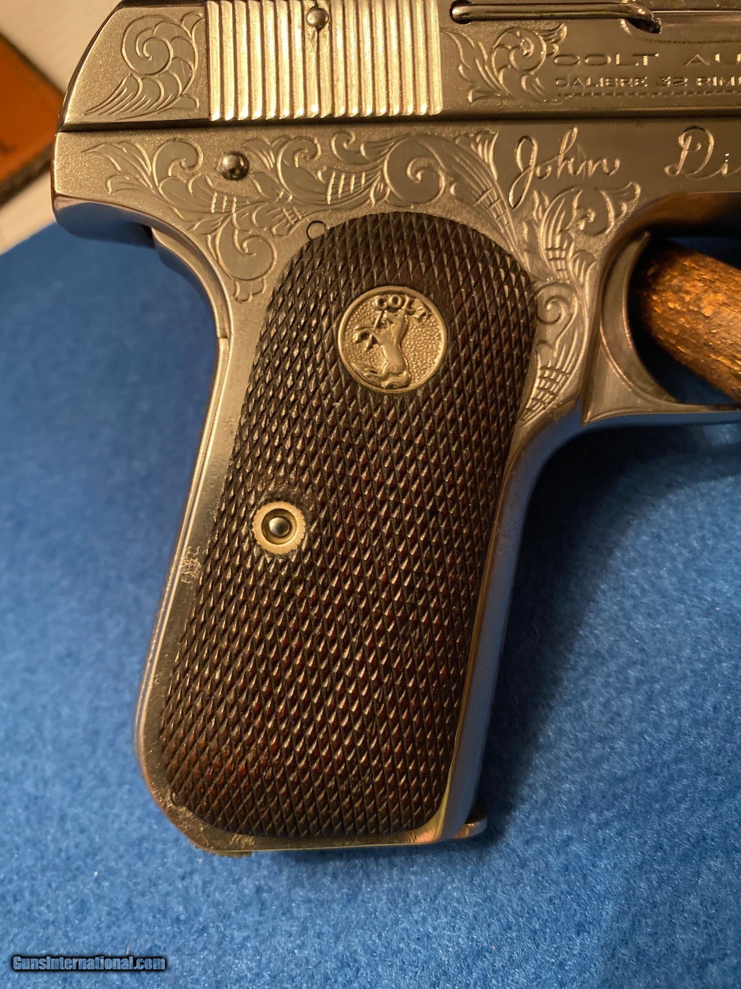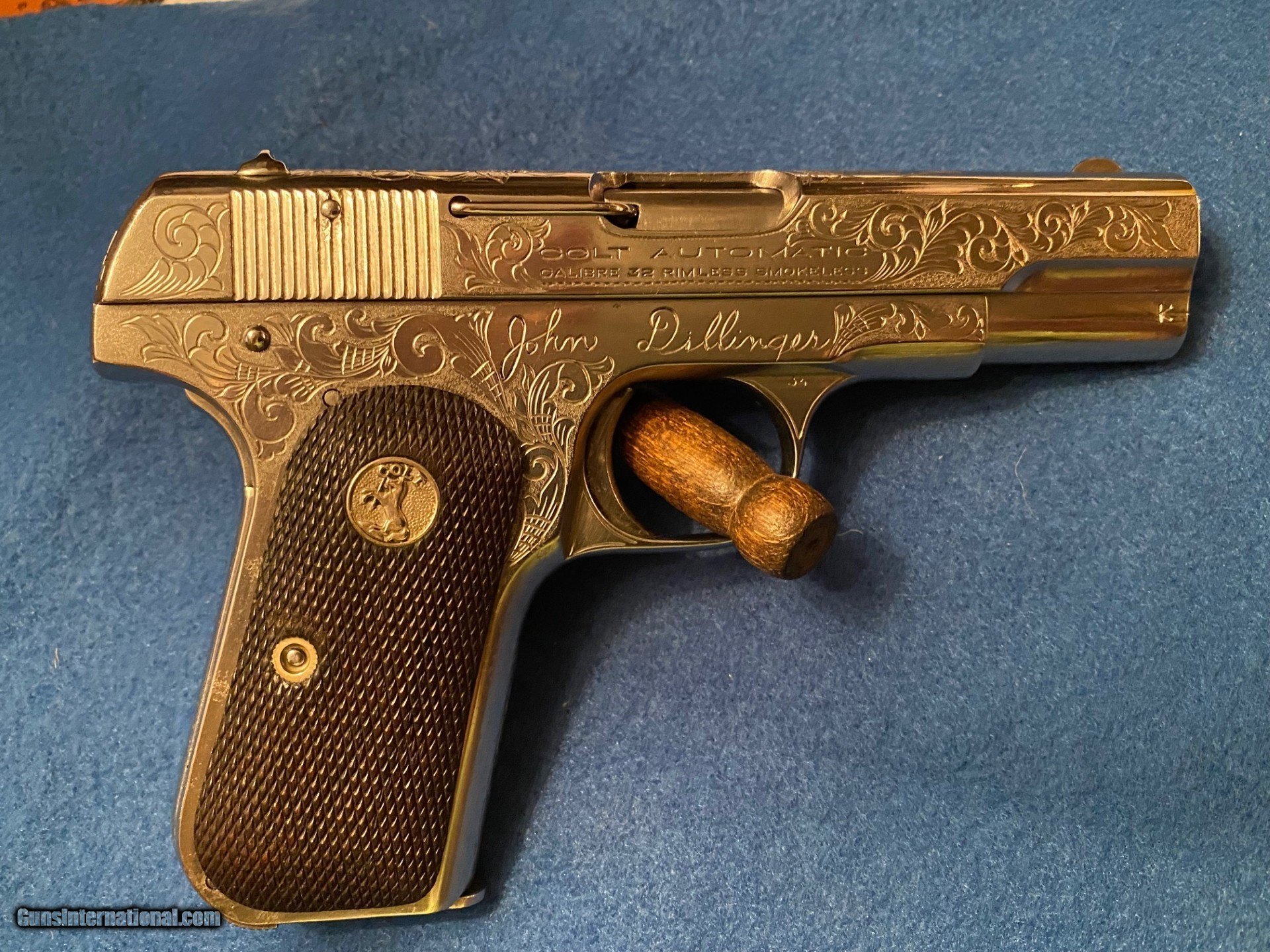 Description: Colt 1903 32.AUTO Pistol Engraved, This is a Engraved 1903 32 Auto Pistol. Looks like nickel but appears to be Super Highly polished original Colt metal that the engraver polished and then fully engraved .Engravers named Gene Consalvi of Nevada in the year 2000. His name is engraved under one grip. The Name John Dillinger , the famous Bank robber of the 1930s. Engraved on the right side. The piece is solid and in perfect working order. I have shot it a vew times and functioned flawlessly and is very accurate at 20 yards. It has a decent bore and is mechanically perfect. This piece was made in 1923. Correct magazine in the polished white. An attractive little Colt 32 auto .Ganster Gun. I need a FFL or C+R license to purchase. Call with any questions, Tom 612 859 5673 SOLD Curio/Relic: Yes |