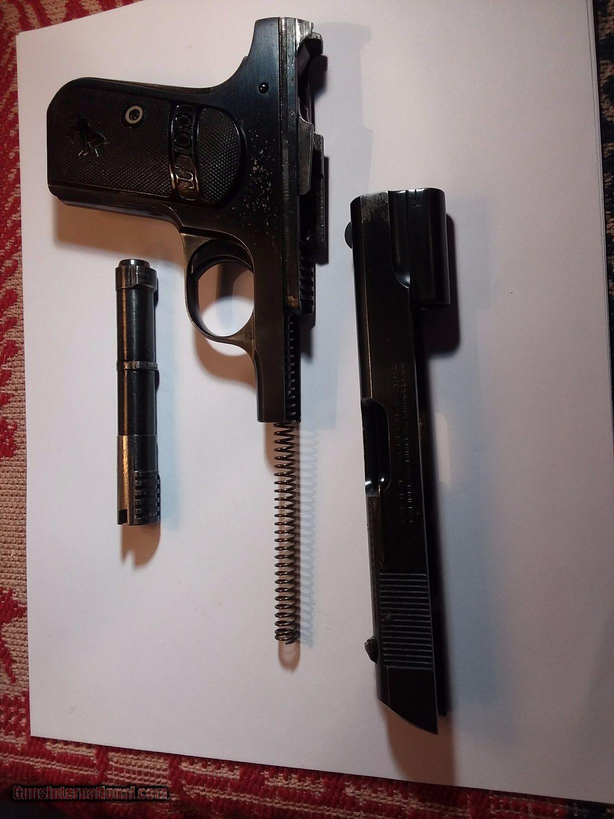 Description: For sale is a classic Colt 1903 .32 cal automatic . This was the high watermark of gun making , all machined parts made by true craftsman , no stampings and plastic like today .Gun has perfect bore and 95% bright blue .Serial # 363,44x , which puts it at 1920 production . This is a gun someone would own during the Prohibition period and up through WW2 . It is shown in movies of the 1920's , 30's and 40's or a series like Boardwalk Empire , Peaky Blinders, etc.There is some blue loss at muzzle end , right side of slide on the flat , [ see pictures ] It looks like the blue did not take or something removed blue as the metal is smooth and fine , no hint of pitting . There is also a little bit of freckling above the right grip panel , other wise the gun is in excellent shape and very little fired . Looks as never carried in a holster , little or no edge wear or muzzle wear besides what has been stated .Grip straps have all their bright blue , grips panels are excellent . Gun has early full blue, unmarked colt magazine, real colt clip in excellent condition . Must ship to FFL or C&R is okay . No shipments to California or NYC . Shipping cost $25 , Postal Money Order preferred , Certified Bank Check , PayPal if 3% is added to final price , which includes shipping cost. SOLD Curio/Relic: Yes |