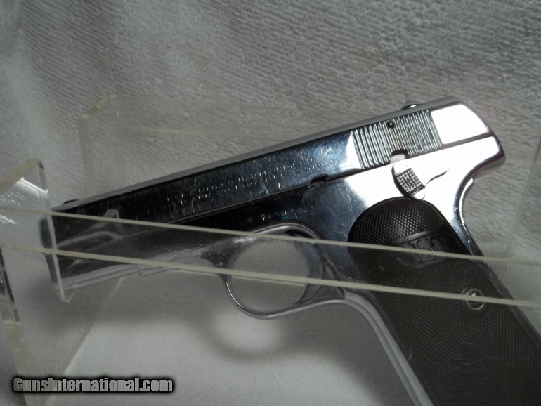 Description: This is a Colt 1903 Pocket Hammerless Pistol...Type III....32ACP...3 3/4" Barrel...Bright Bore....Nickel Finish(may have been re-silvered ?)..Slide and Frame have matching serial numbers...Weak strike on number "2" in serial number on frame...Hard Rubber Grips with Colt Logo...Correct Colt .32 cal Mag...Mfg. 1923...Very Good Condition...Personal Check or Money Order...Layaway Available...shipping $ 20.00 SOLD |